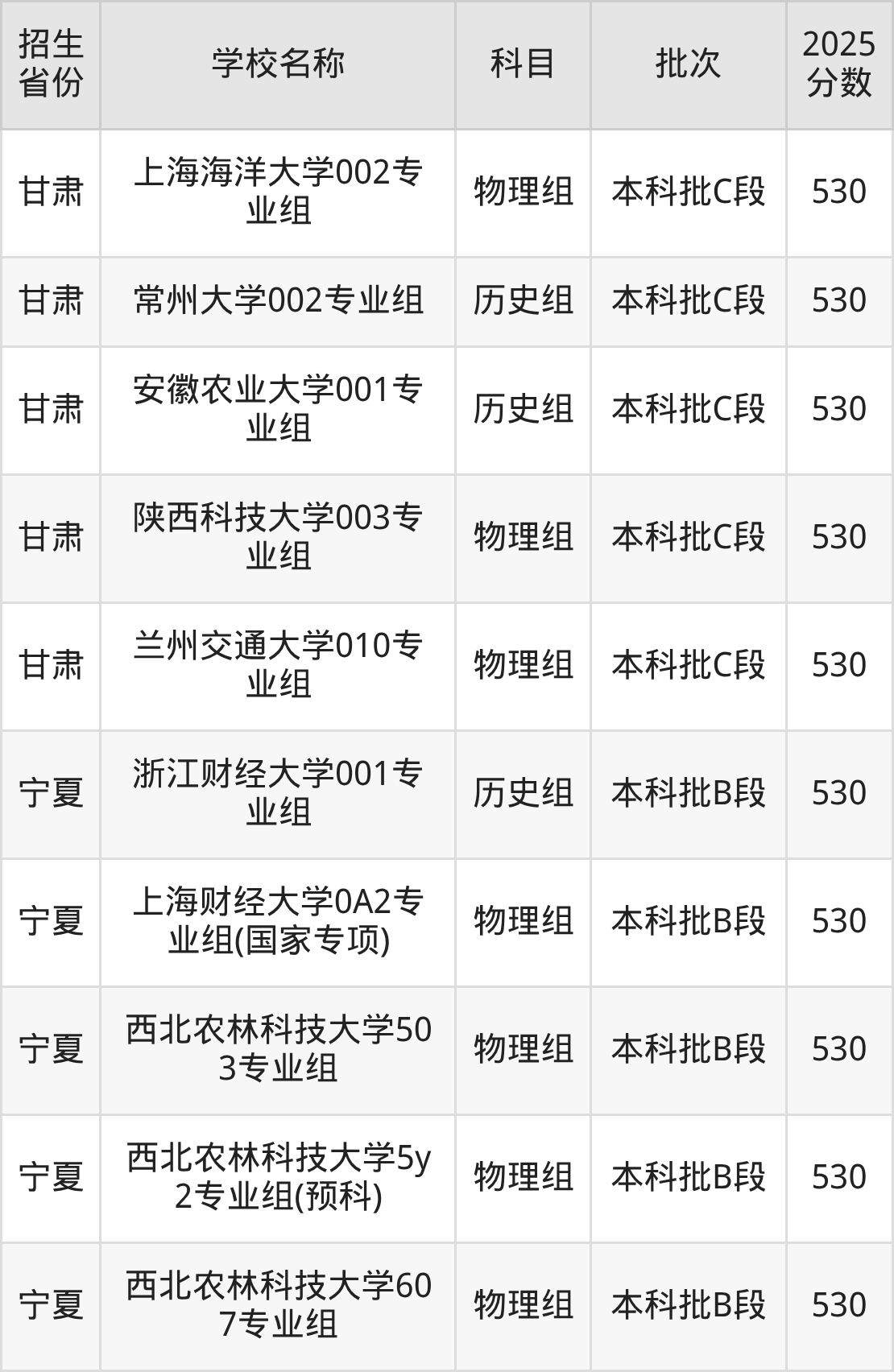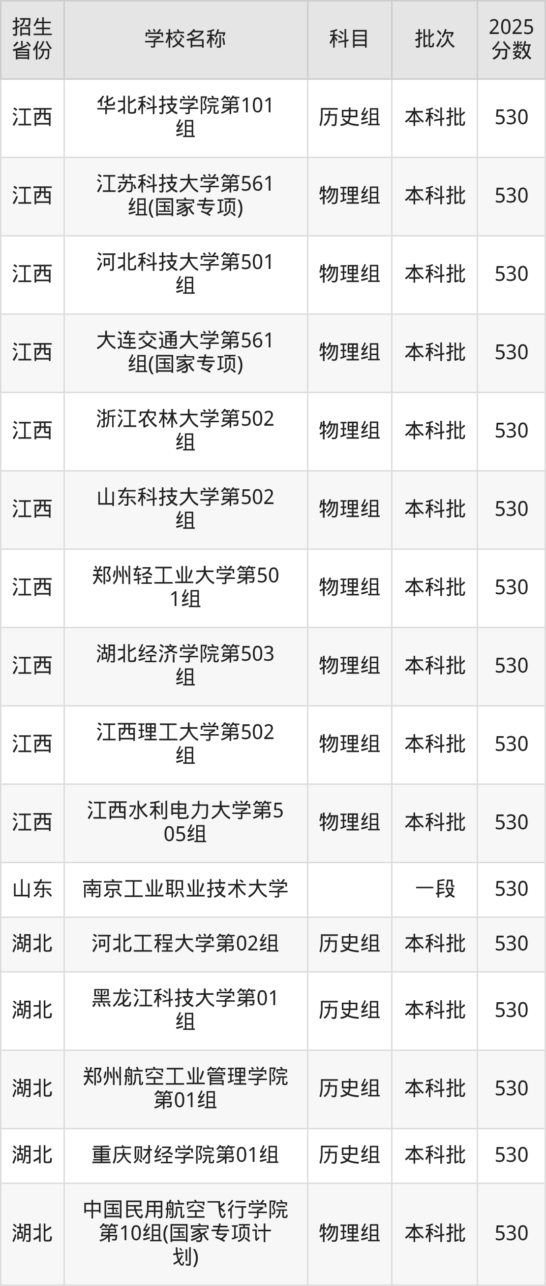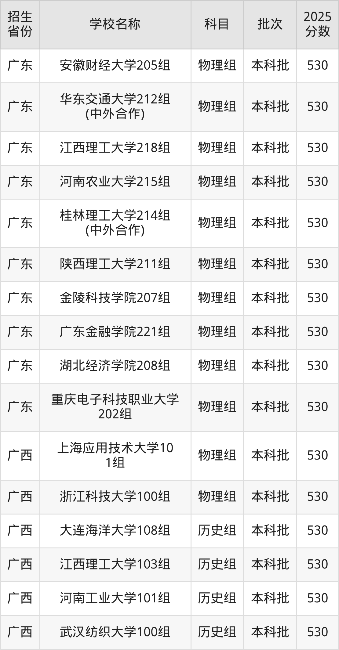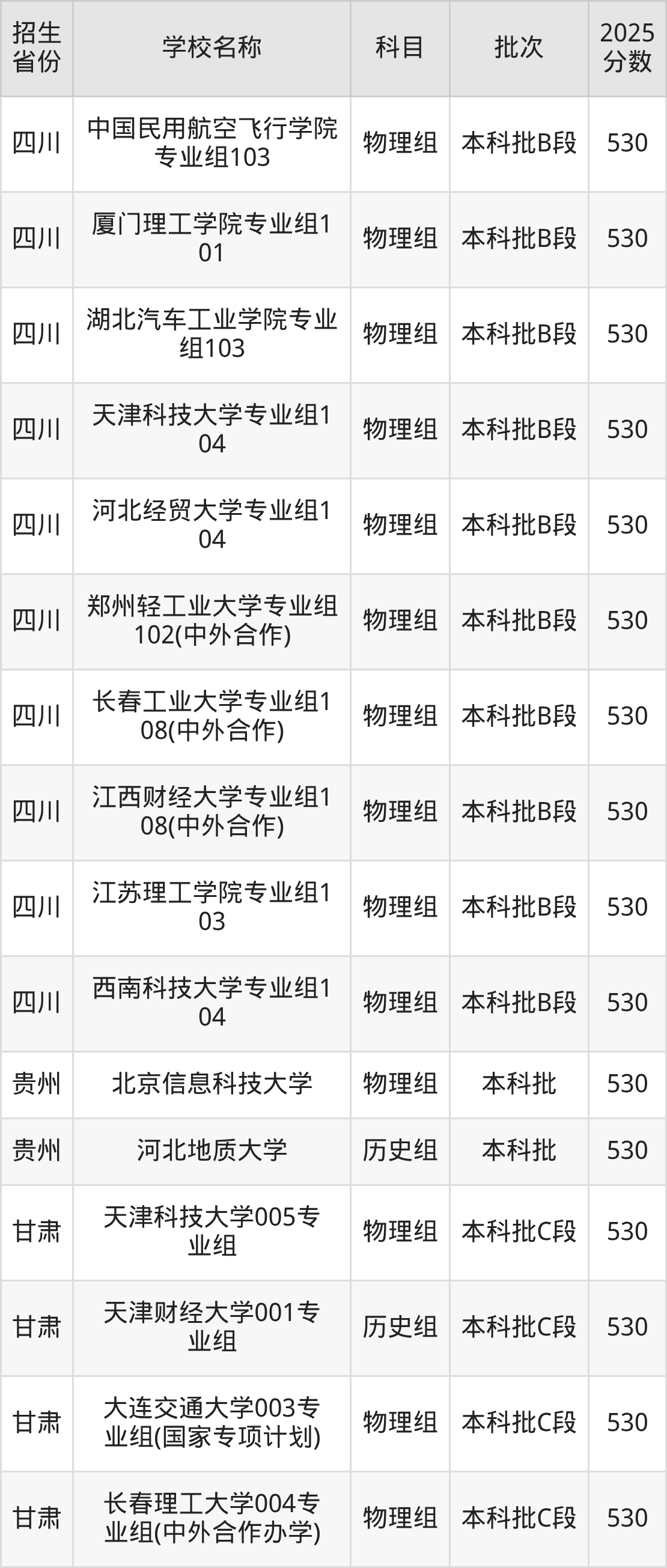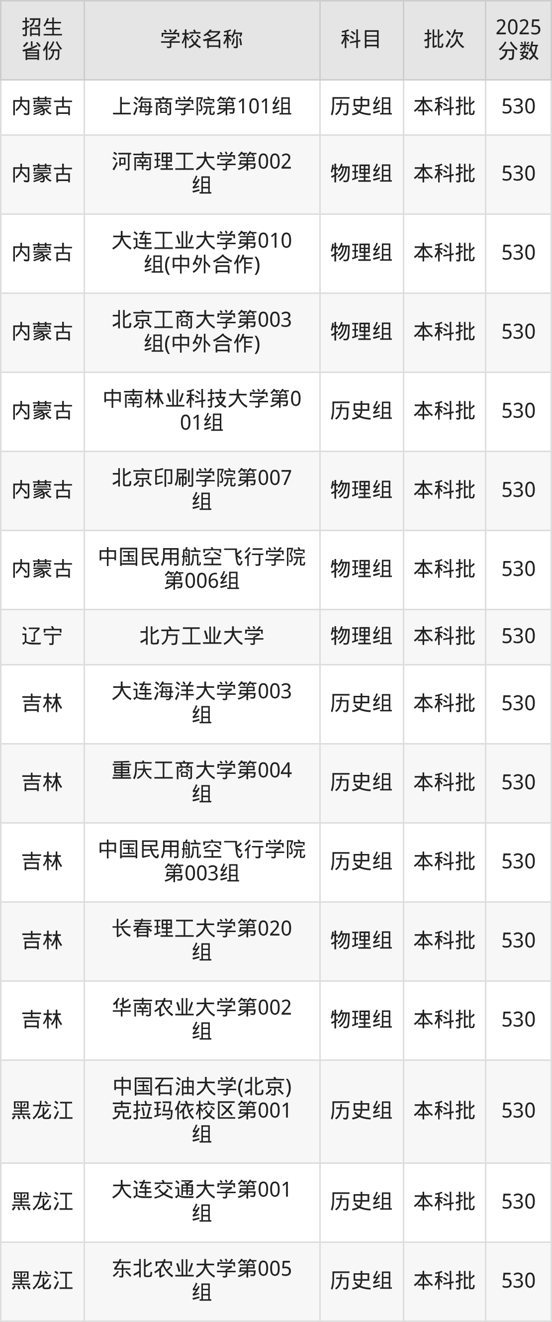 筛选全国各省2025年录取分数线为530分的理科大学如下: