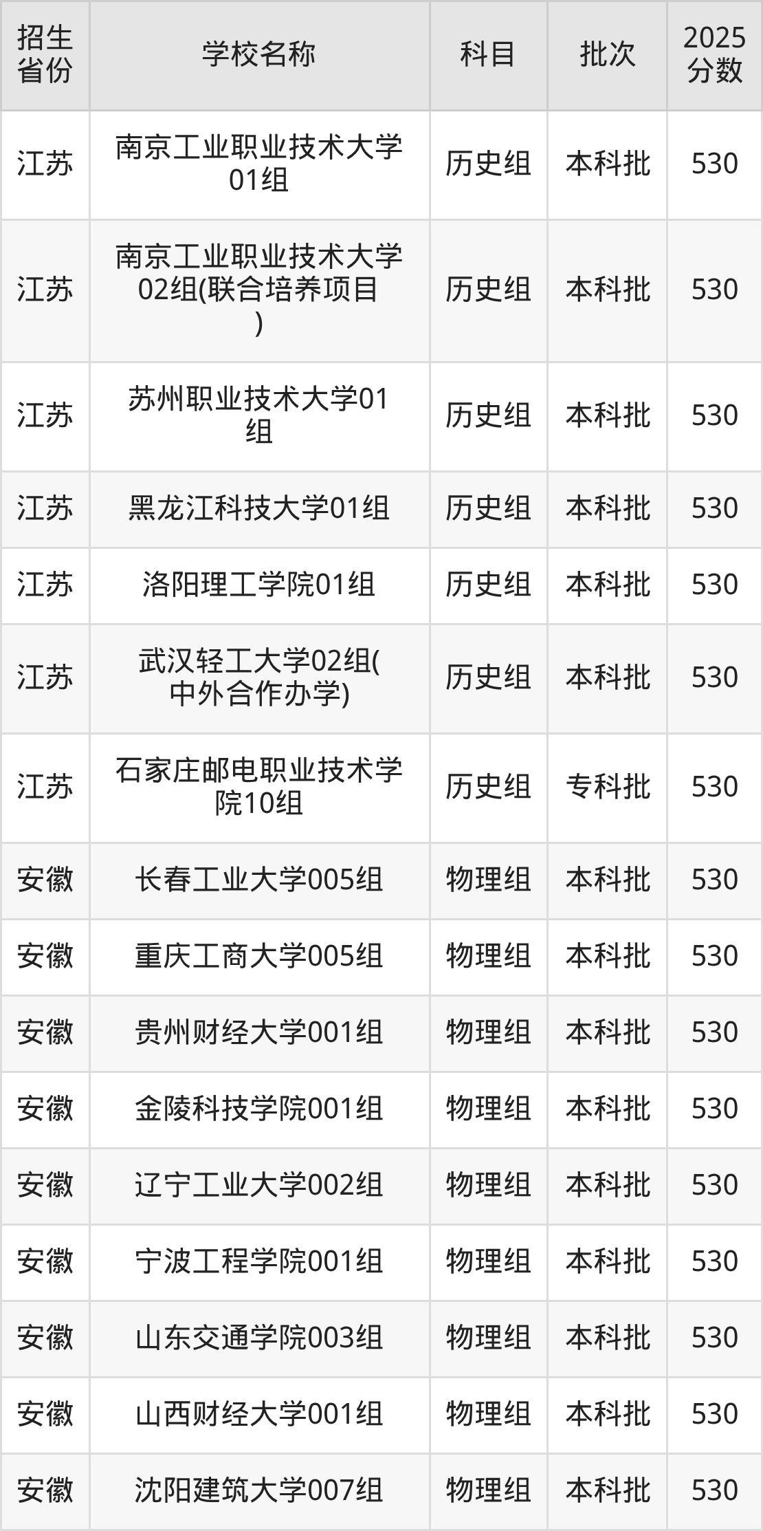 江苏省历史组分数线是530分的理科大学有:南京工业职业技术大学、苏州职业技术大学、黑龙江科技大学、洛阳理工学院、武汉轻工大学、石家庄邮电职业技术学院。