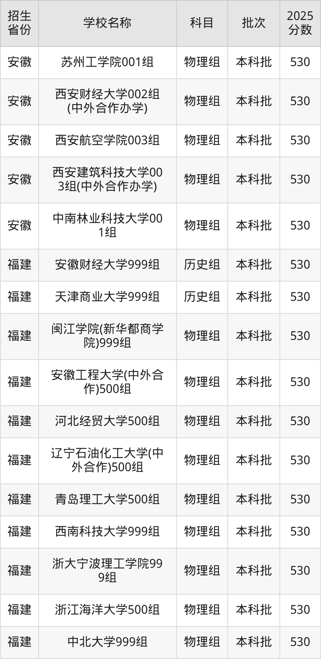 福建省历史组分数线是530分的理科大学有:安徽财经大学、天津商业大学。