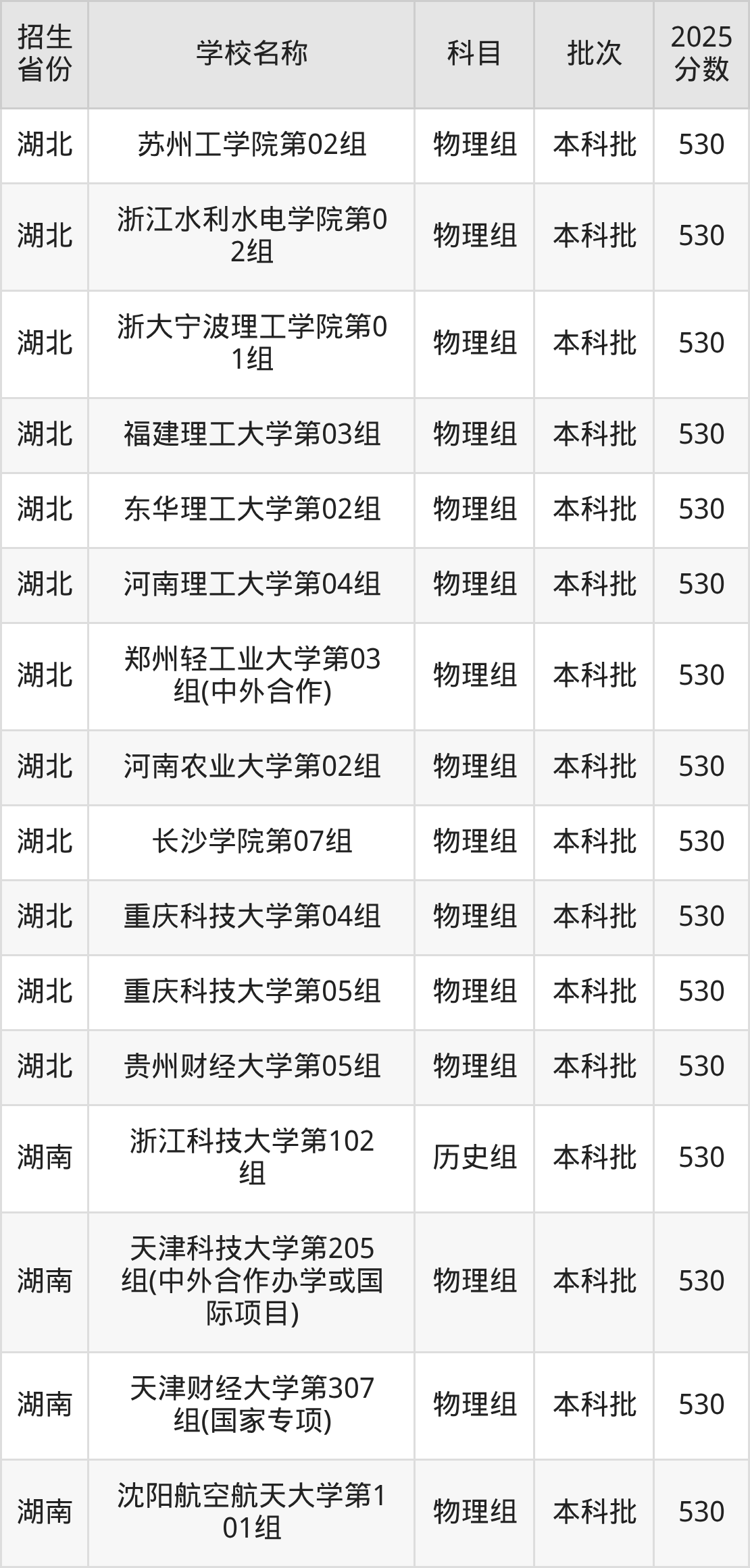 湖北省物理组分数线是530分的理科大学有:中国民用航空飞行学院、苏州工学院、浙江水利水电学院、浙大宁波理工学院、福建理工大学、东华理工大学、河南理工大学、郑州轻工业大学、河南农业大学、长沙学院。