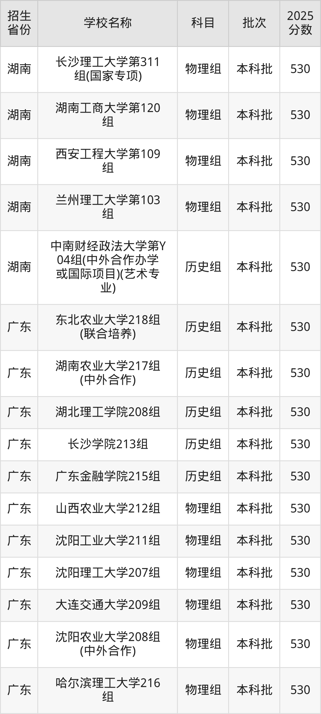 广东省历史组分数线是530分的理科大学有:东北农业大学、湖南农业大学、湖北理工学院、长沙学院、广东金融学院。