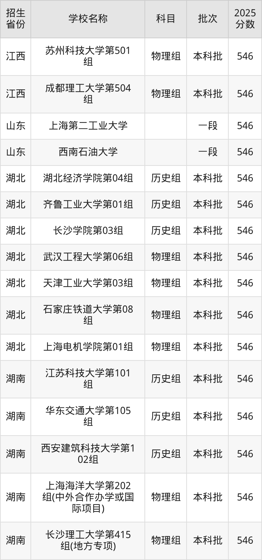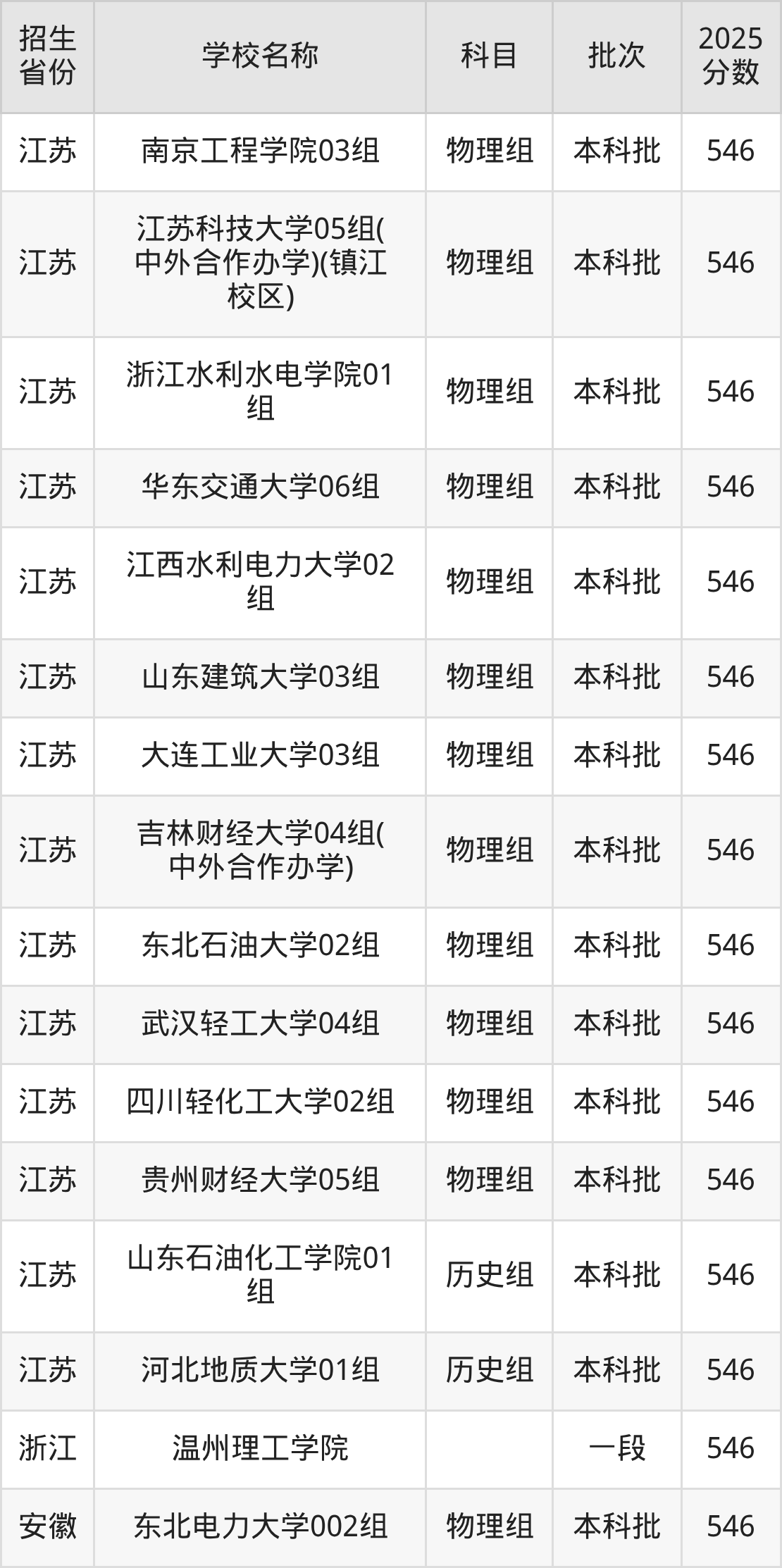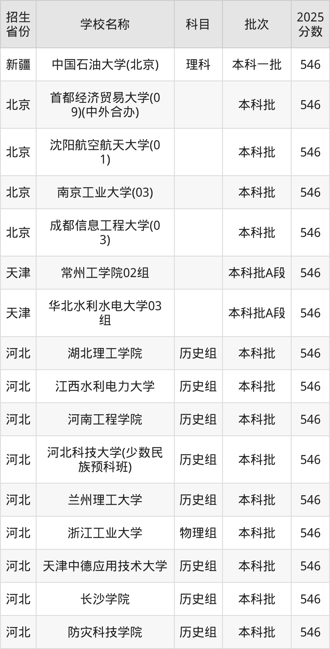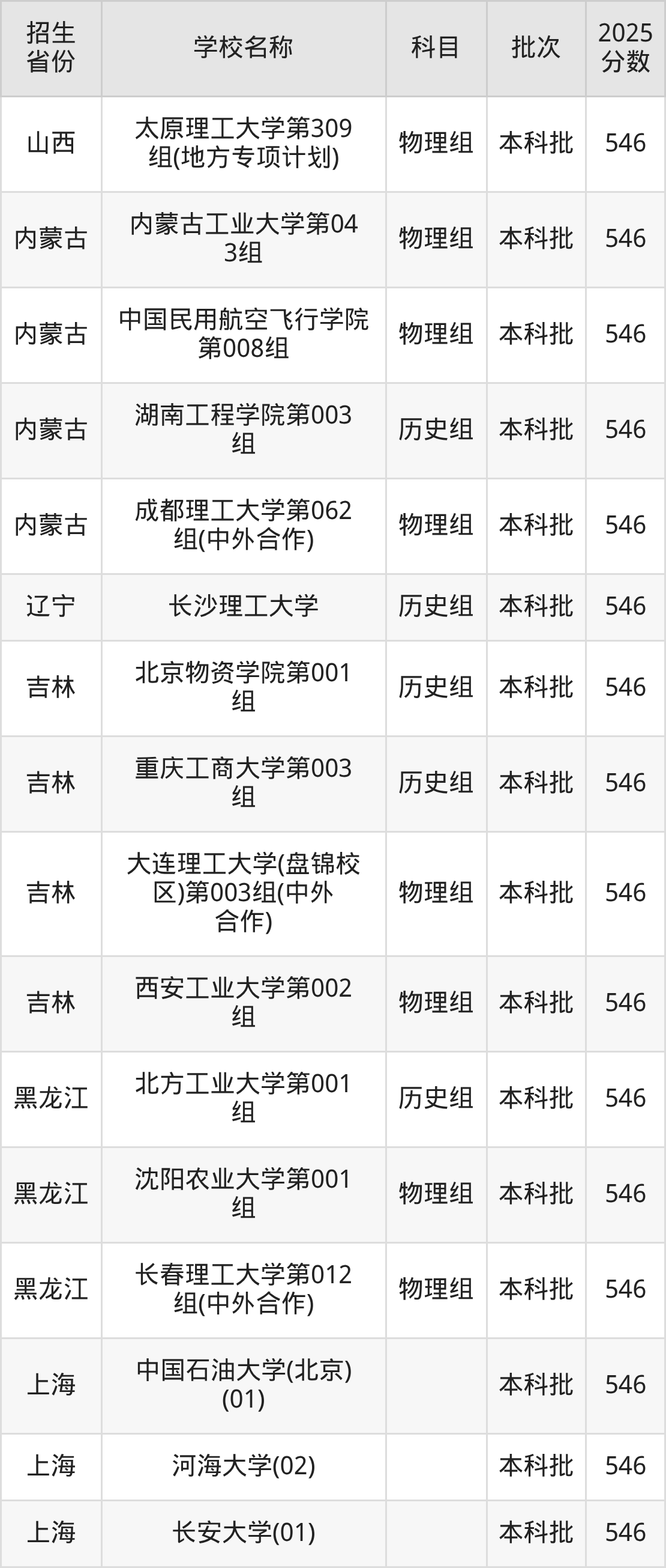 筛选全国各省2025年录取分数线为546分的理科大学如下: