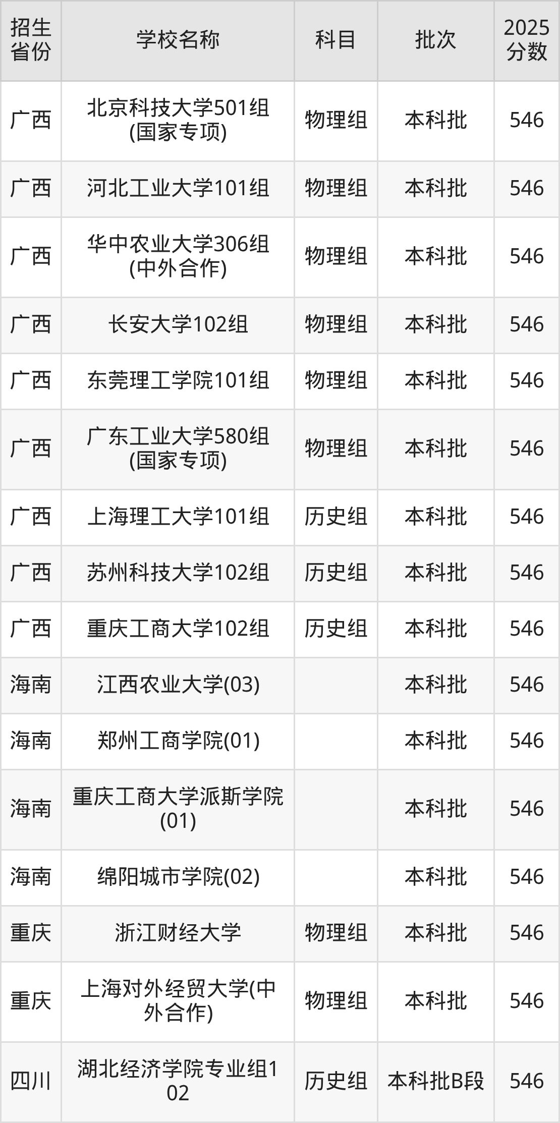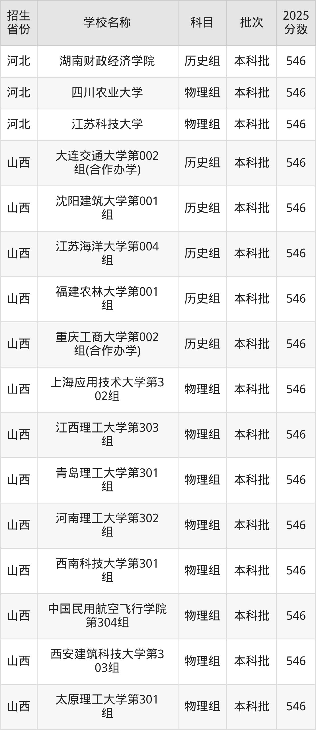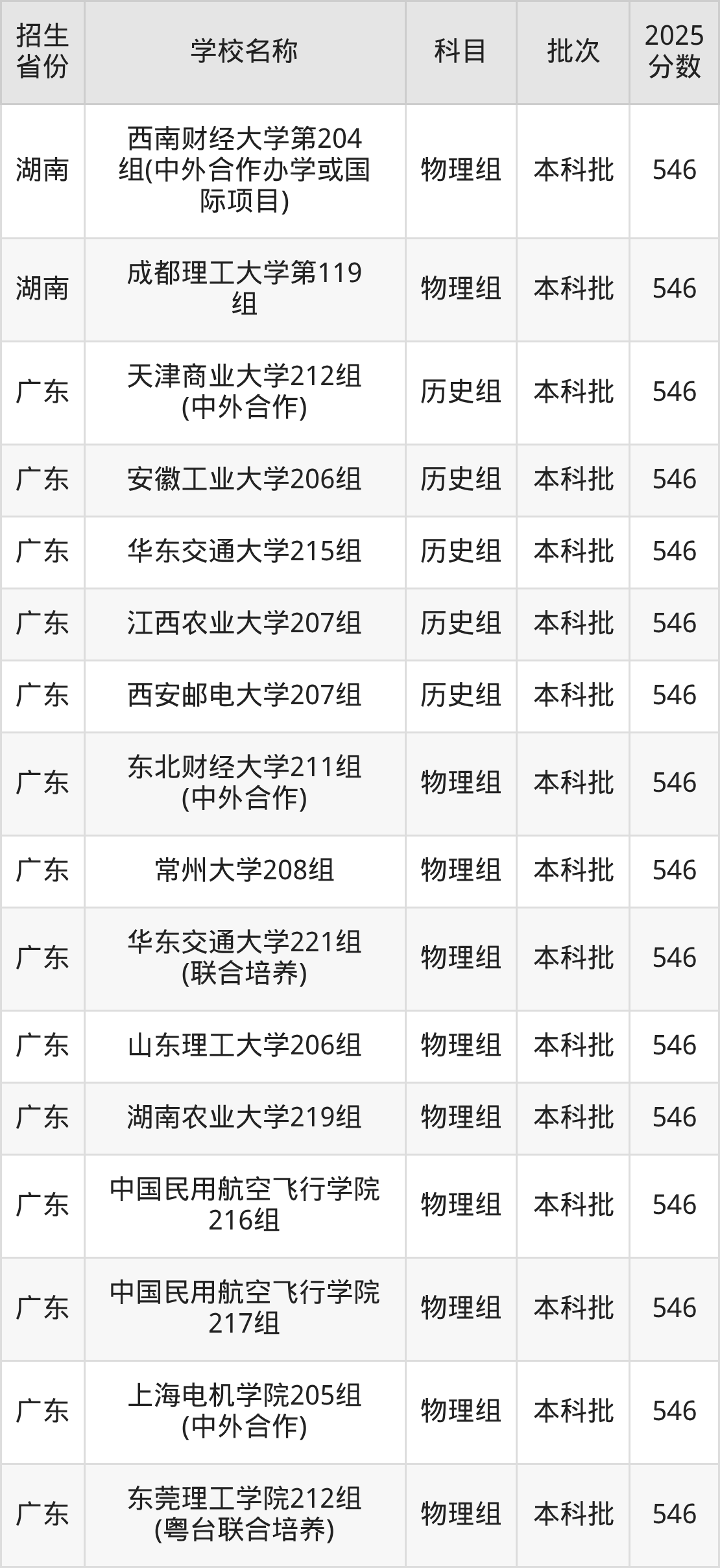 筛选全国各省2025年录取分数线为546分的理科大学如下: