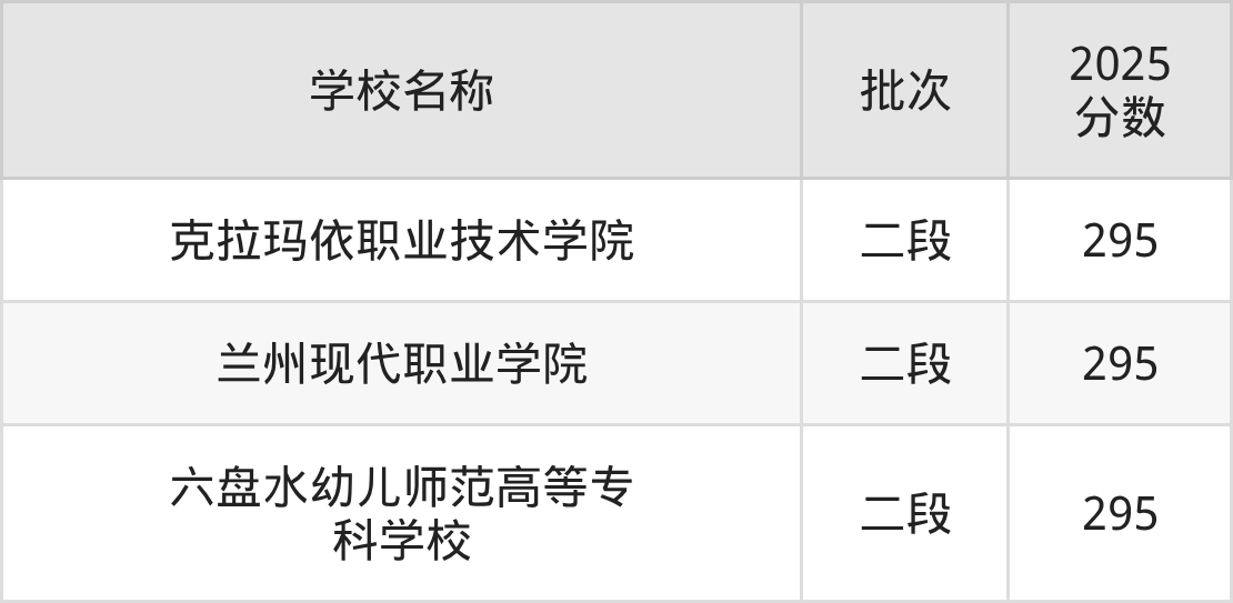 山东高考录取分数线在295分左右的公办大学一共有3所。分别是克拉玛依职业技术学院(295分)、兰州现代职业学院(295分)、六盘水幼儿师范高等专科学校(295分)