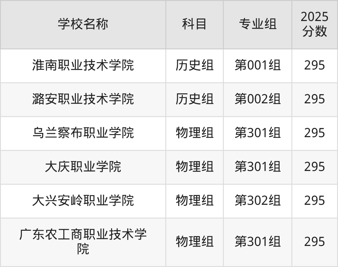 山西高考录取分数线在295分左右的公办院校专业组一共有6个,其中历史组有:淮南职业技术学院(295分)、潞安职业技术学院(295分),物理组有:乌兰察布职业学院(295分)、大庆职业学院(295分)、大兴安岭职业学院(295分)。