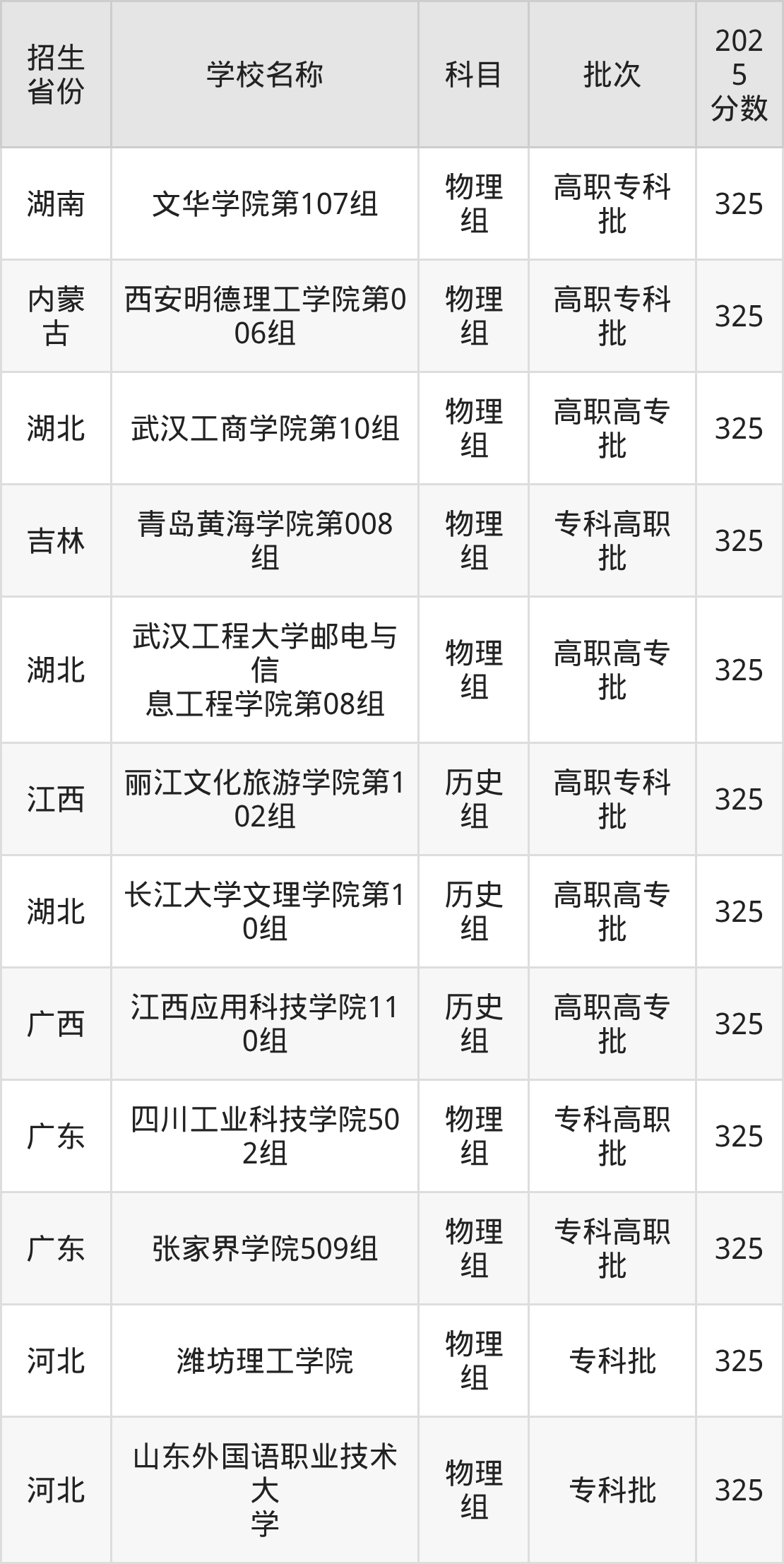 湖北省物理组分数线是325分的二本民办大学有:武汉工商学院、武汉工程大学邮电与信息工程学院。