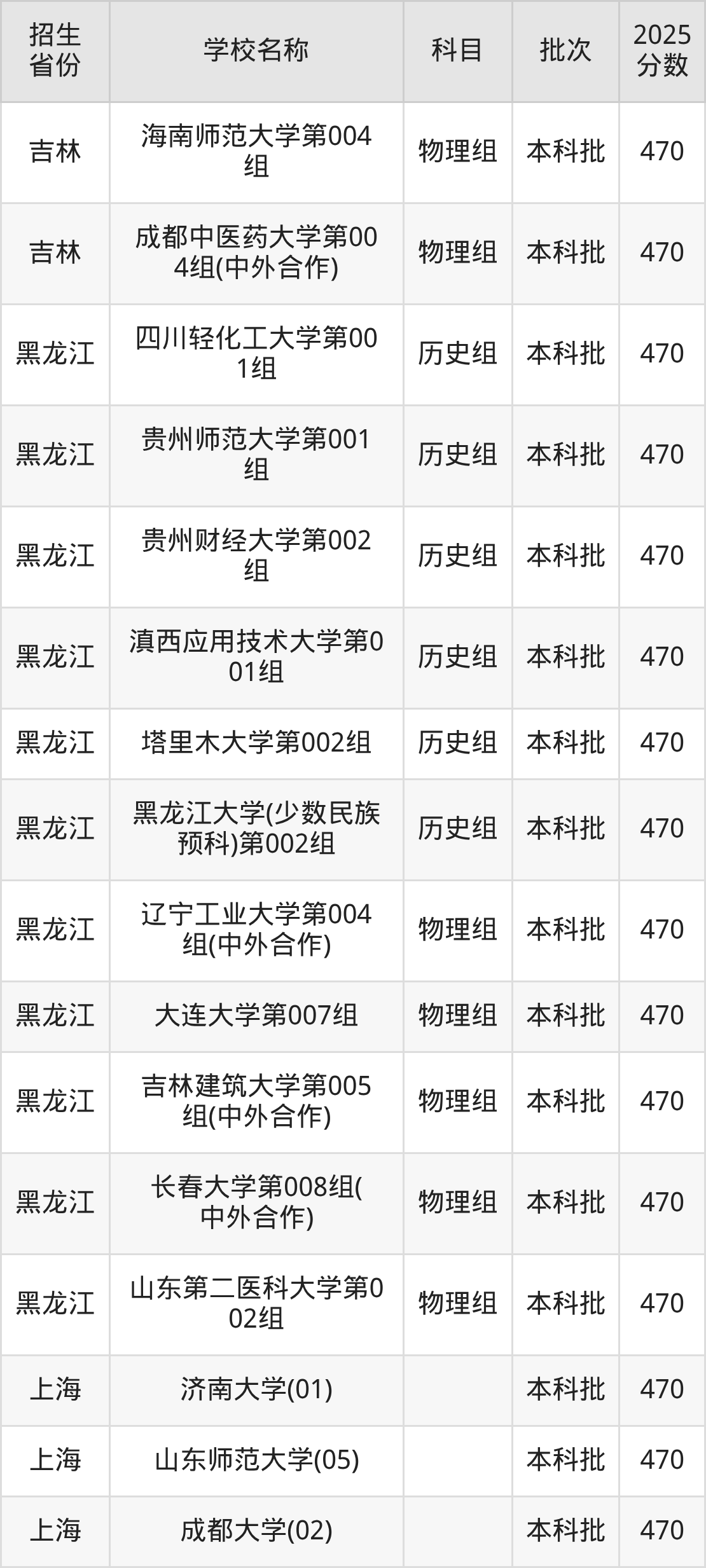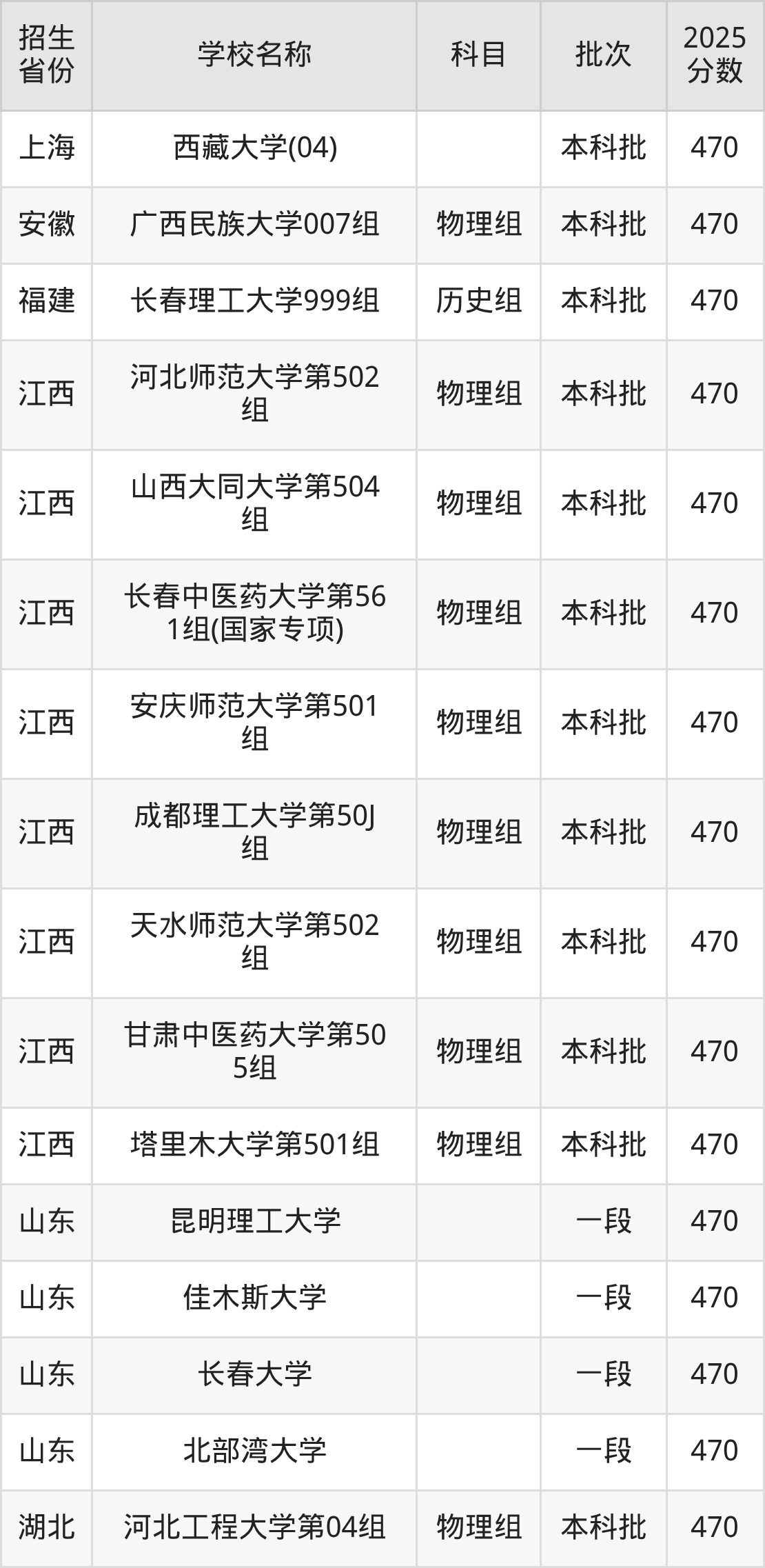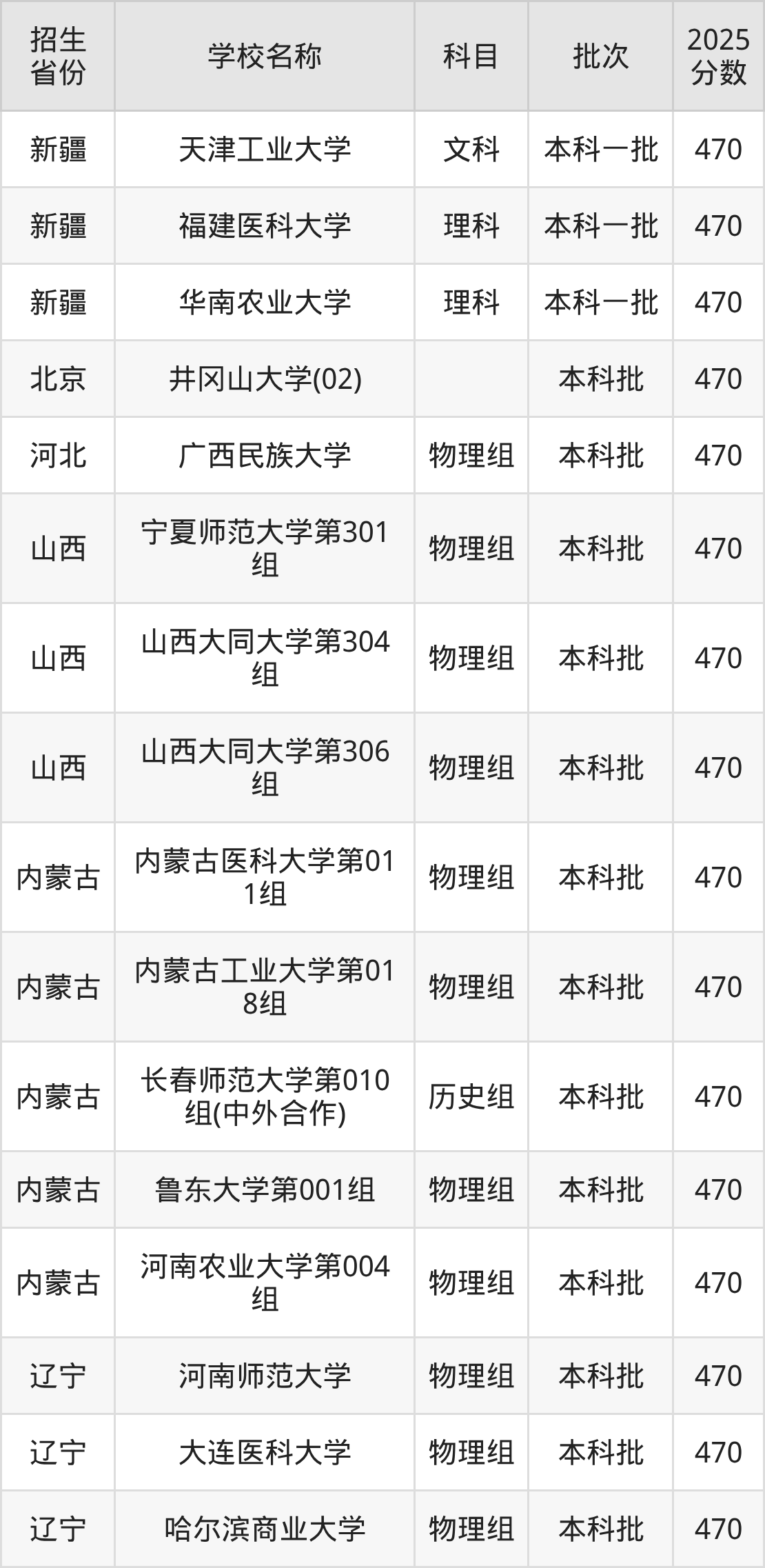 筛选全国各省2025年录取分数线为470分的一本大学如下: