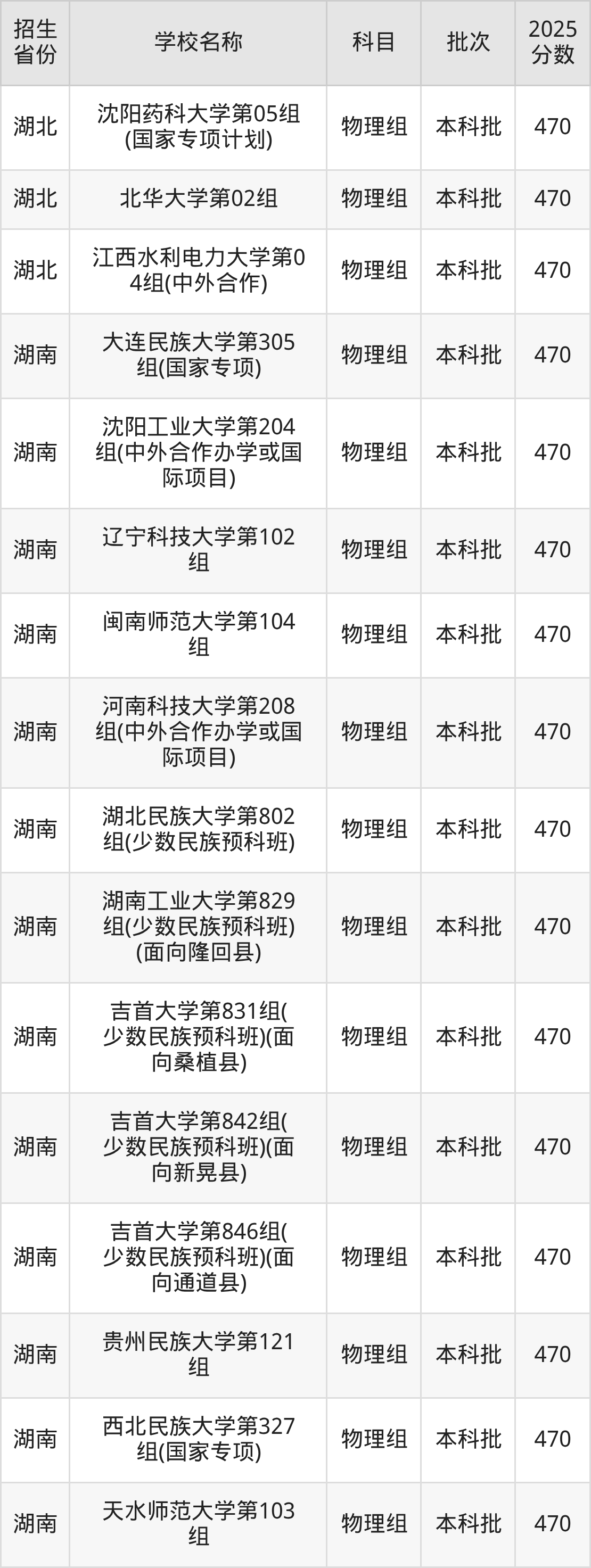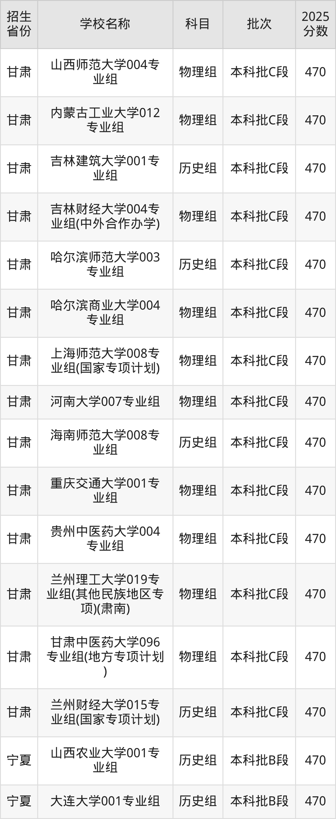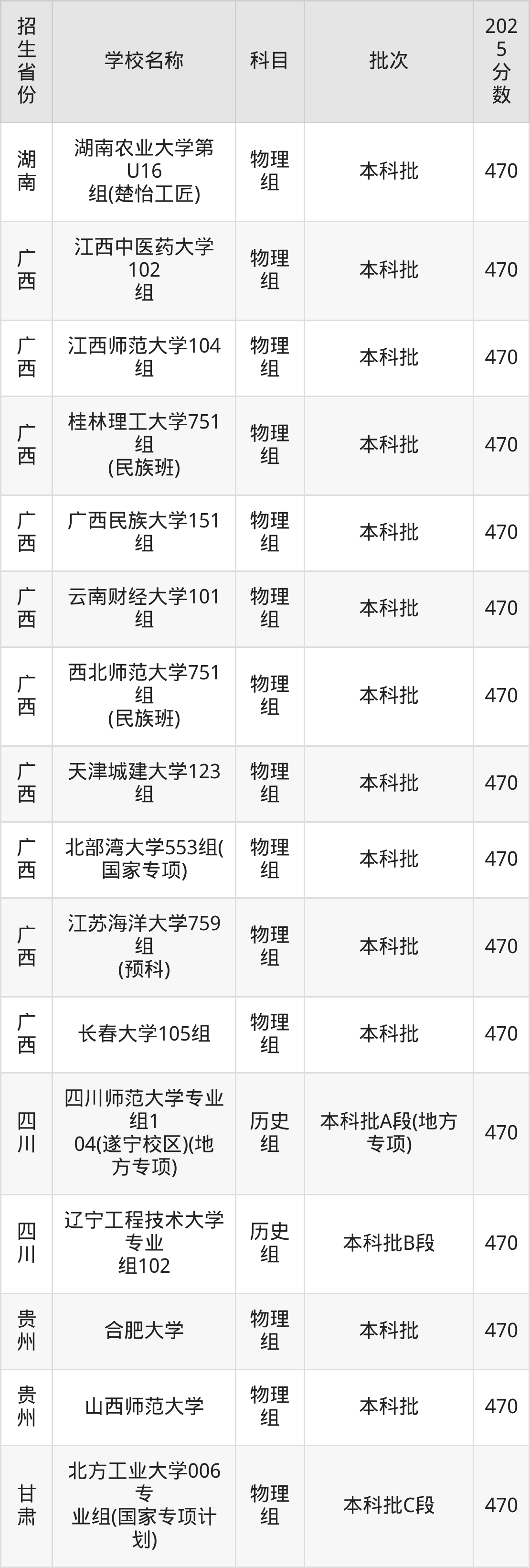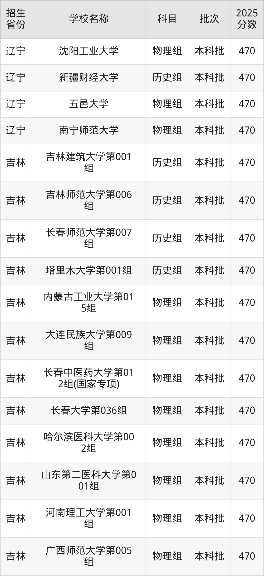 筛选全国各省2025年录取分数线为470分的一本大学如下: