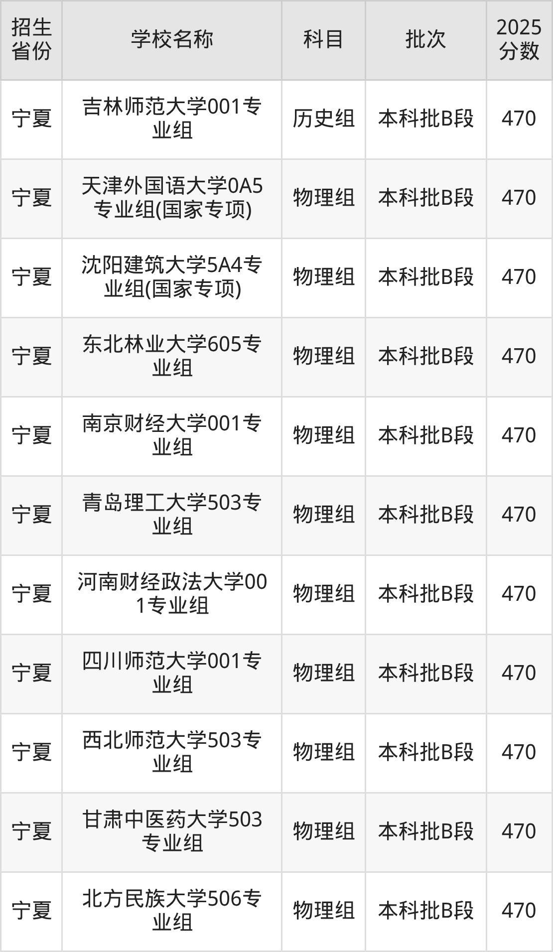 宁夏回族自治区物理组分数线是470分的一本大学有:天津外国语大学、沈阳建筑大学、东北林业大学、南京财经大学、青岛理工大学、河南财经政法大学、四川师范大学、西北师范大学、甘肃中医药大学、北方民族大学。