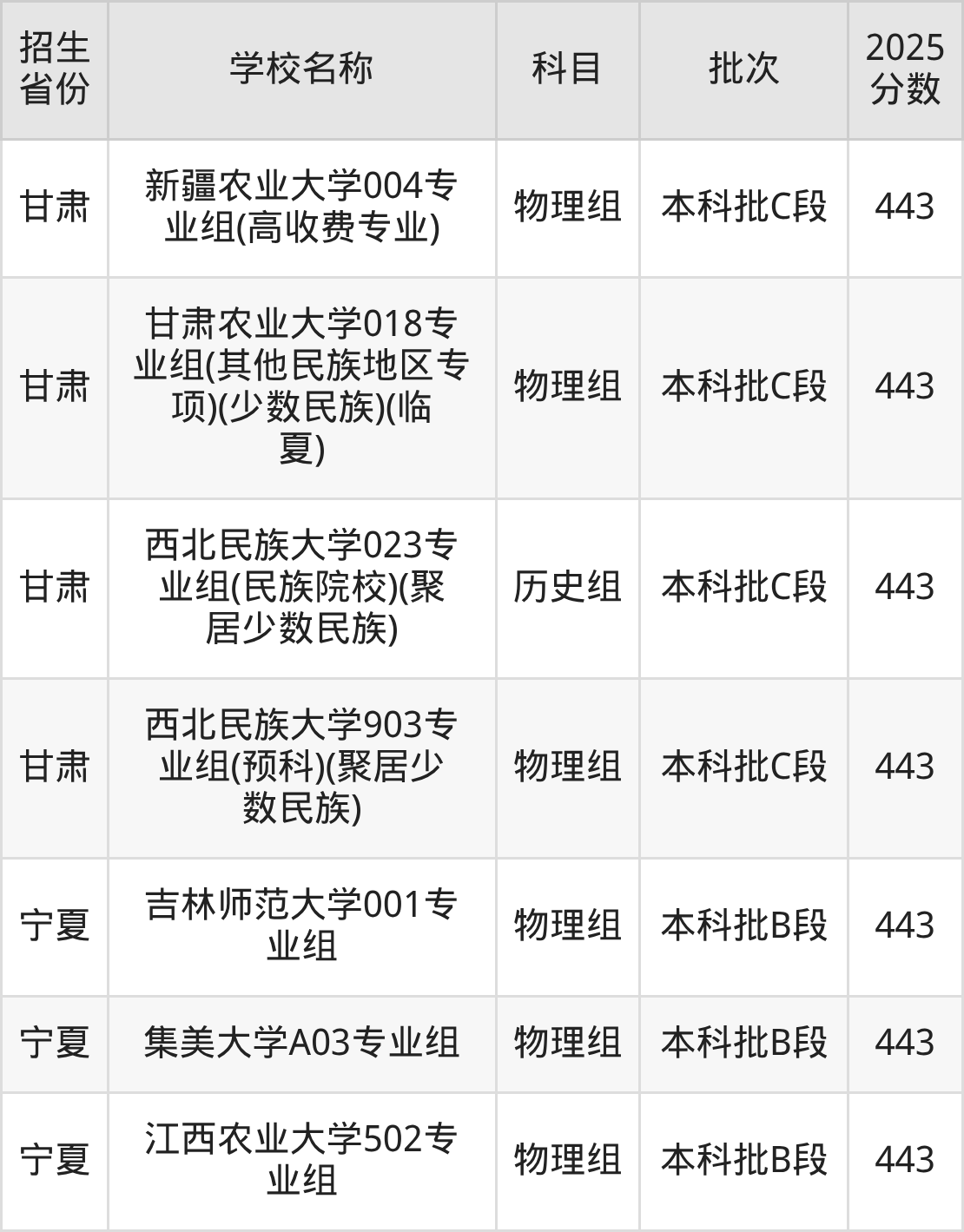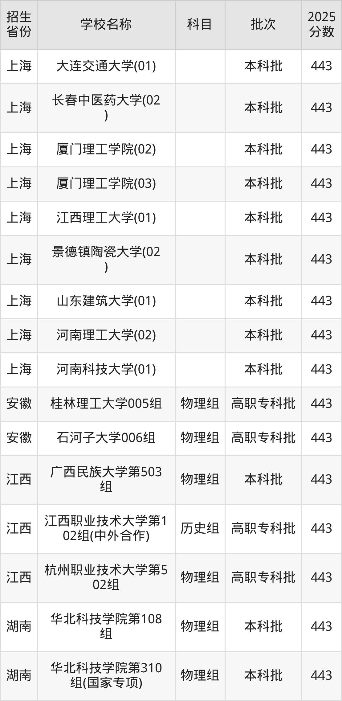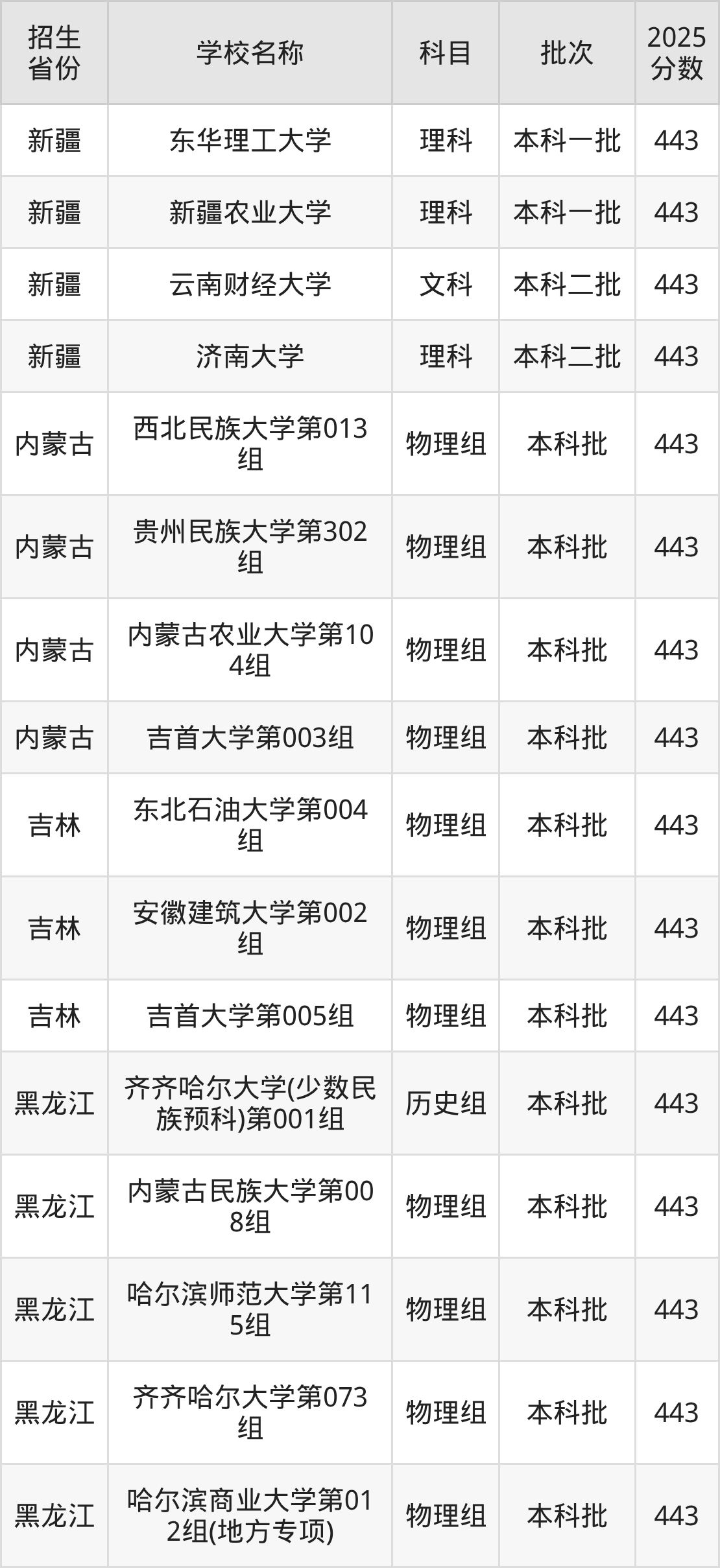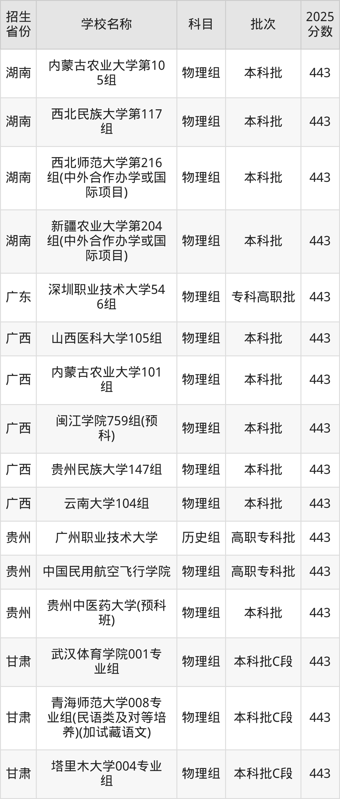筛选全国各省2025年录取分数线为443分的重点大学如下: