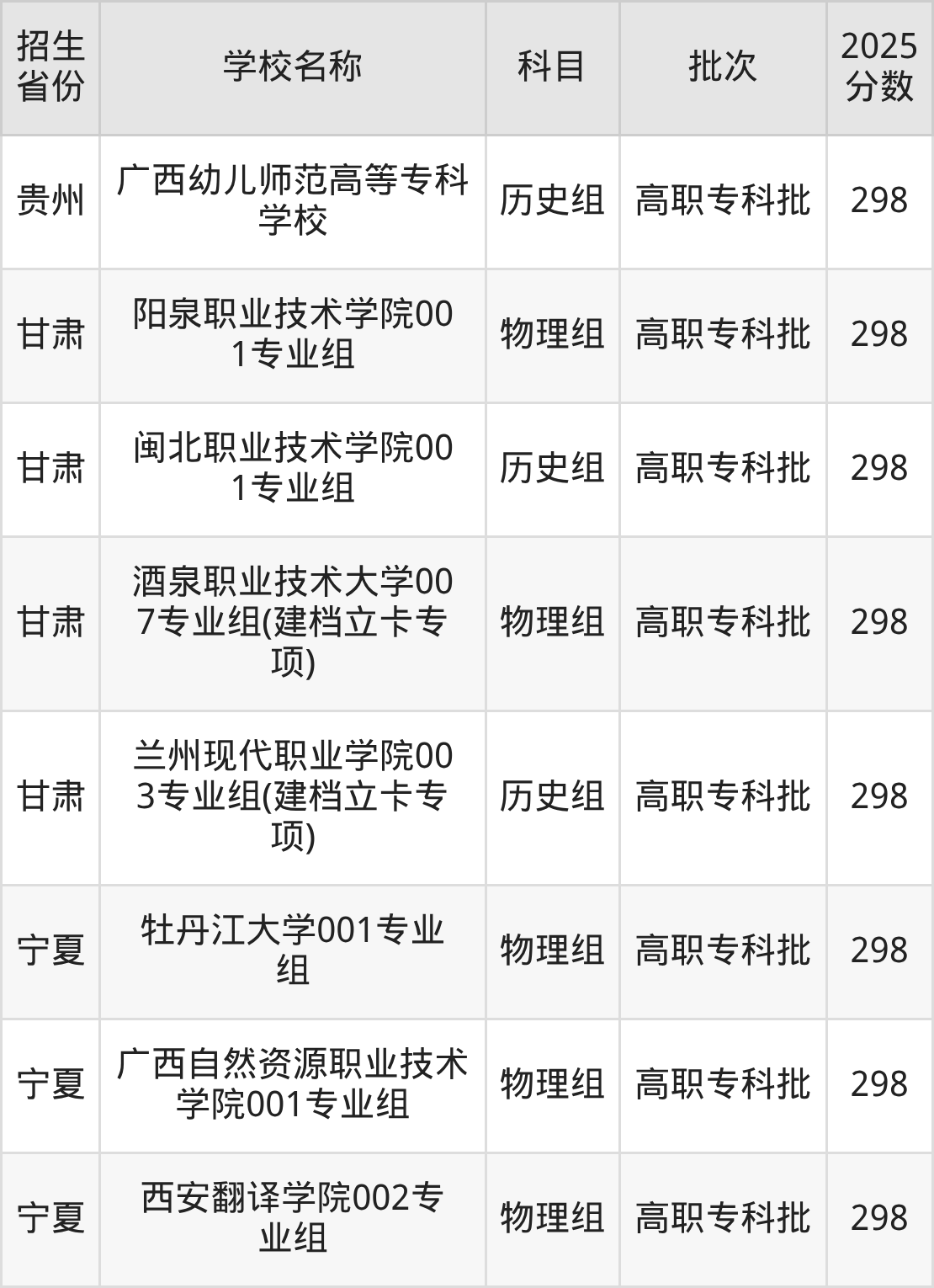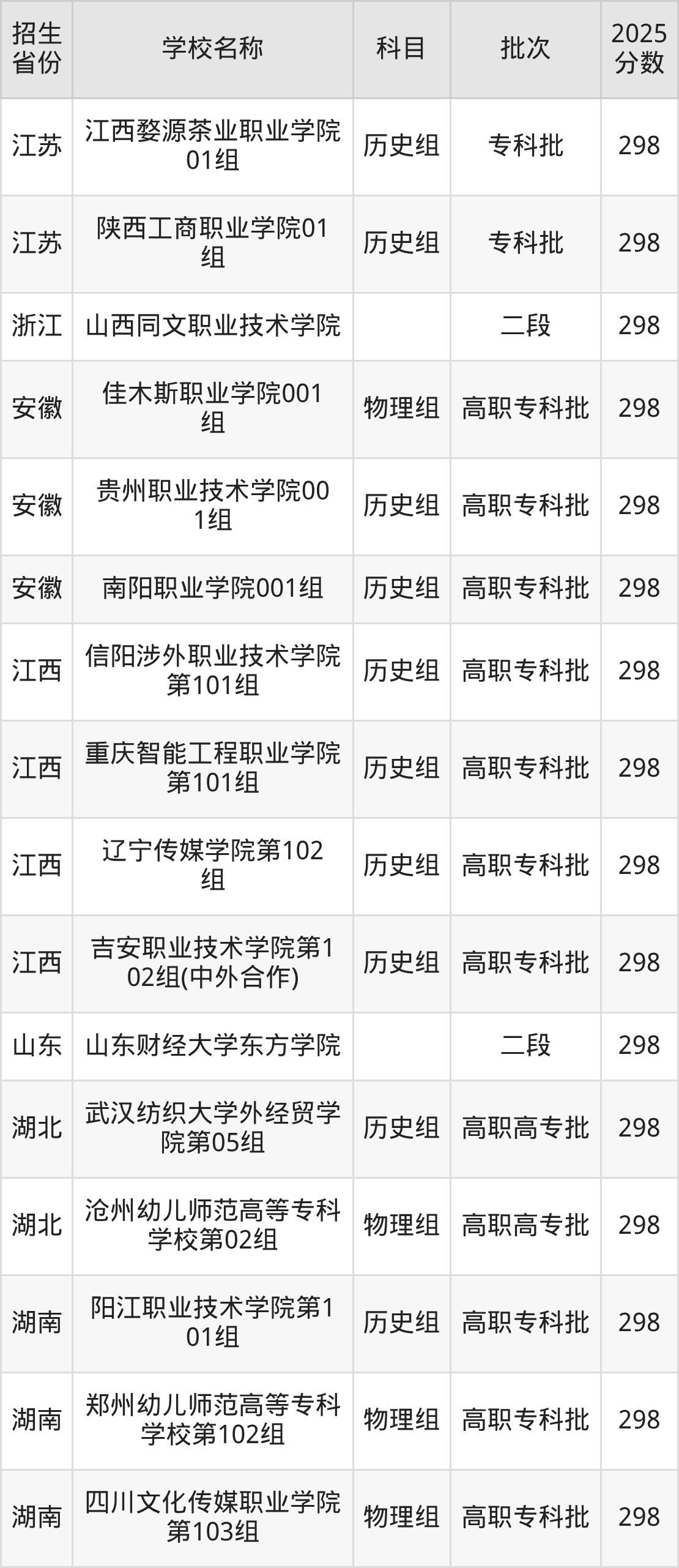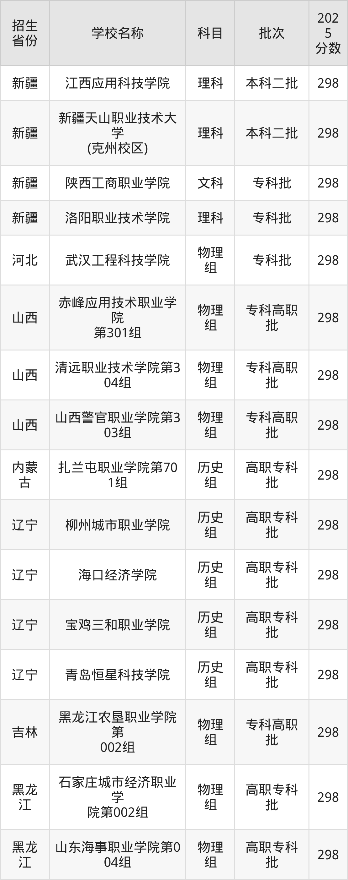 筛选全国各省2025年录取分数线为298分的文科大学如下: