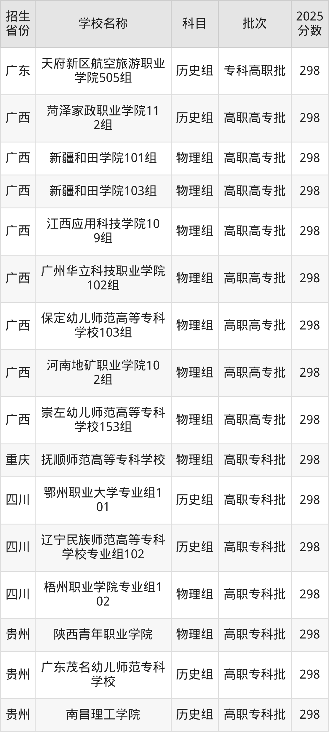 广西壮族自治区物理组分数线是298分的文科大学有:新疆和田学院、江西应用科技学院、广州华立科技职业学院、保定幼儿师范高等专科学校、河南地矿职业学院、崇左幼儿师范高等专科学校。