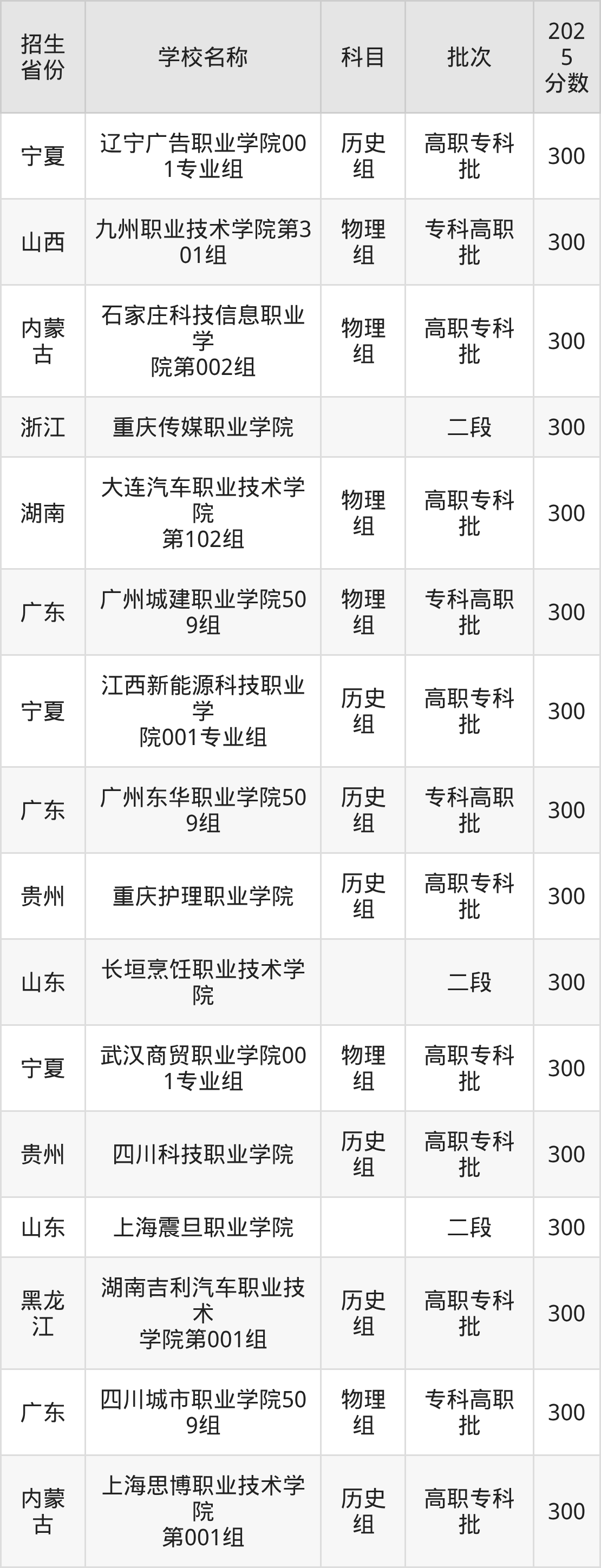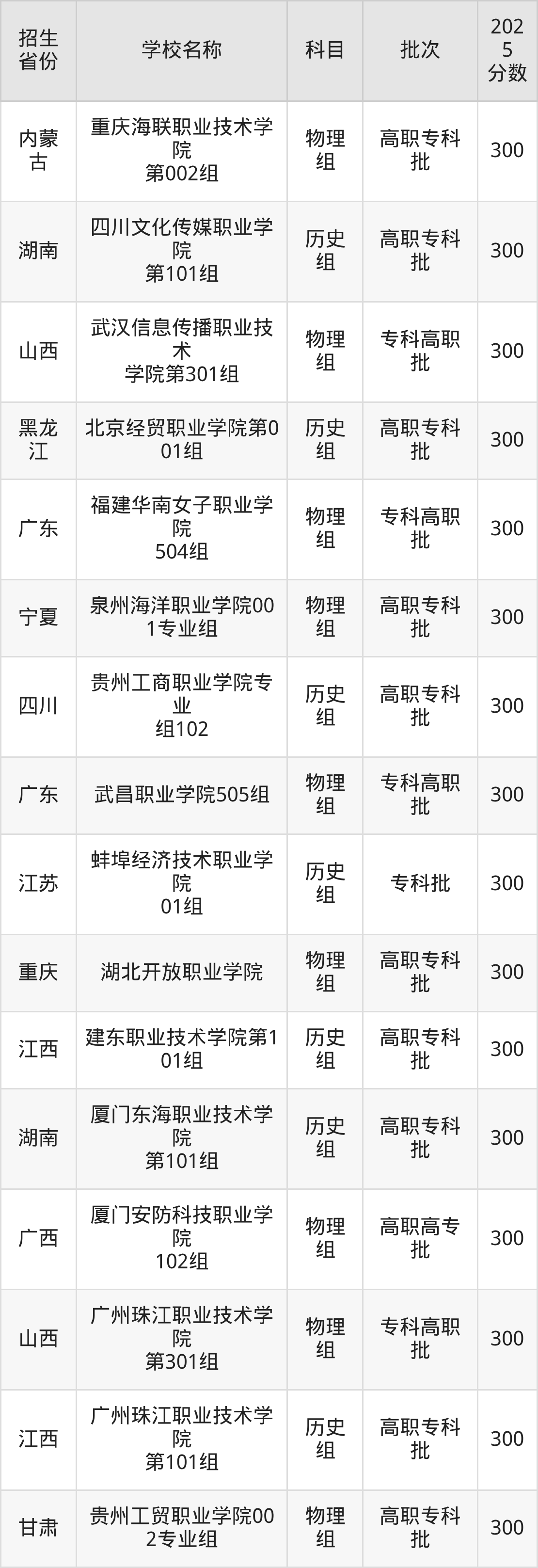 筛选全国各省2025年录取分数线为300分的民办专科学校如下:
