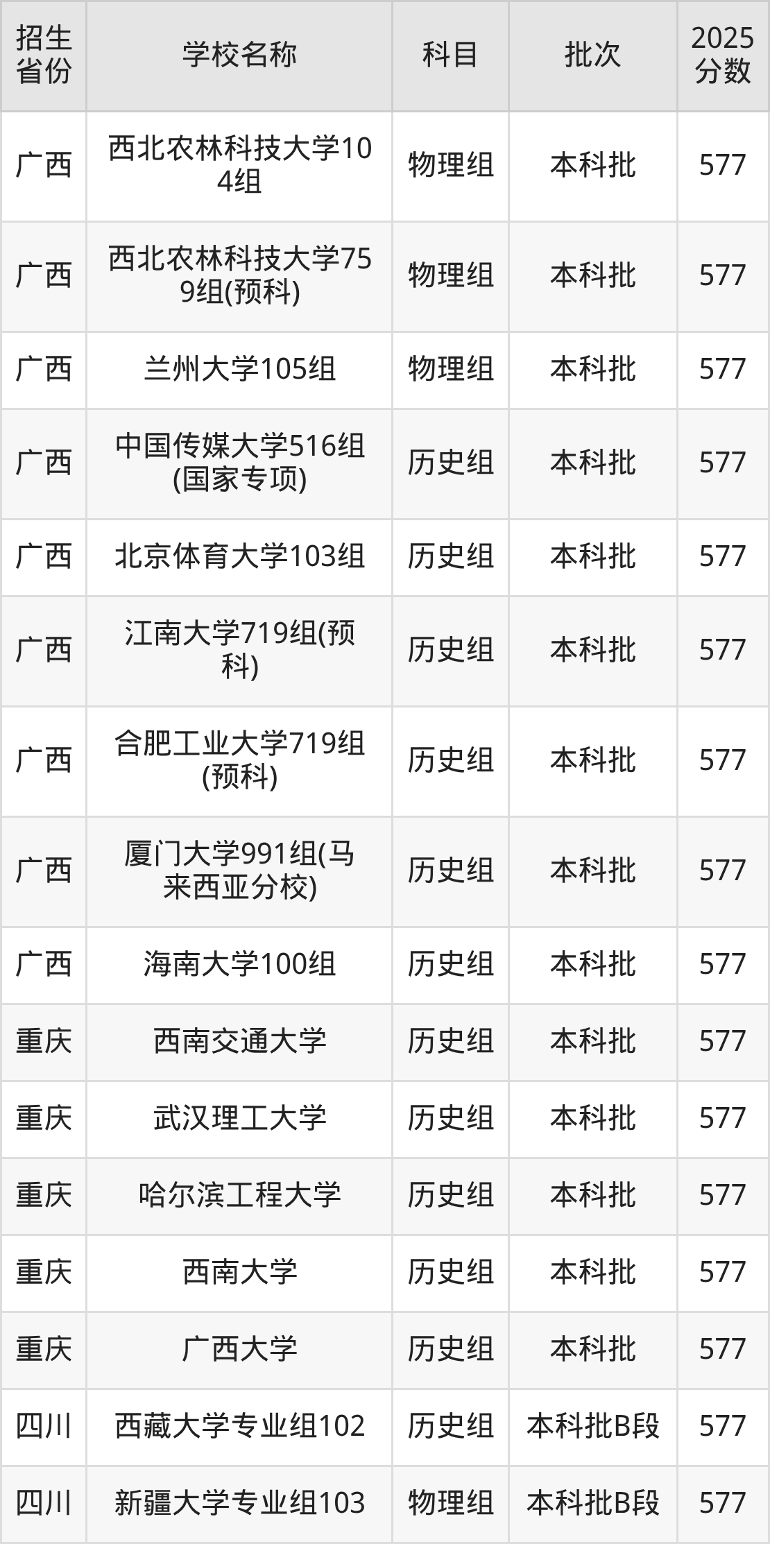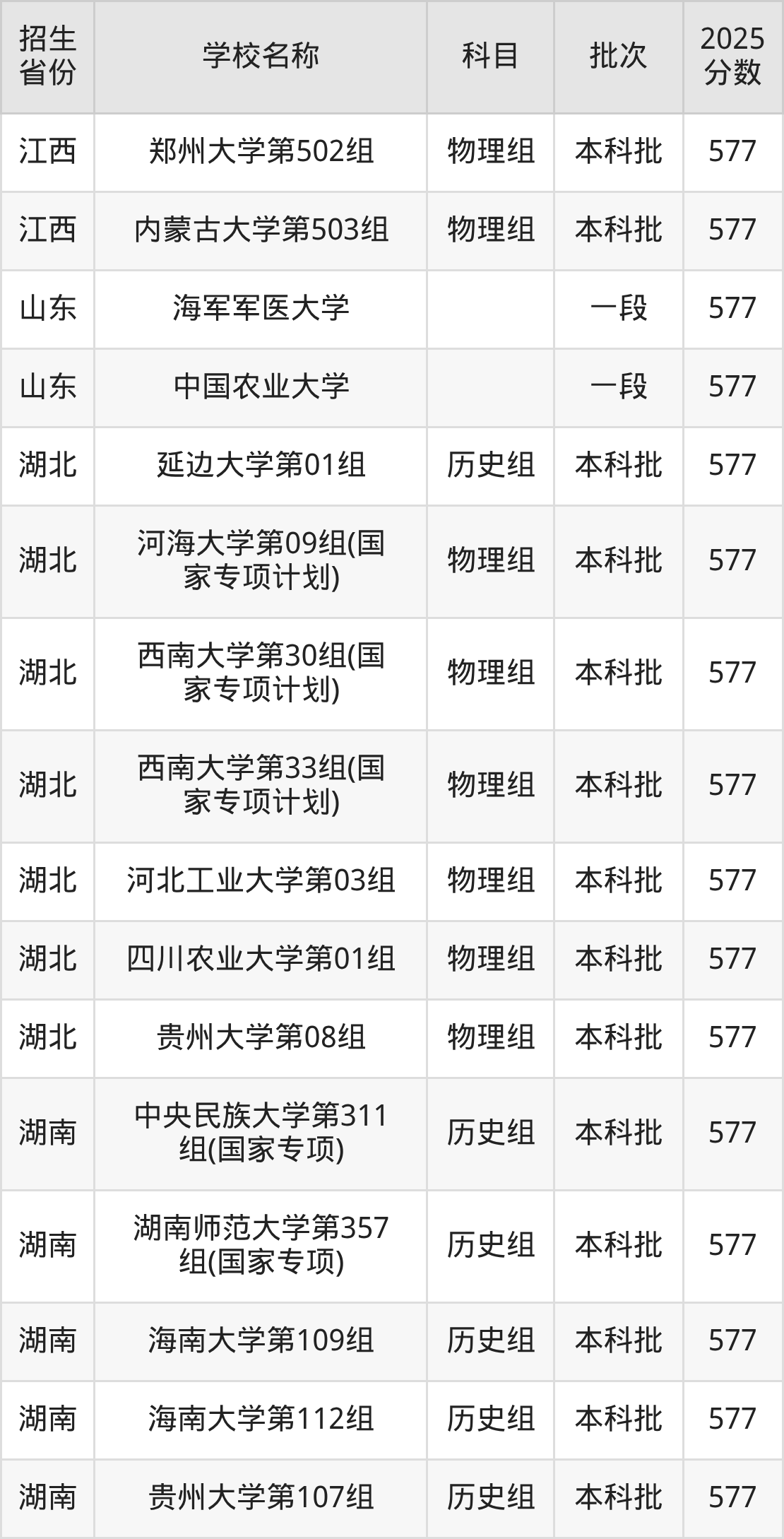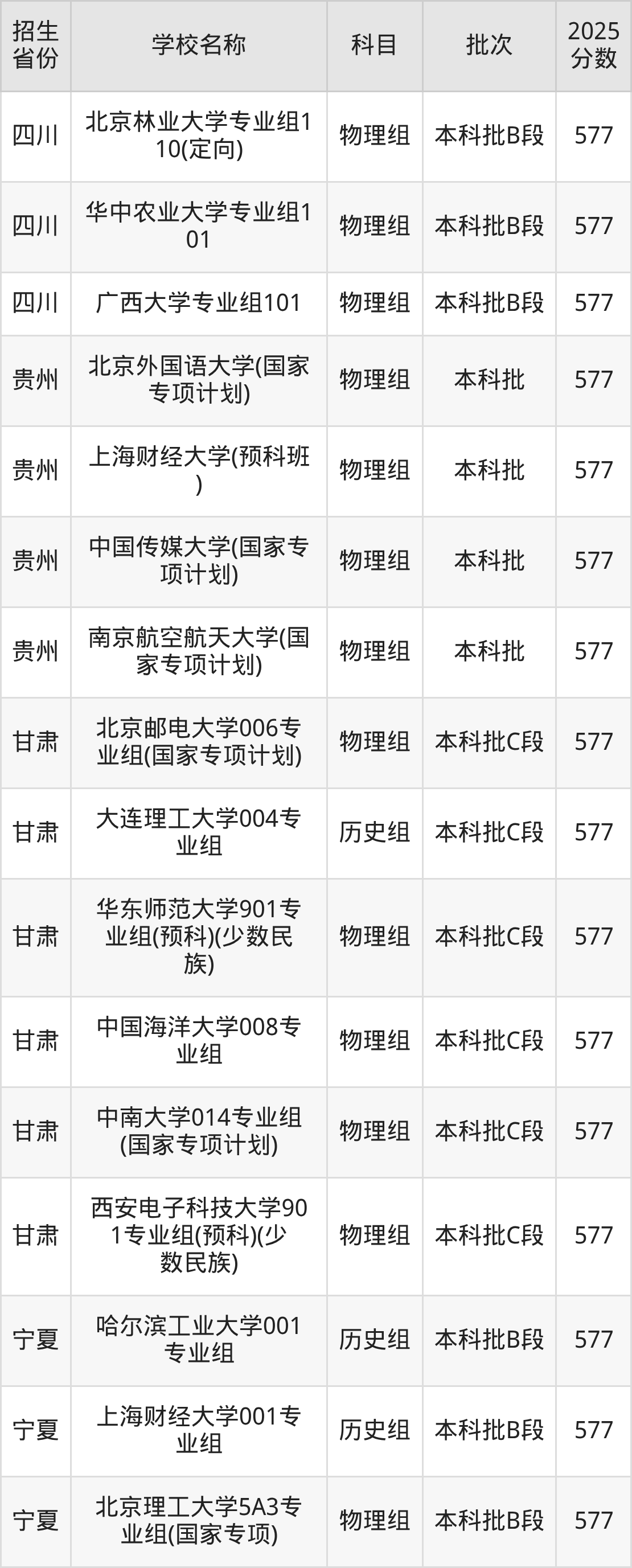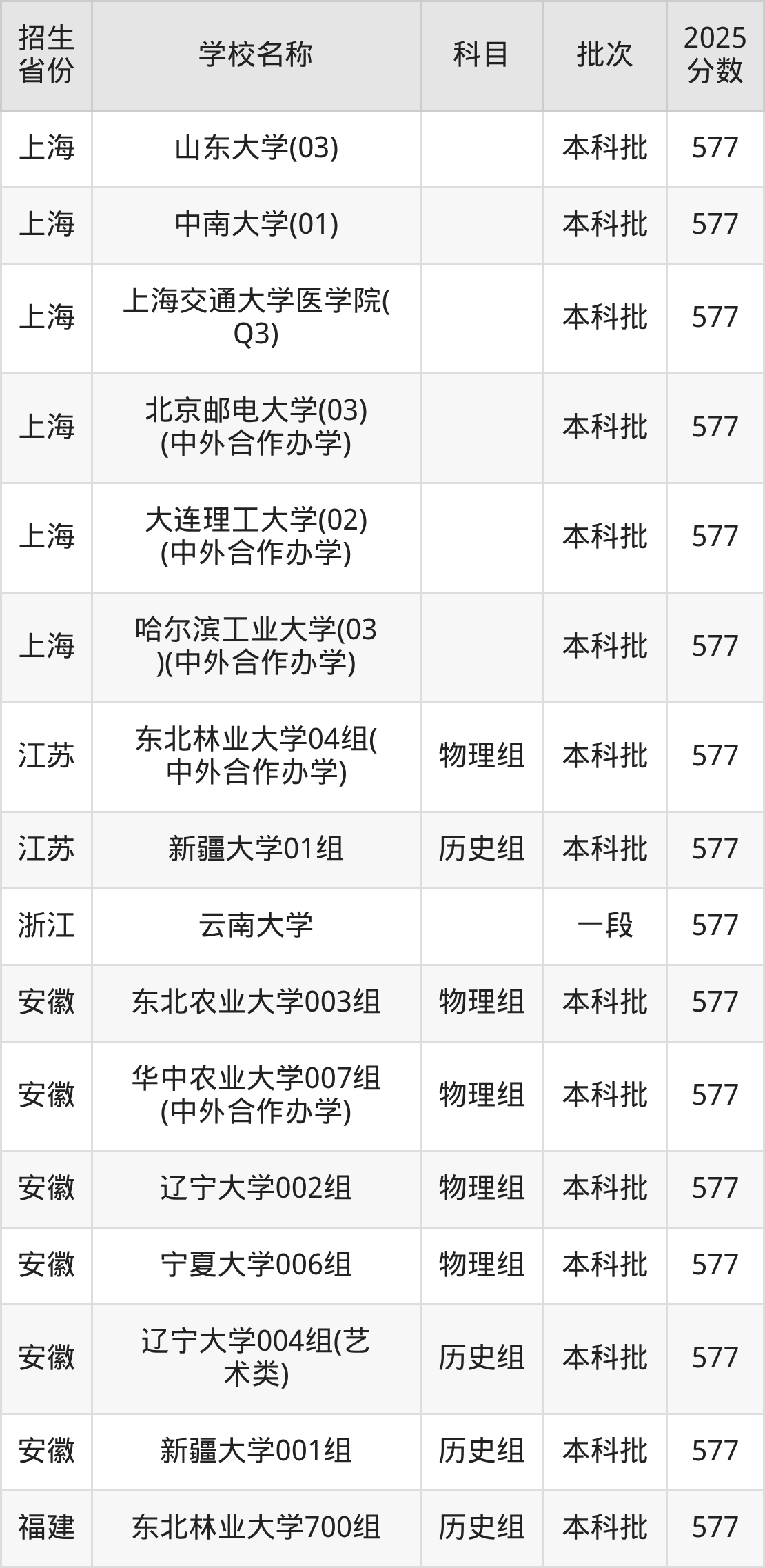 筛选全国各省2025年录取分数线为577分的211大学如下: