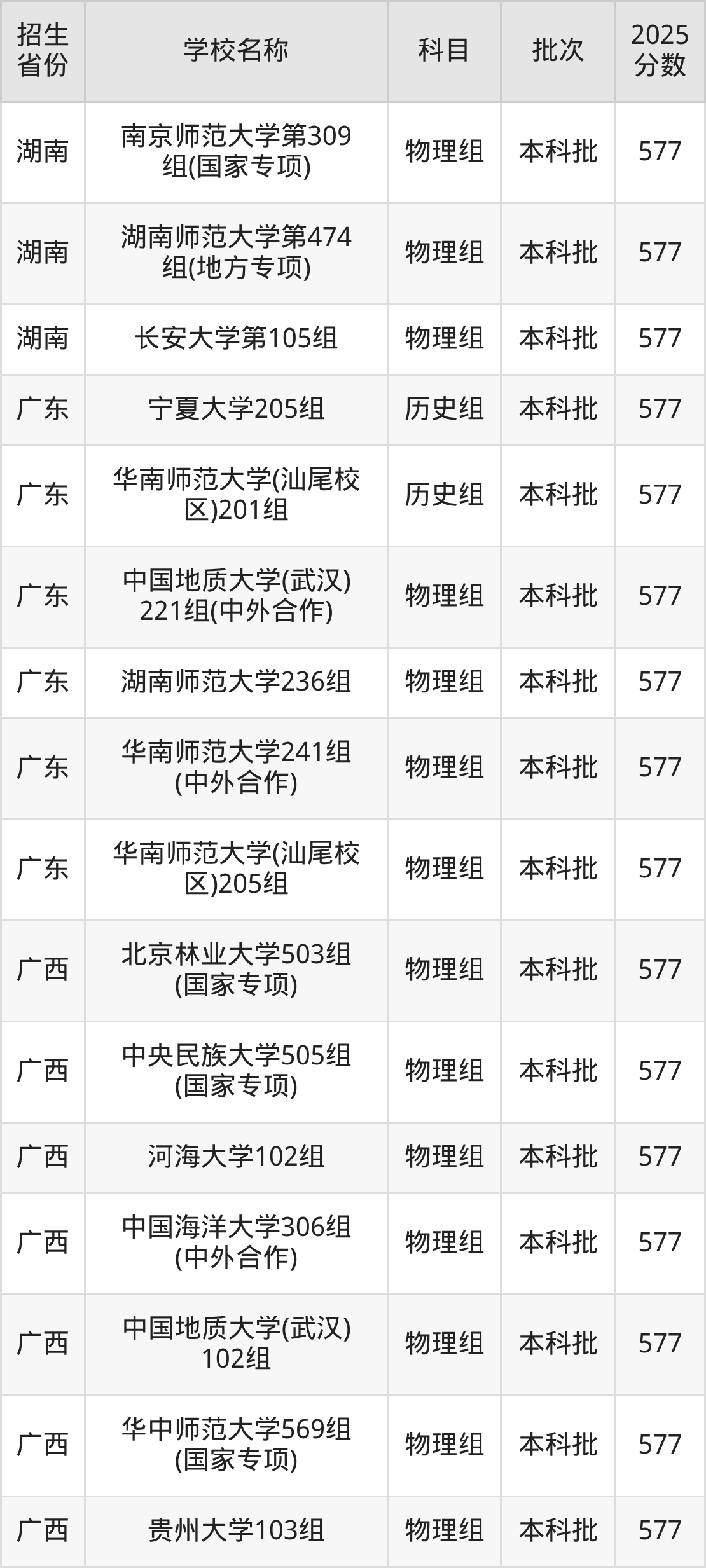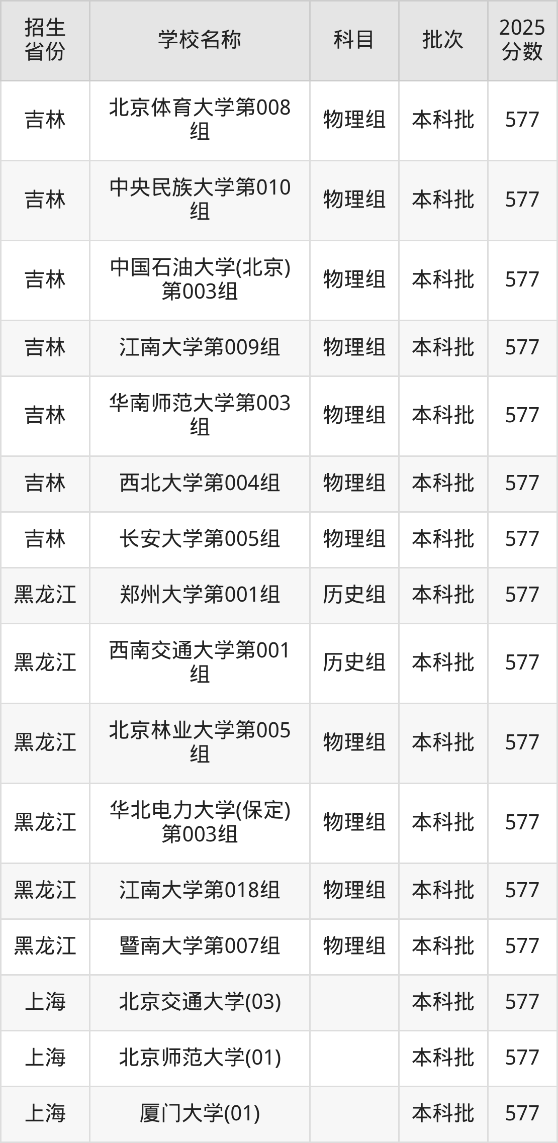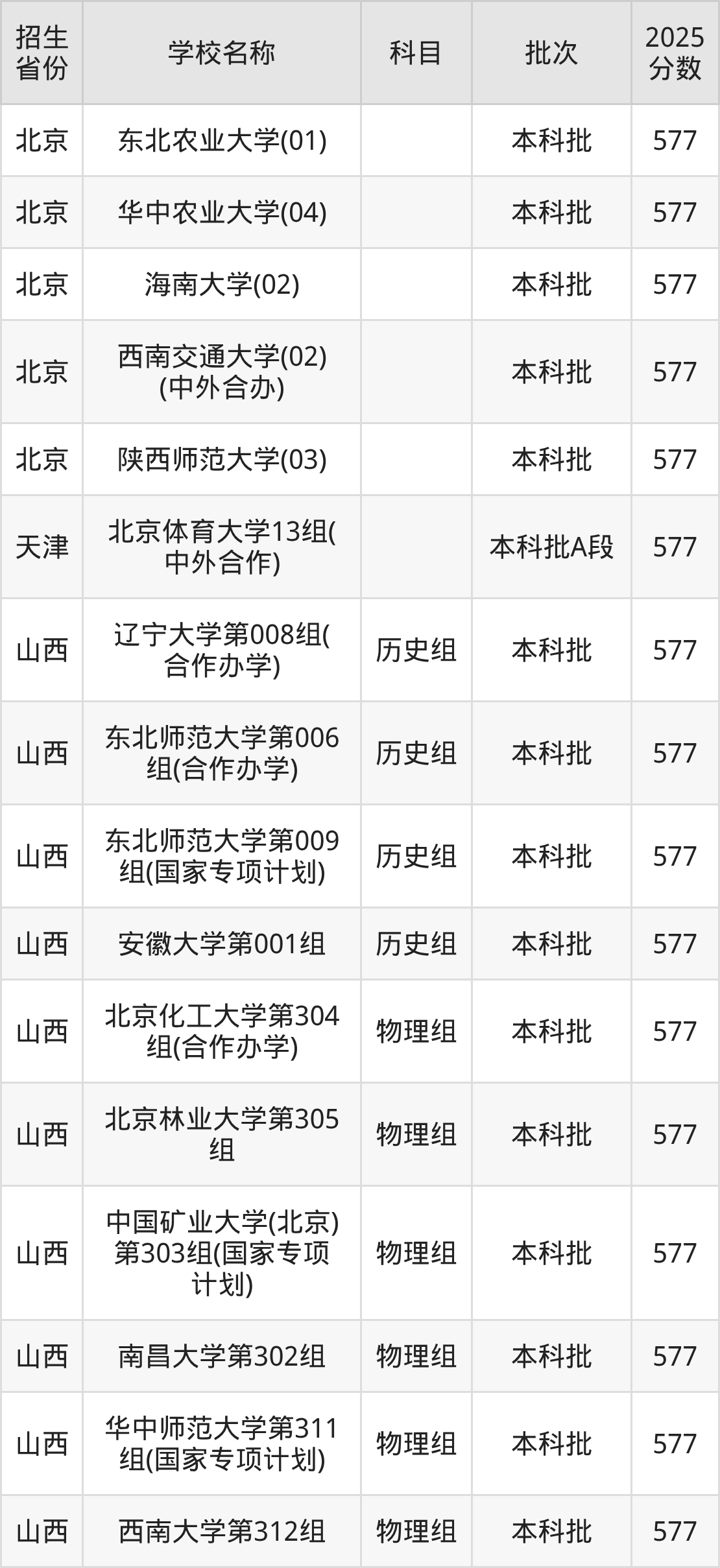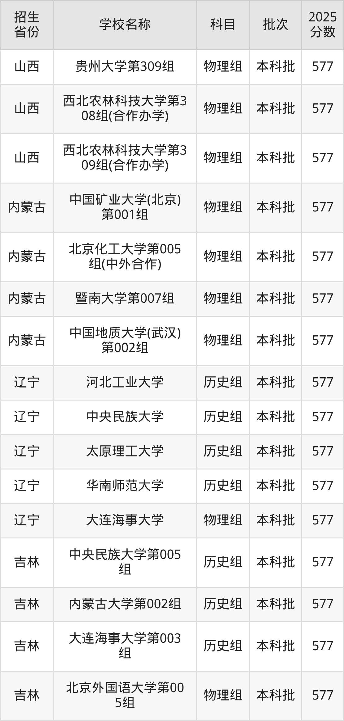 筛选全国各省2025年录取分数线为577分的211大学如下: