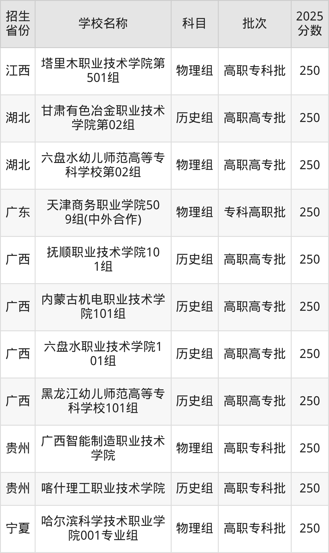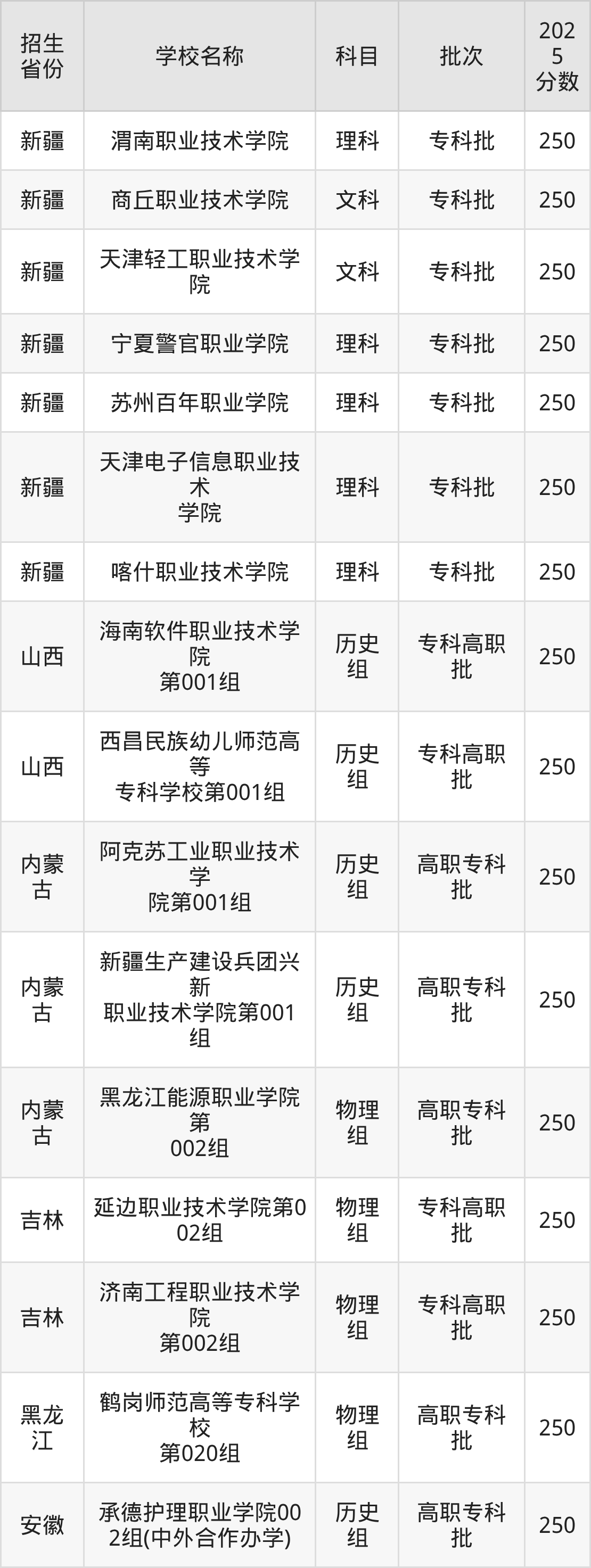 筛选全国各省2025年录取分数线为250分的公办专科大学如下: