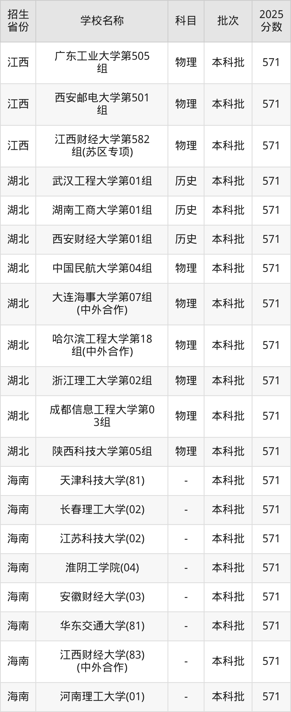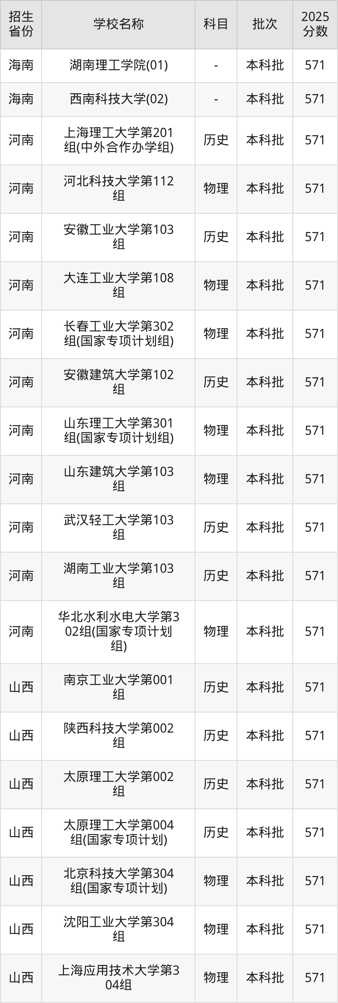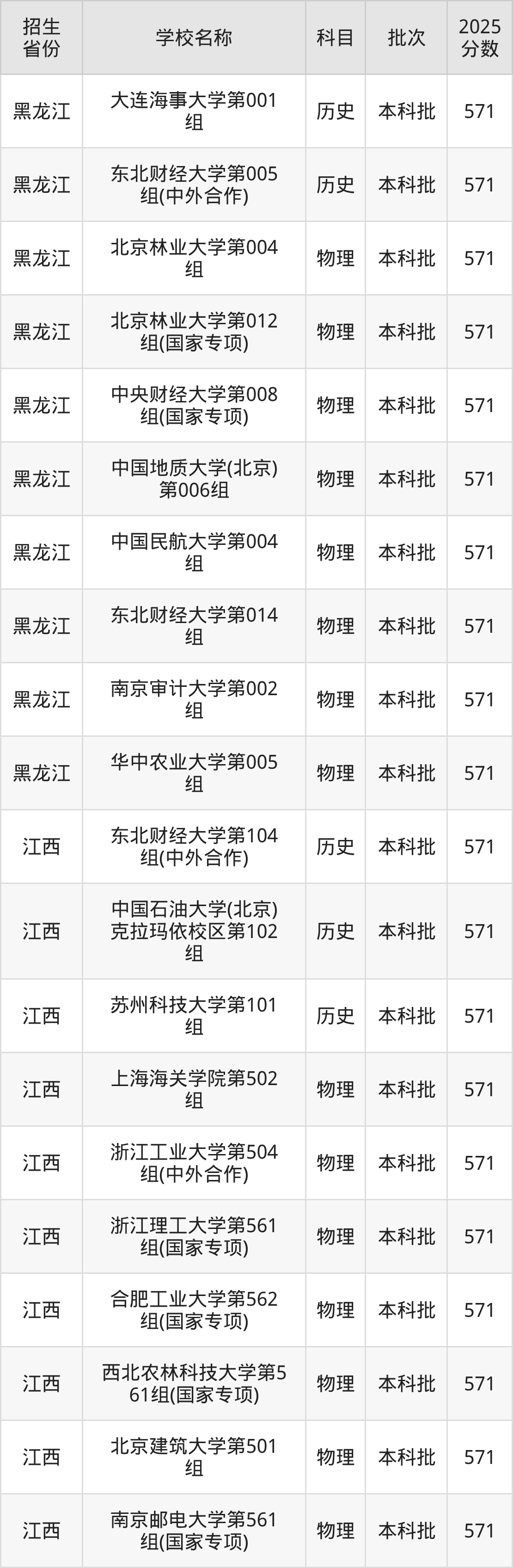 筛选全国各省2025年录取分数线为571分的理科大学如下: