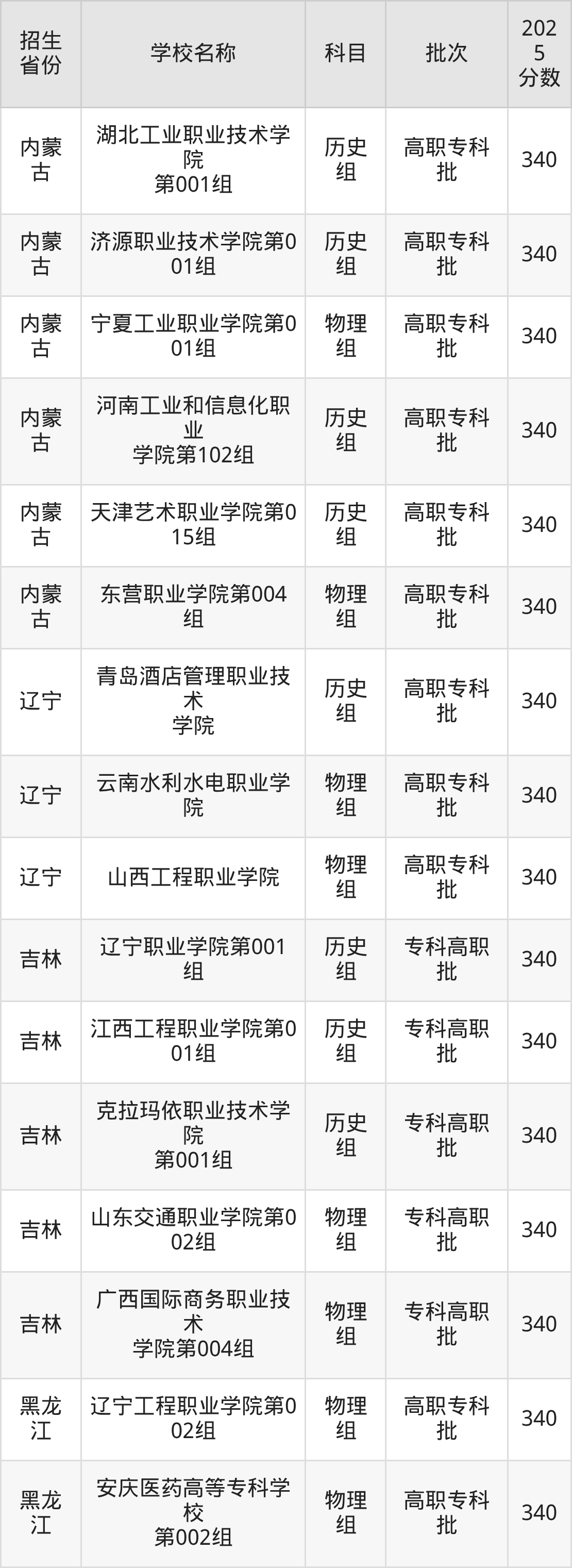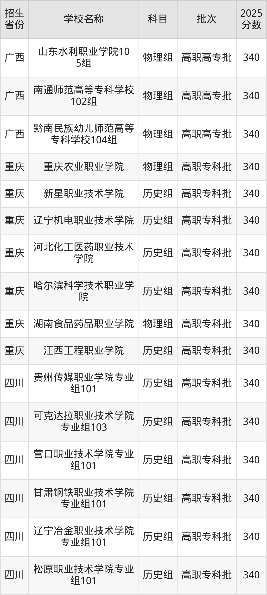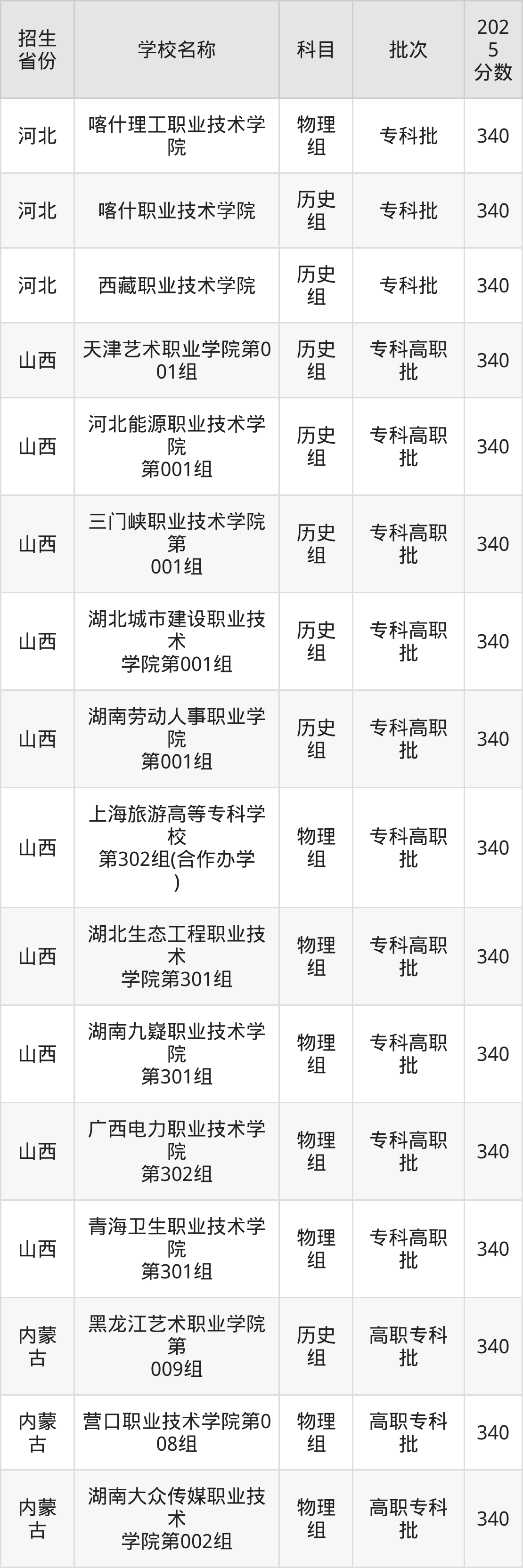 筛选全国各省2025年录取分数线为340分的公办专科大学如下: