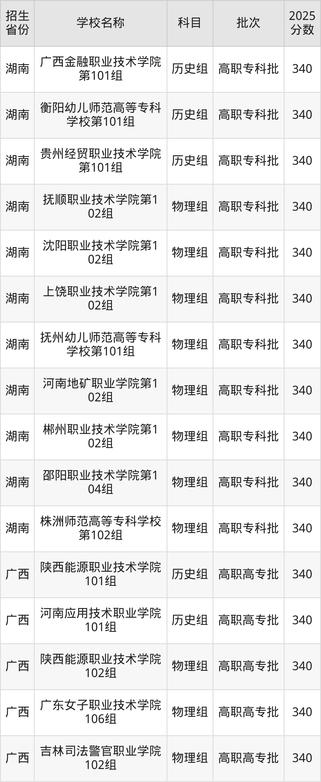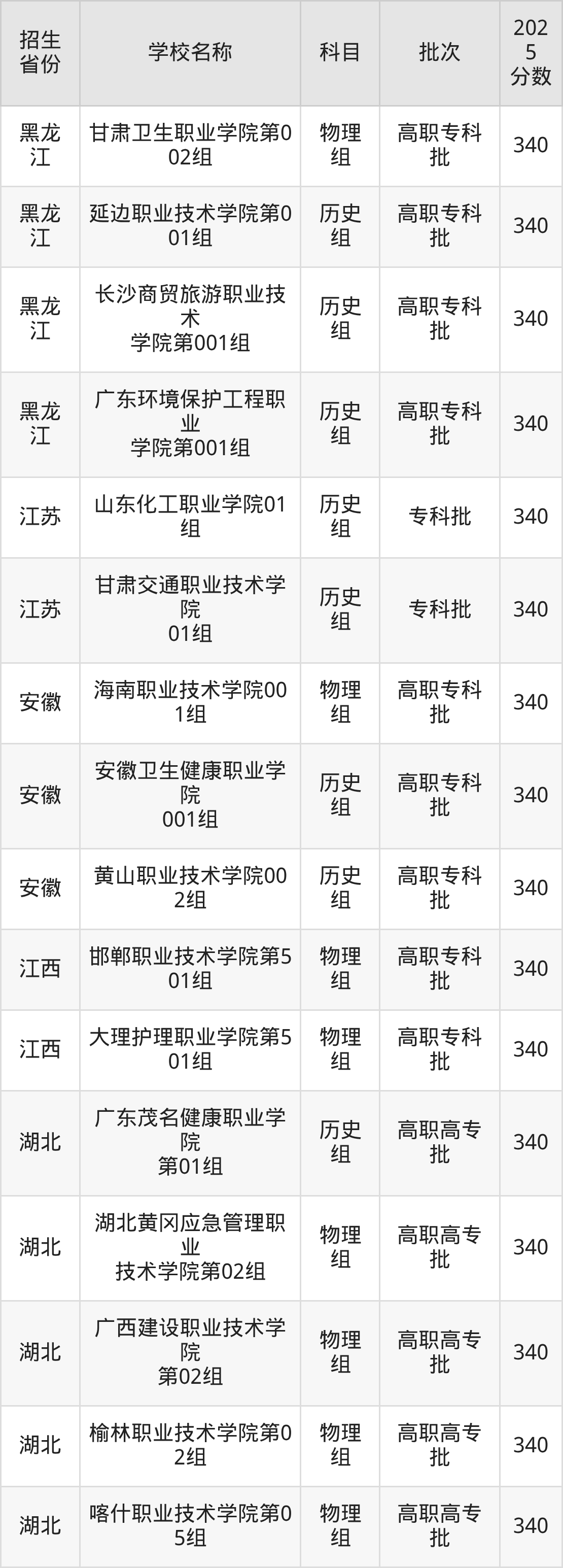 二、各省340分的公办专科大学名单