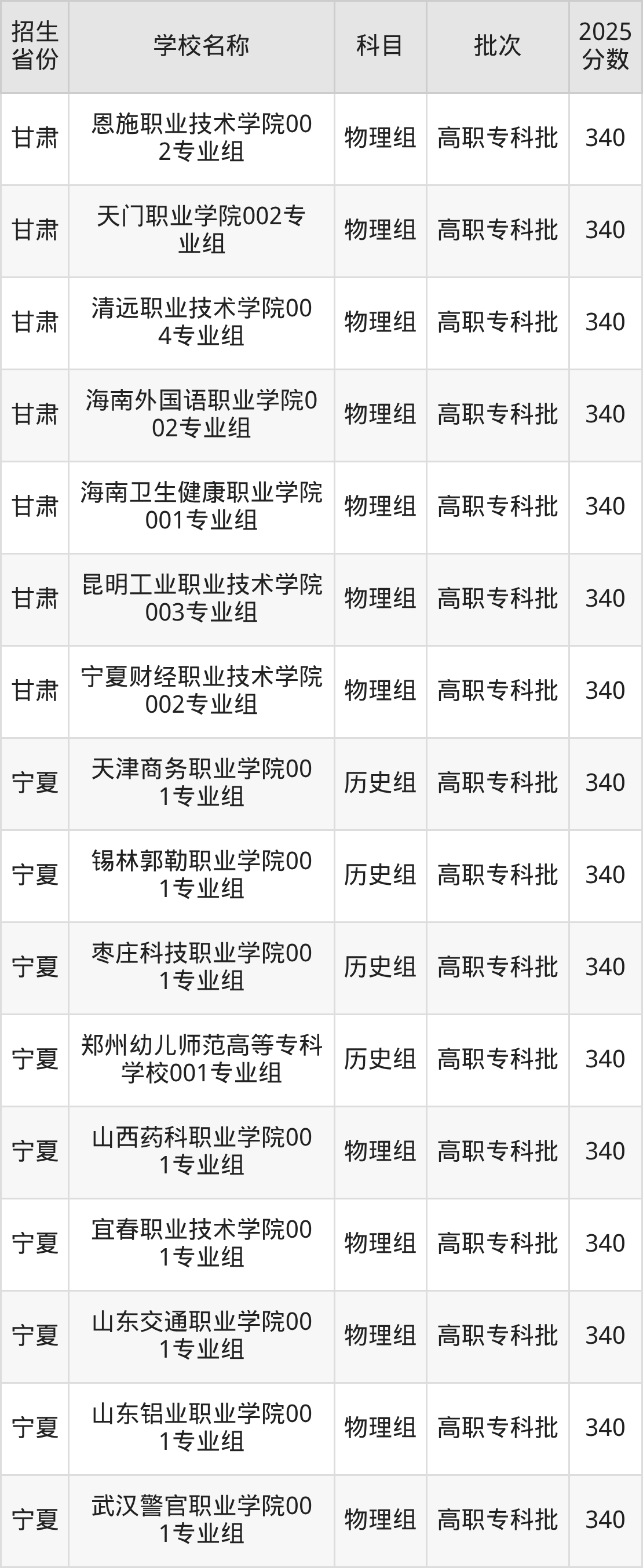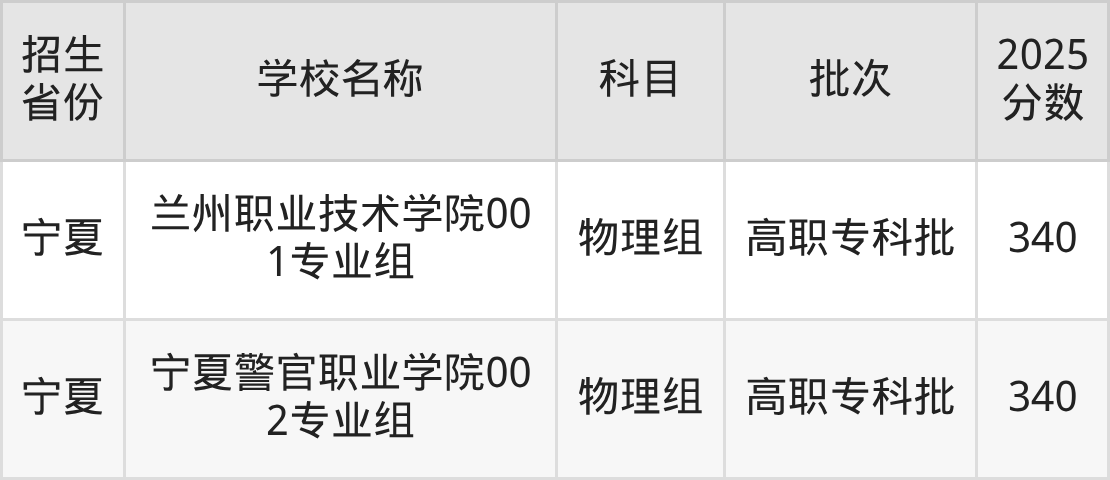 宁夏回族自治区物理组分数线是340分的公办专科大学有:山西药科职业学院、宜春职业技术学院、山东交通职业学院、山东铝业职业学院、武汉警官职业学院、兰州职业技术学院、宁夏警官职业学院。