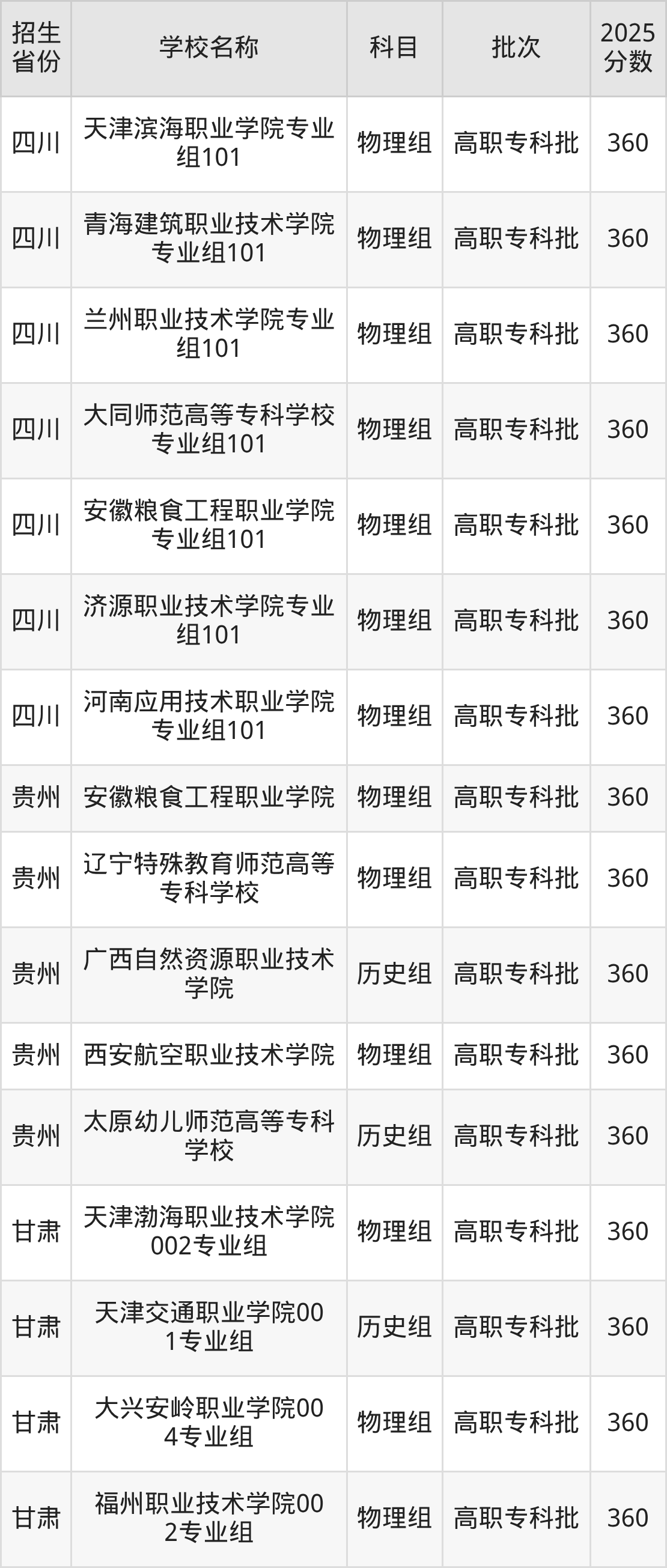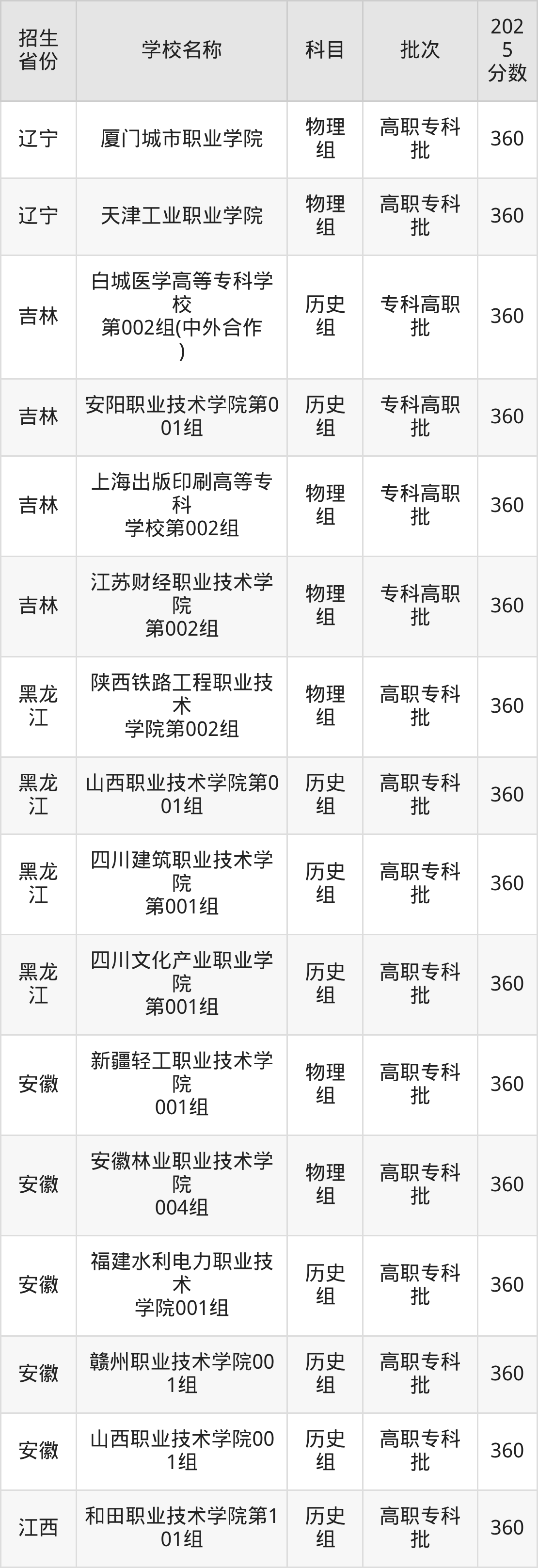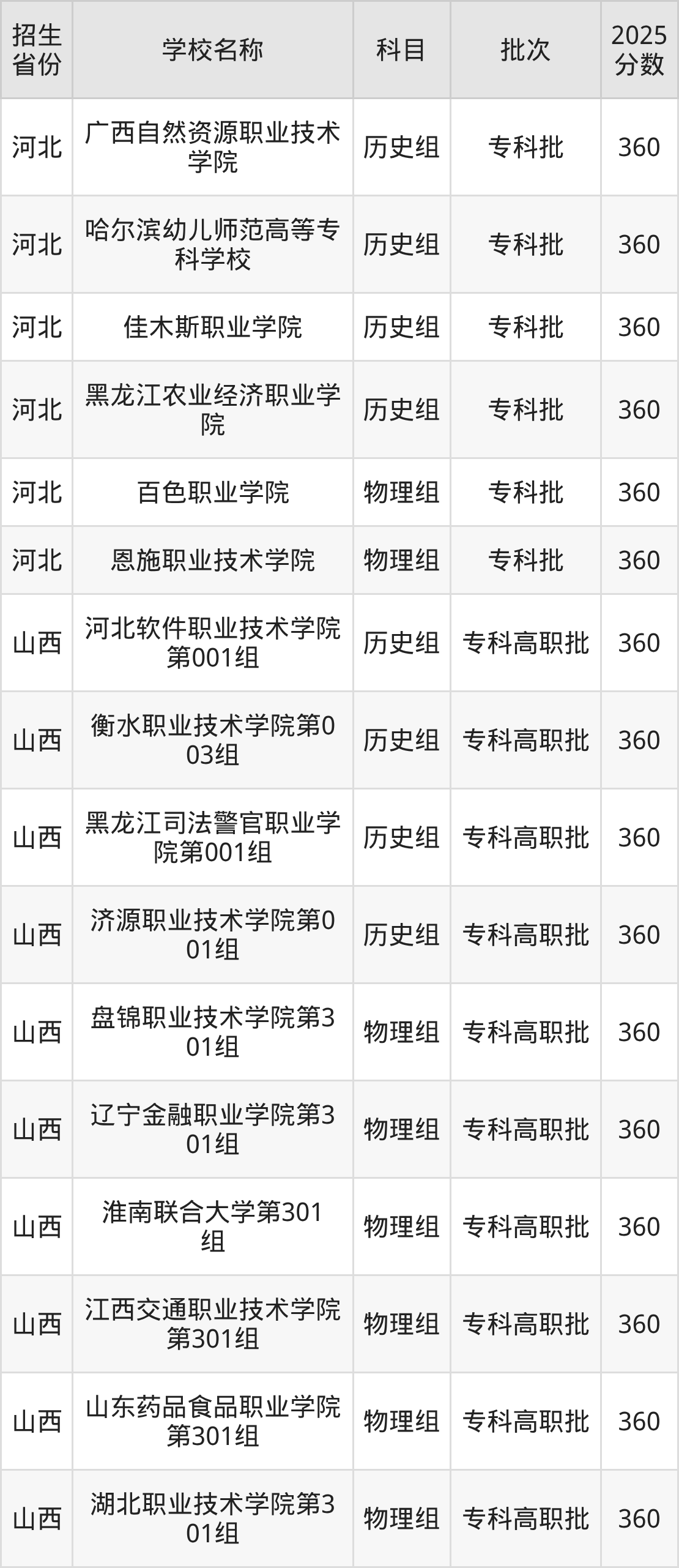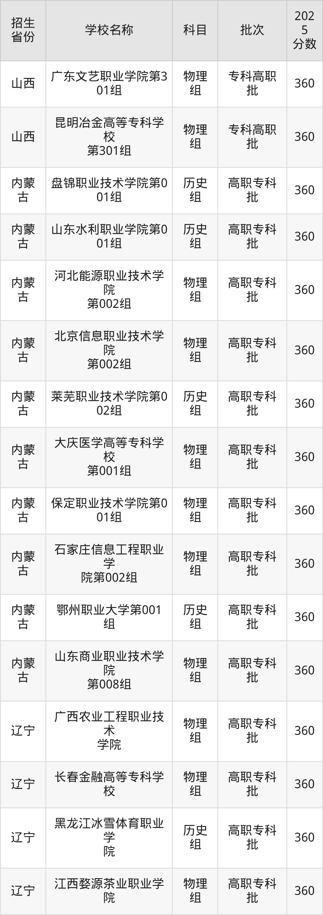 筛选全国各省2025年录取分数线为360分的公办专科大学如下: