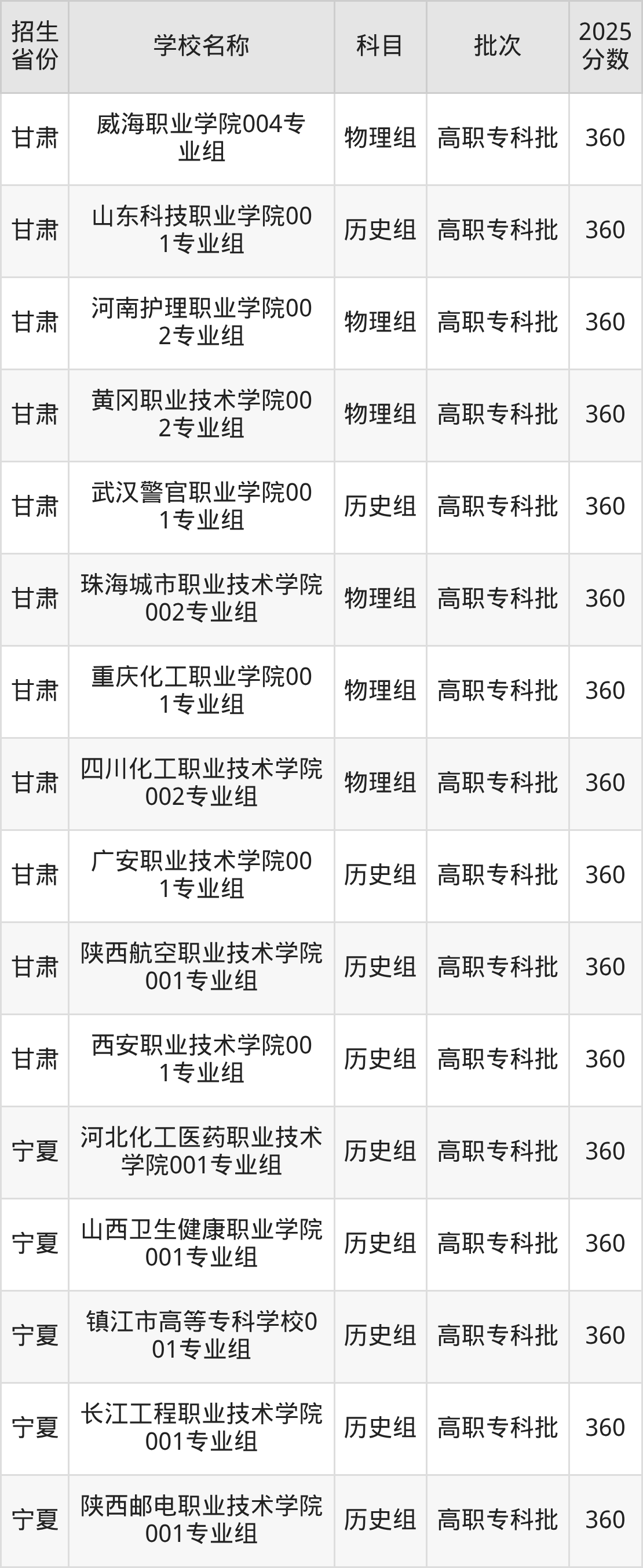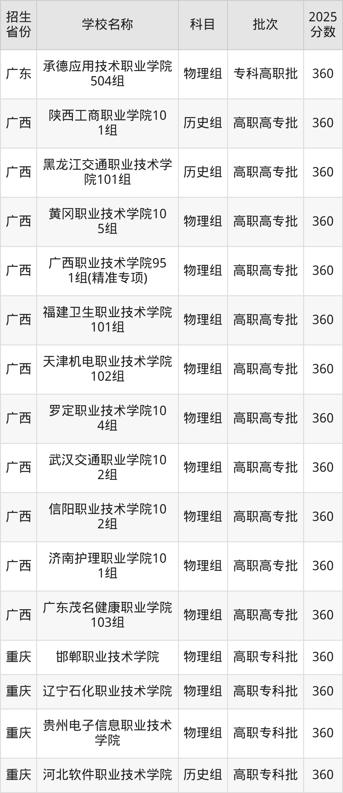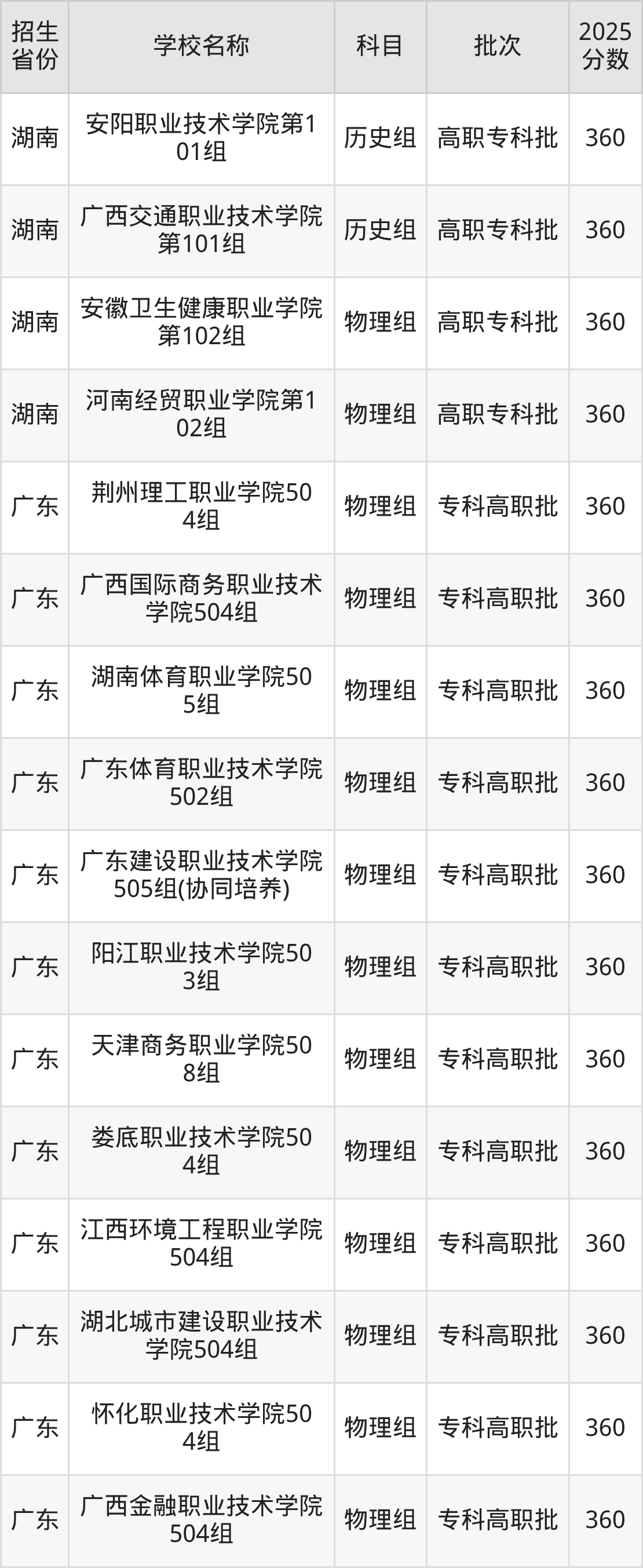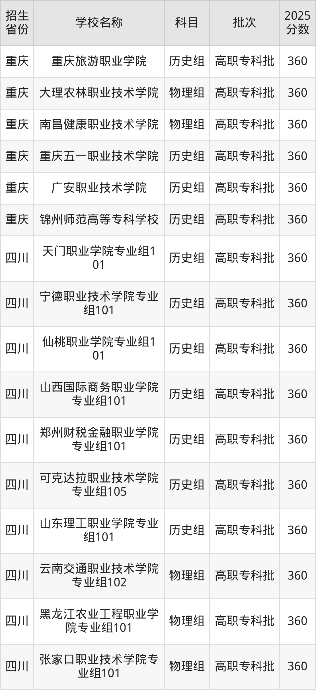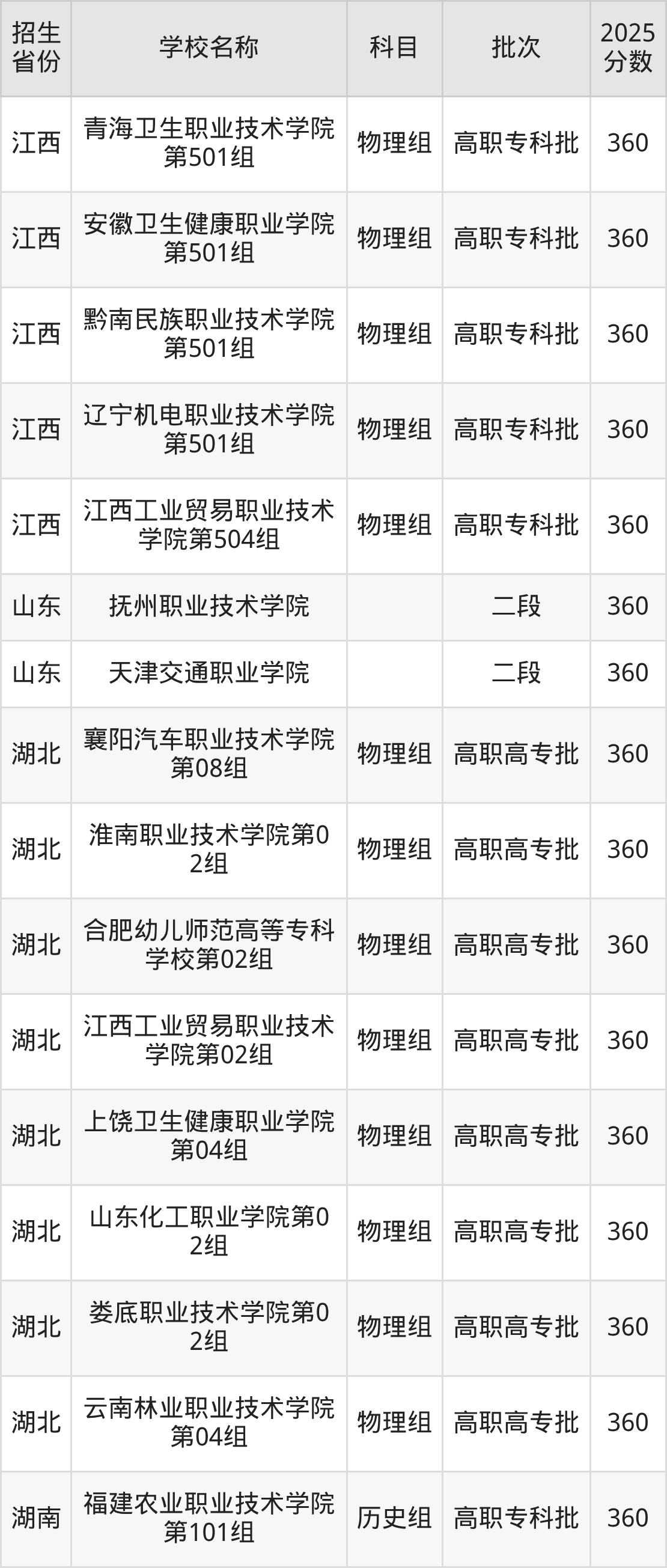 筛选全国各省2025年录取分数线为360分的公办专科大学如下: