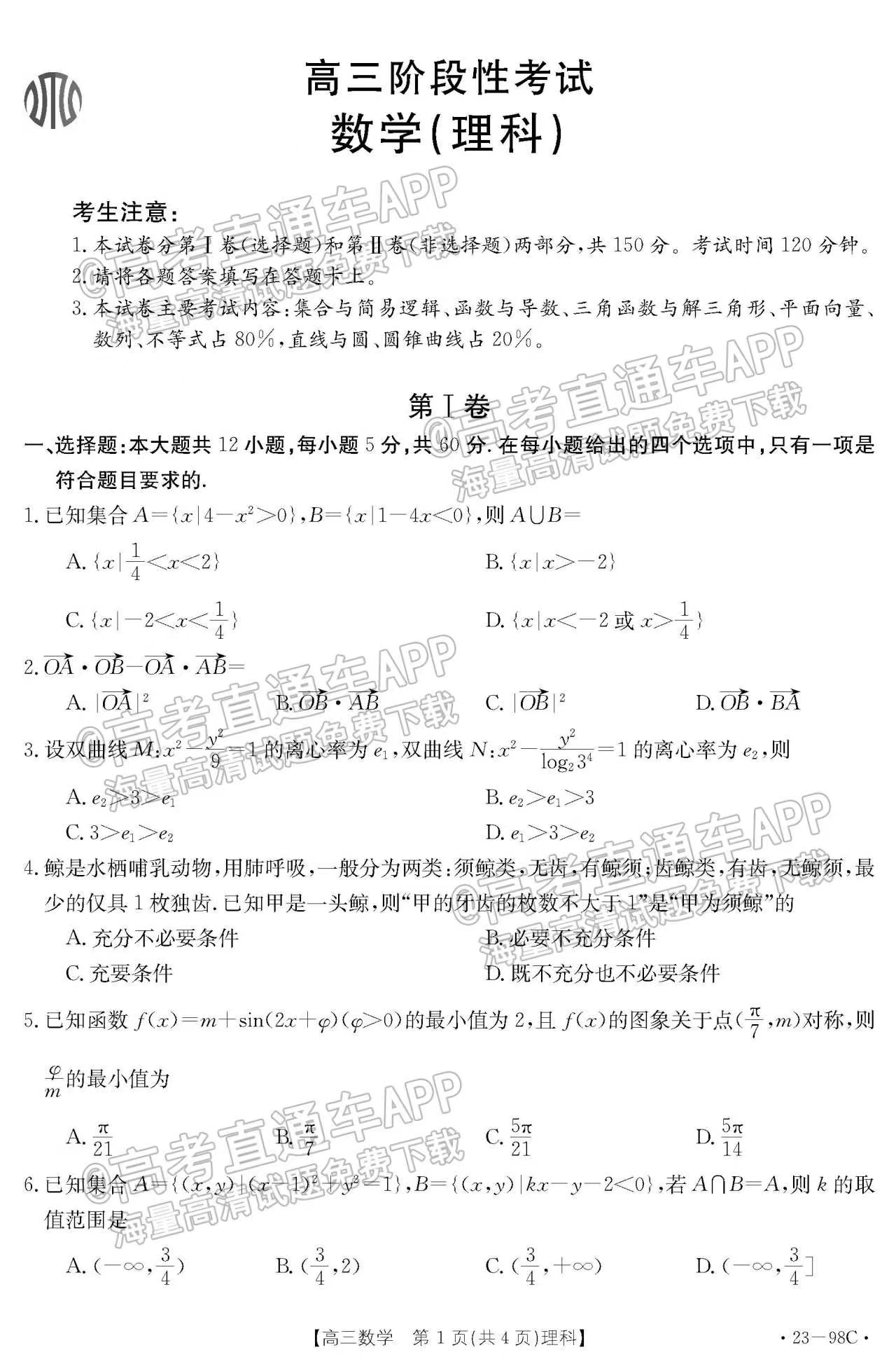 2023江西金太阳高三10月大联考23-98c将于2022年10月27日开考,考试结束后本文将更新2023江西金太阳高三10月大联考23-98c理科数学答案及试卷,下文为小编搜集整理的2023江西金太阳高三10月大联考23-98c理科数学试题及参考答案,供大家参考。