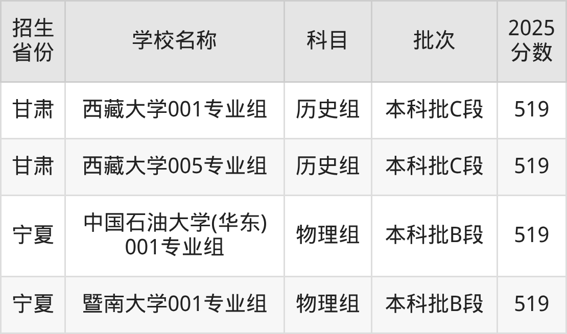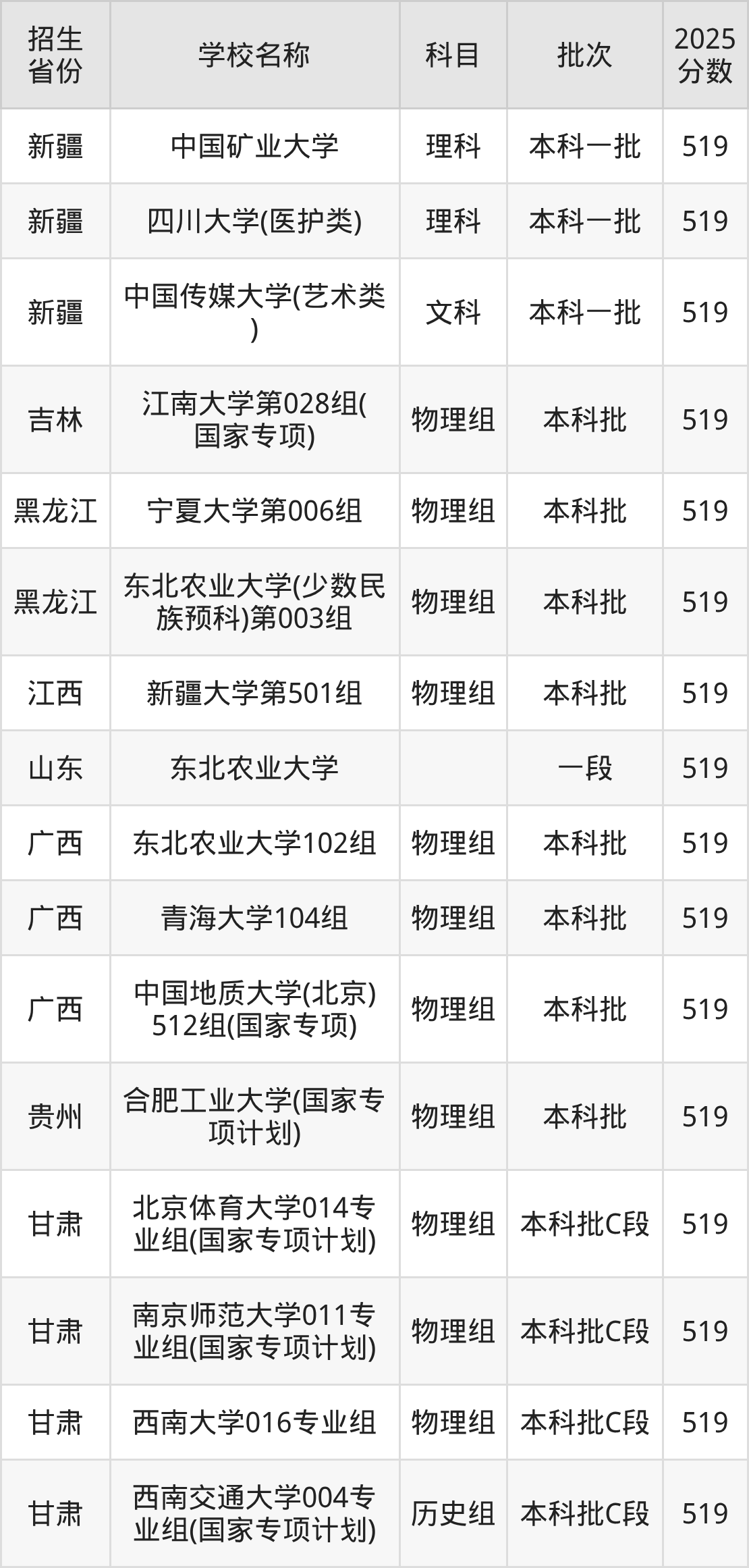 筛选全国各省2025年录取分数线为519分的211大学如下: