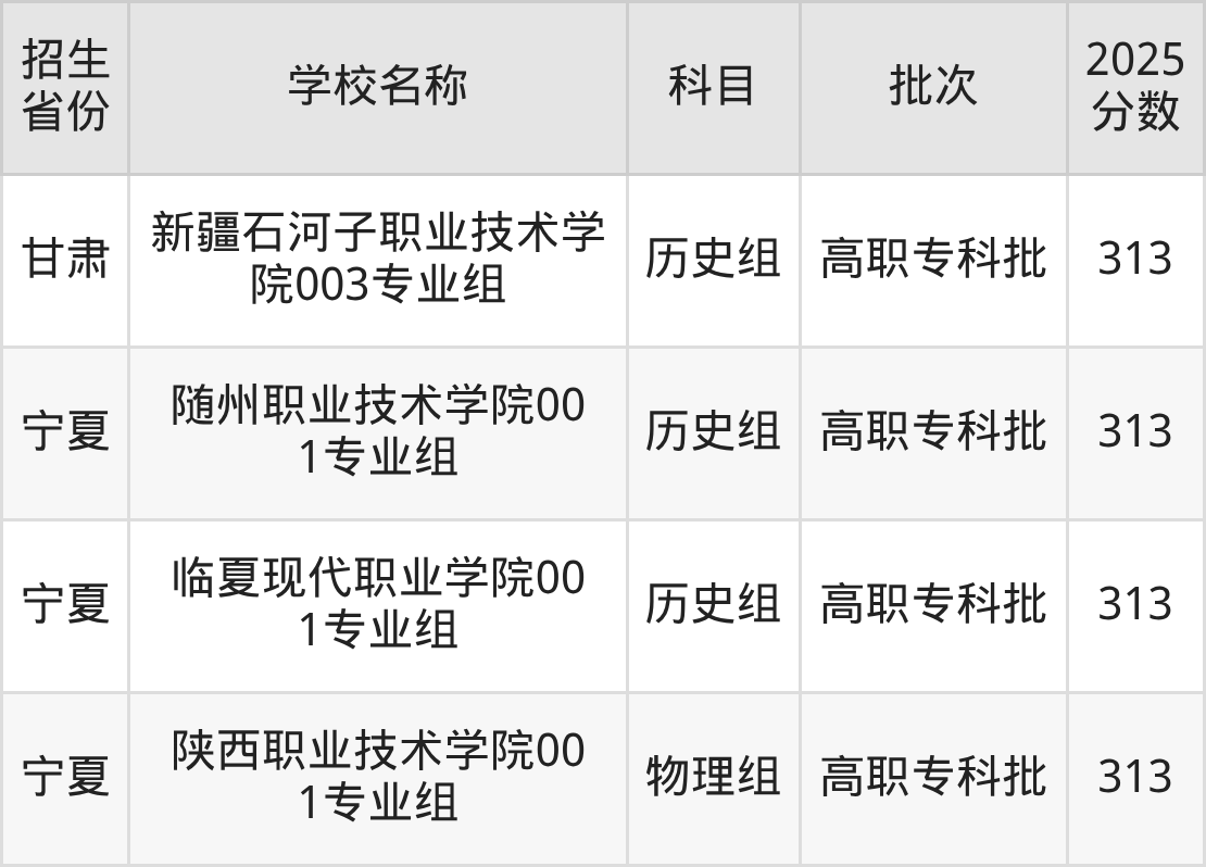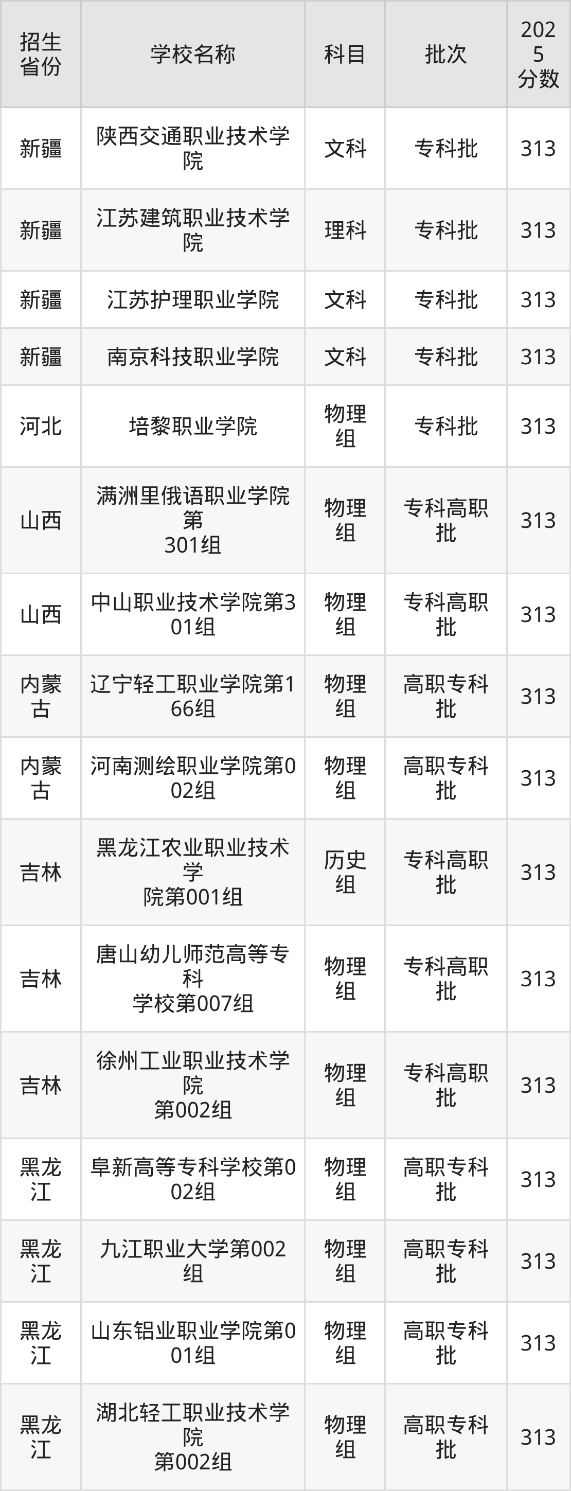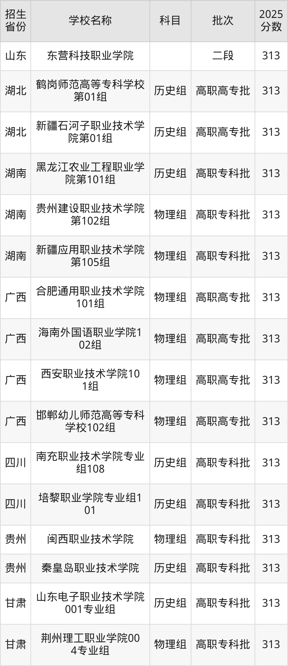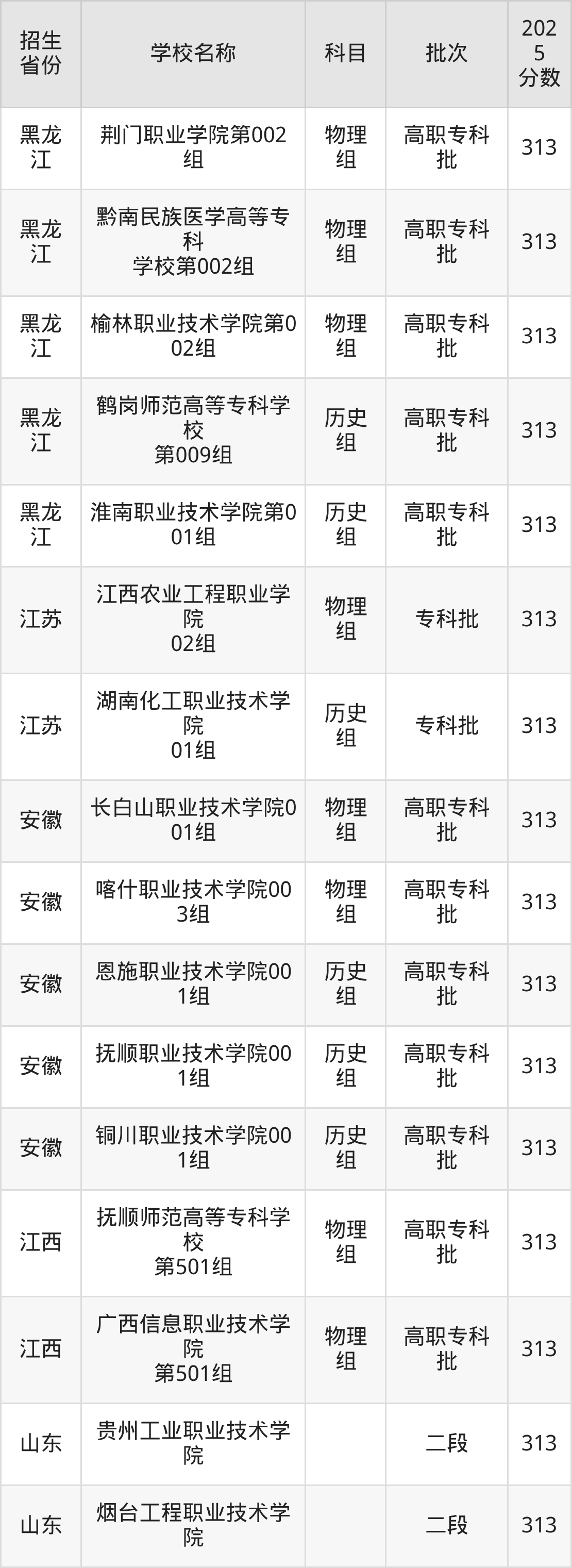 筛选全国各省2025年录取分数线为313分的公办专科大学如下: