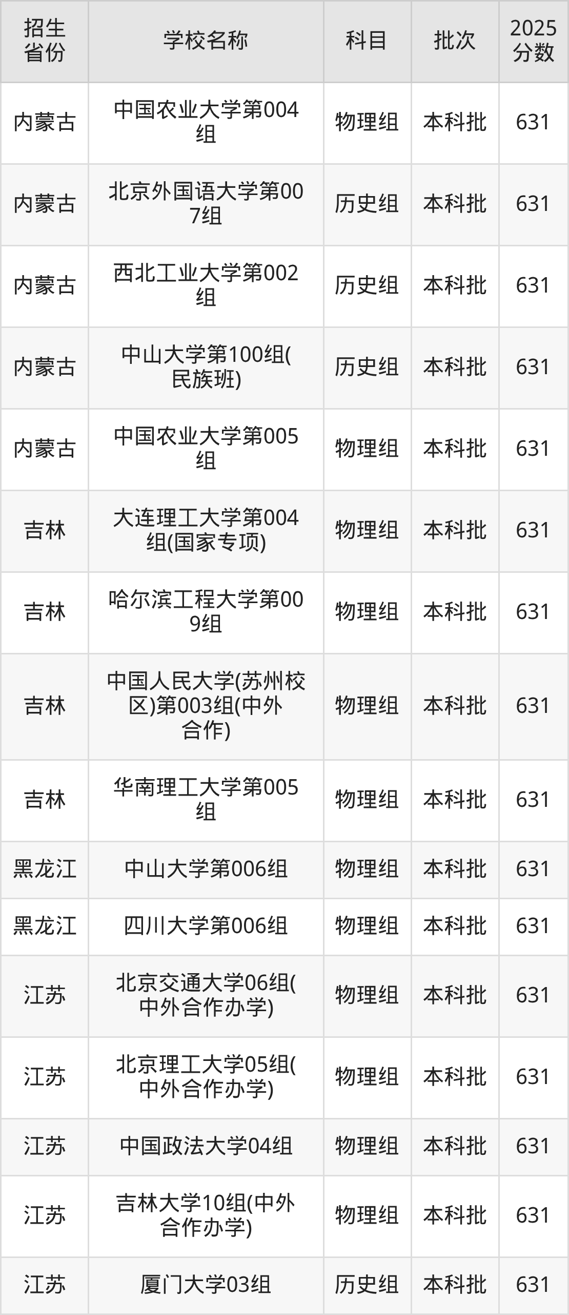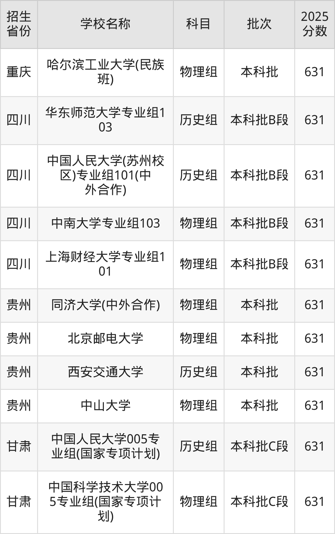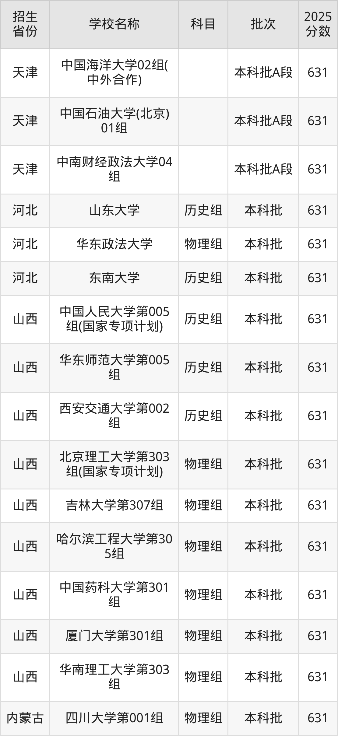 筛选全国各省2025年录取分数线为631分的一本大学如下: