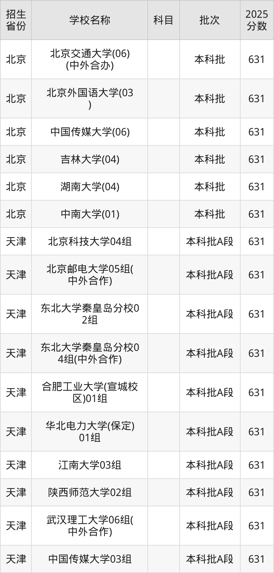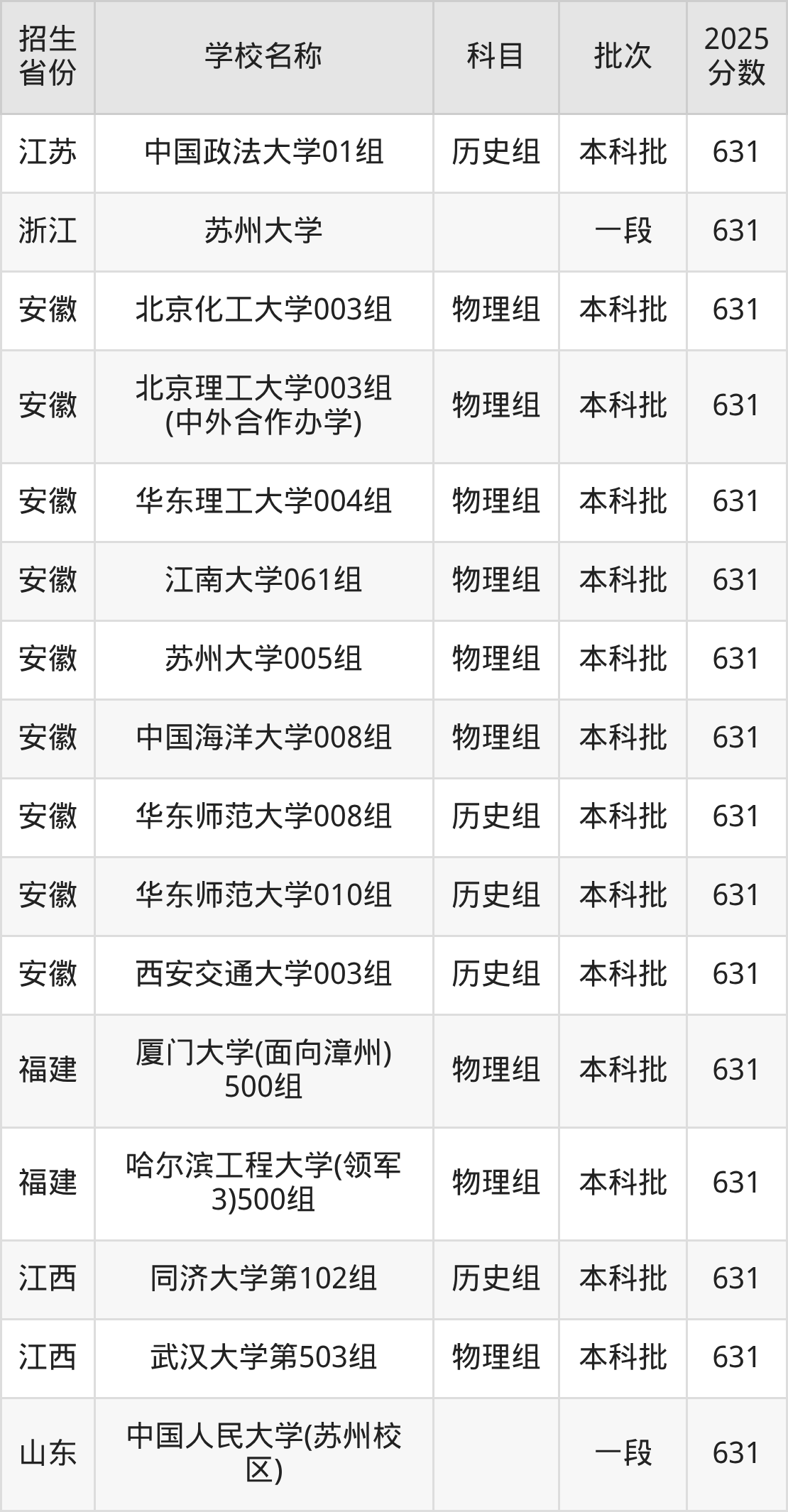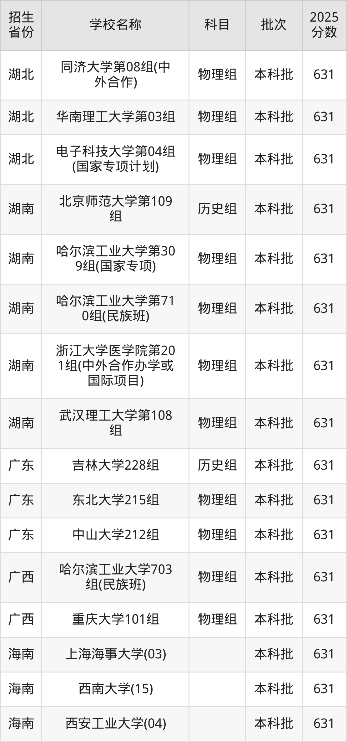 筛选全国各省2025年录取分数线为631分的一本大学如下: