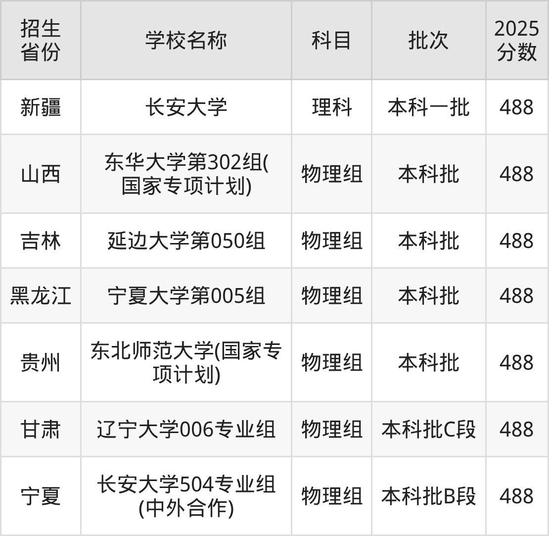 筛选全国各省2025年录取分数线为488分的211大学如下: