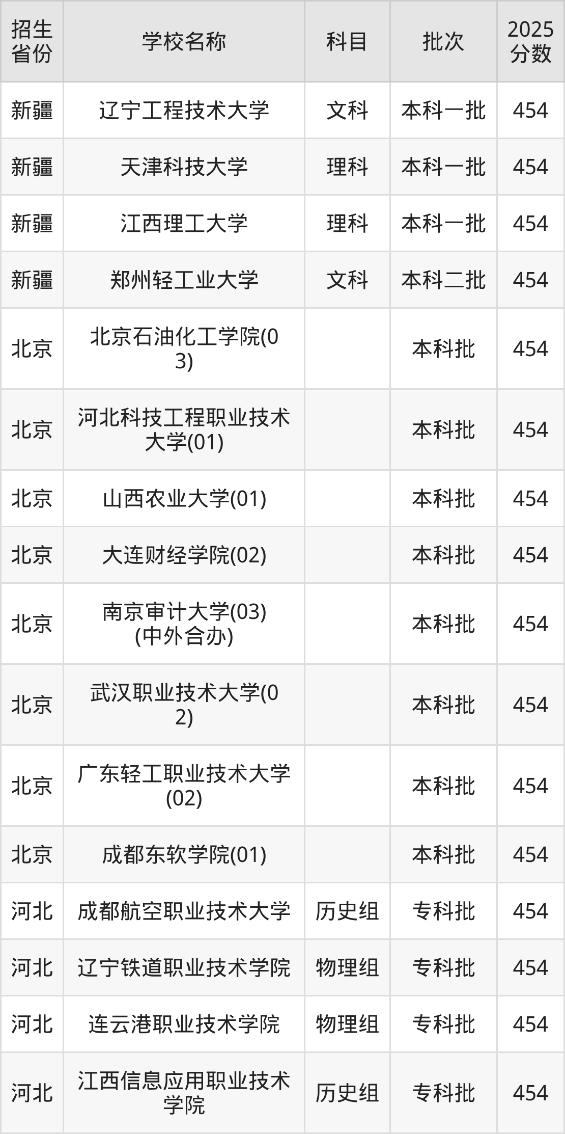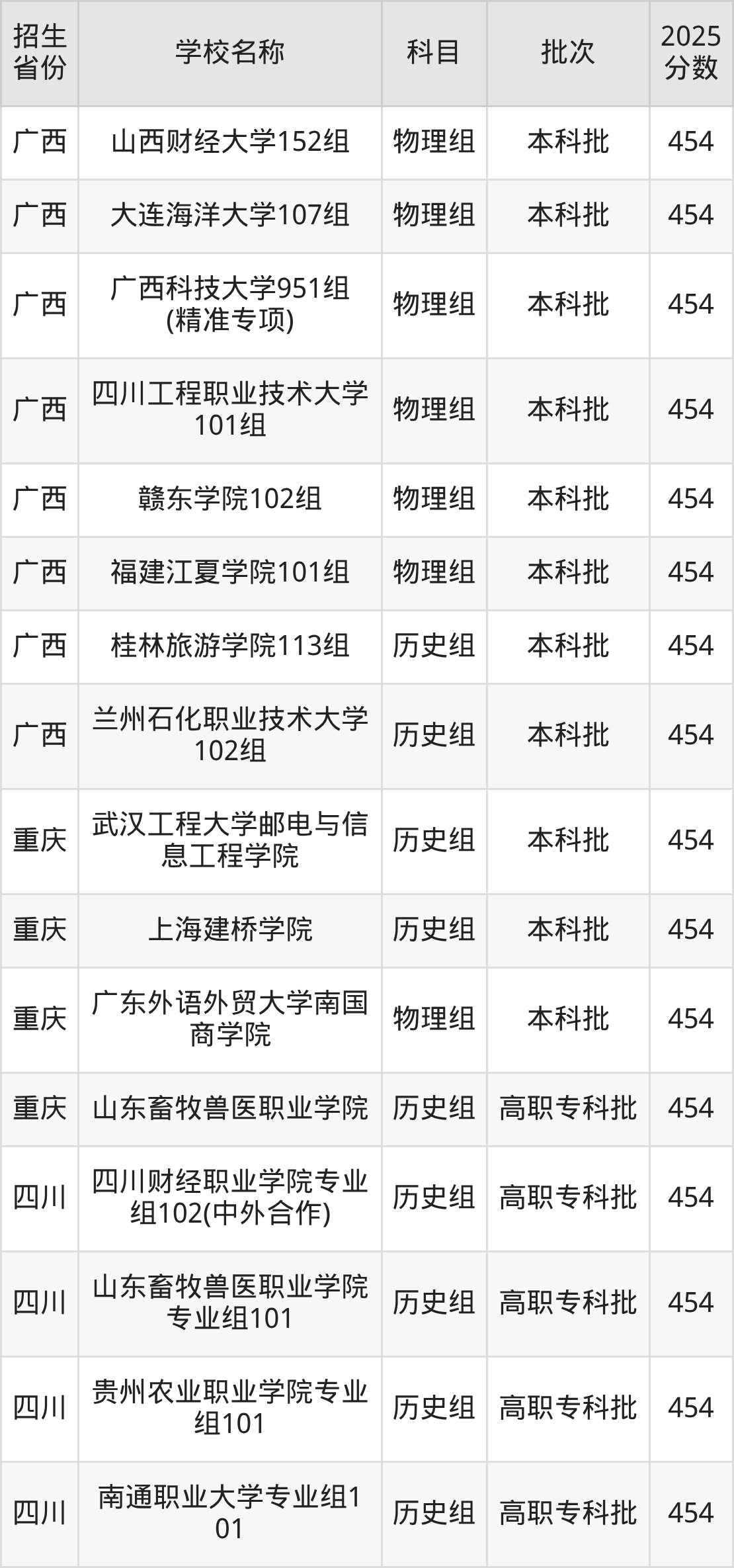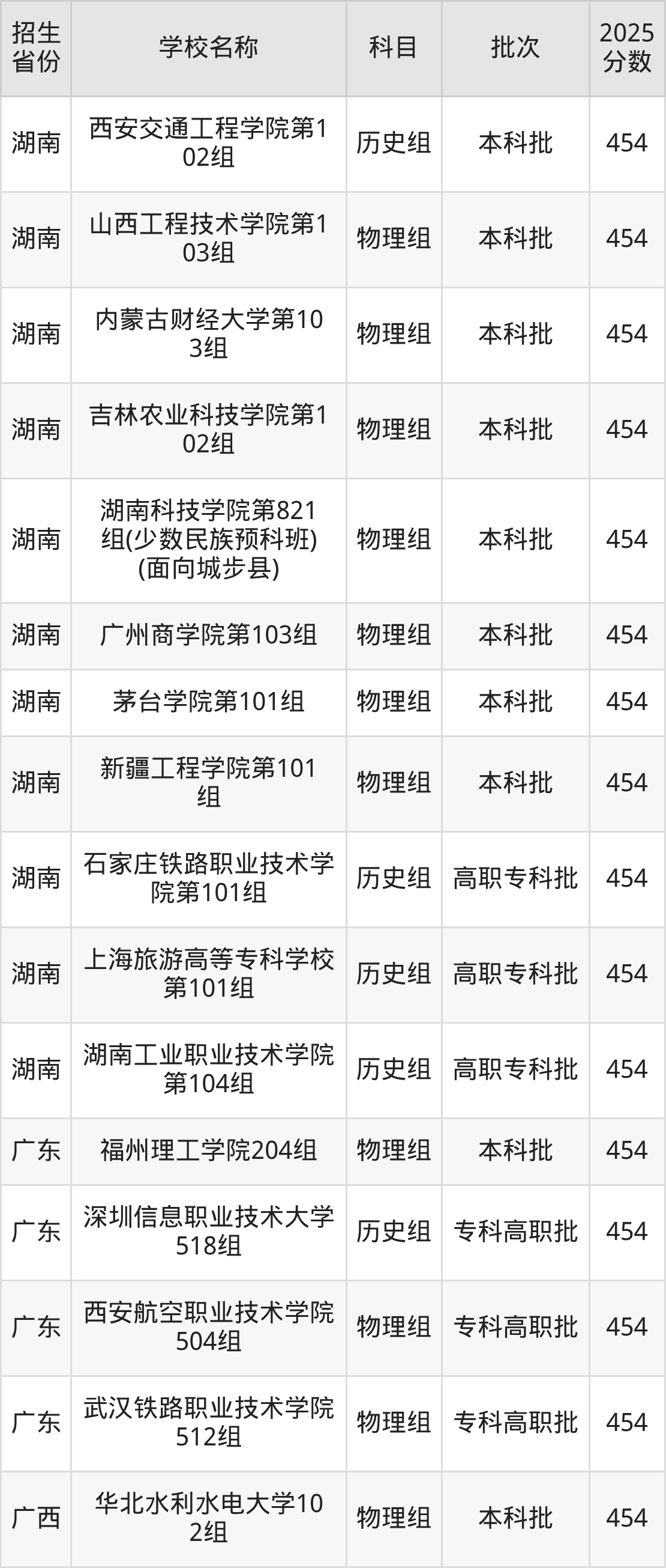 筛选全国各省2025年录取分数线为454分的理科大学如下: