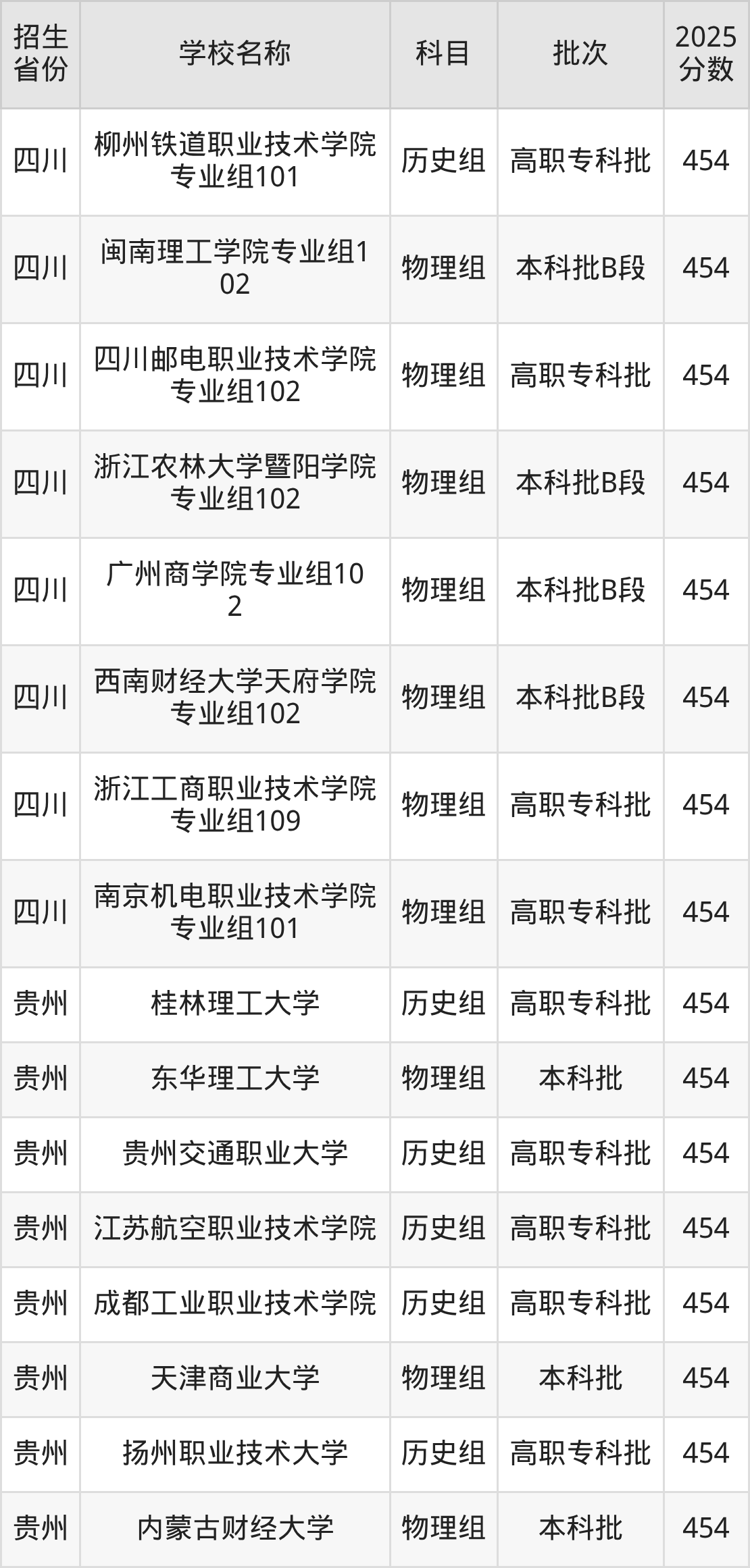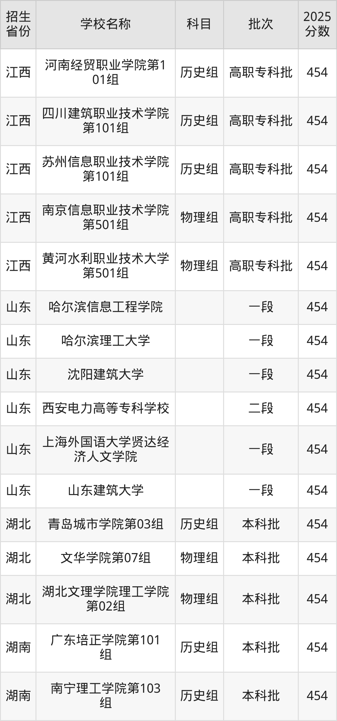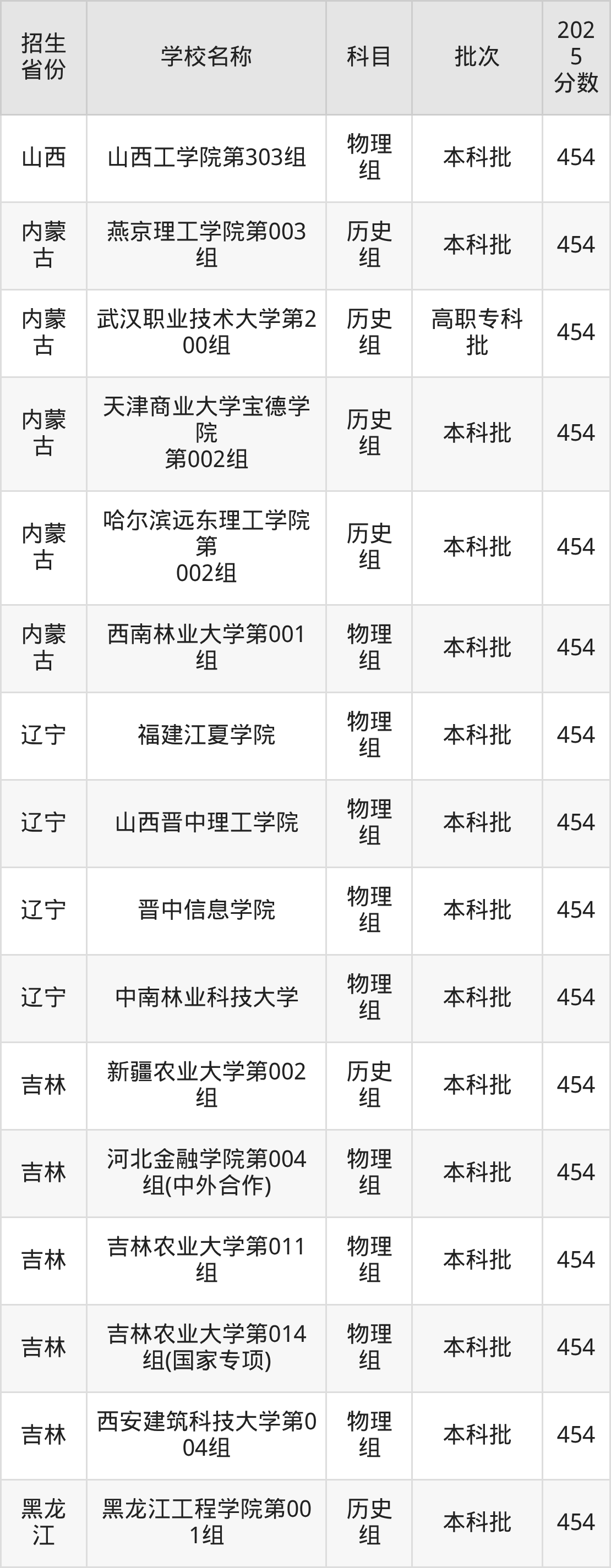 筛选全国各省2025年录取分数线为454分的理科大学如下: