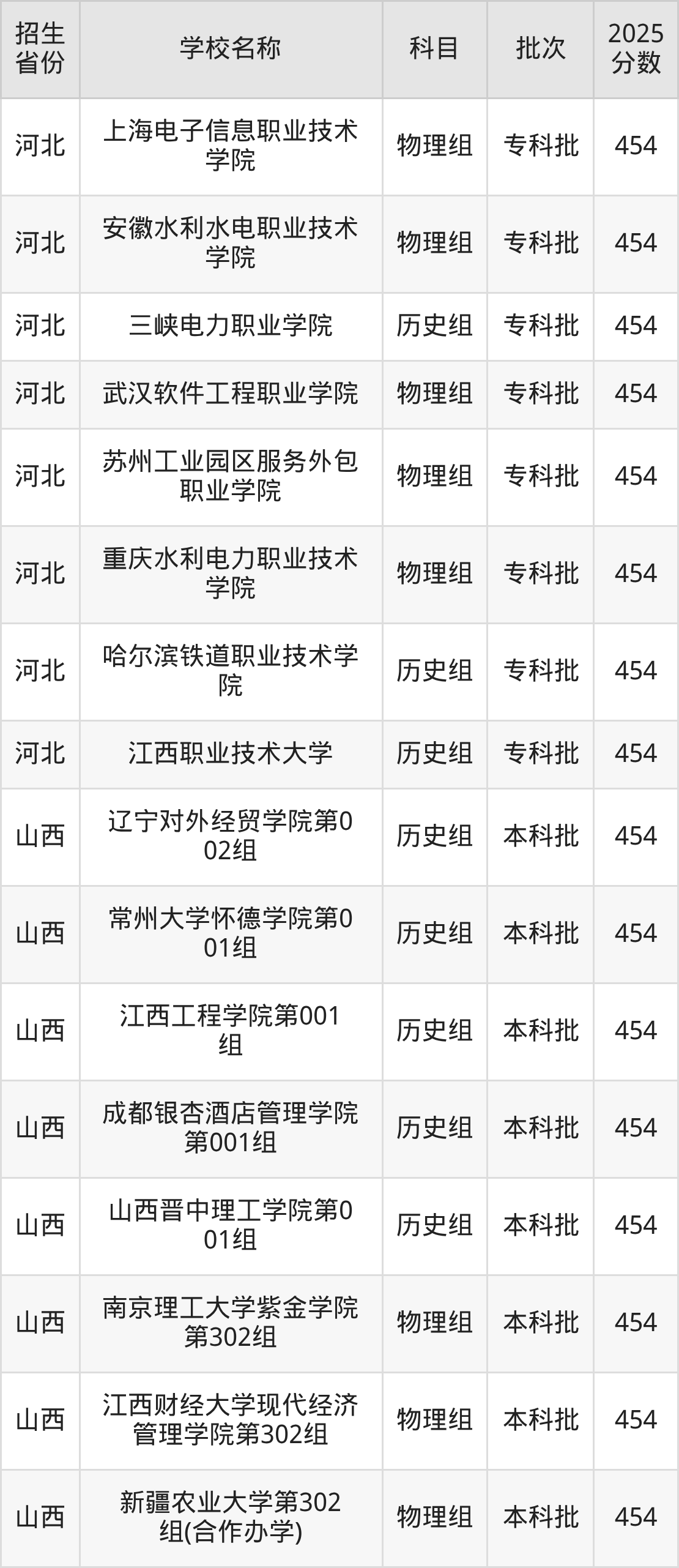 河北省历史组分数线是454分的理科大学有:成都航空职业技术大学、江西信息应用职业技术学院、三峡电力职业学院、哈尔滨铁道职业技术学院、江西职业技术大学。