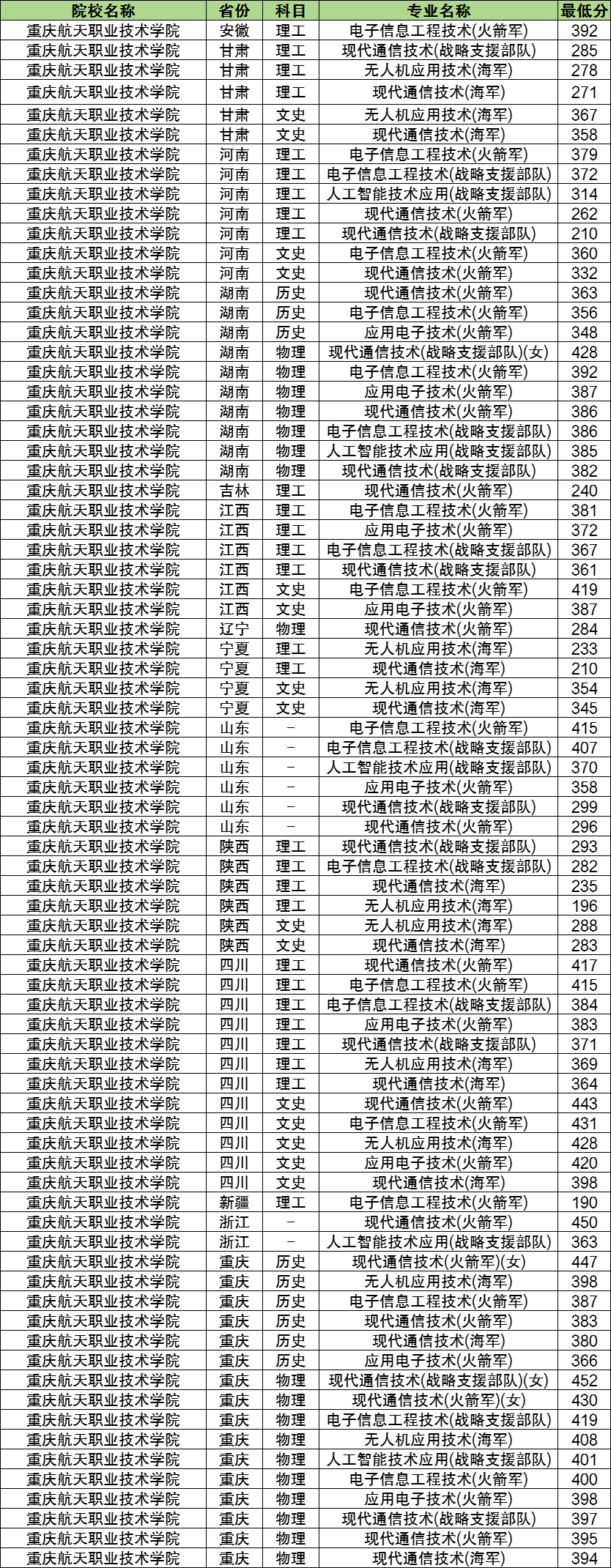 重庆航天职业技术学院作为重庆市内士官直招学校之一,很多同学关心重庆航天职业技术学院士官多少分才能录取,以及重庆航天职业技术学院直招军士有哪些专业等。直招士官也叫直招军士,本期将介绍重庆航天职业技术学院直招军士的各省各专业分数线。