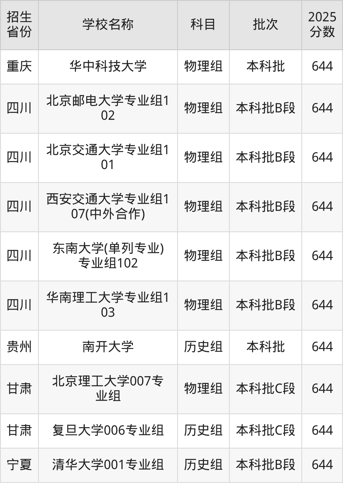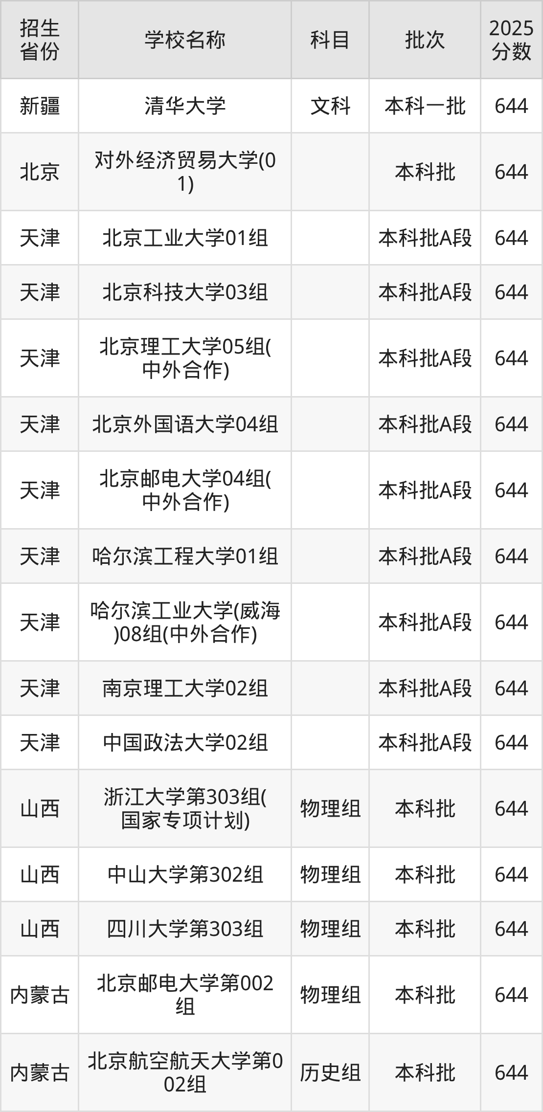 二、各省644分的211大学名单