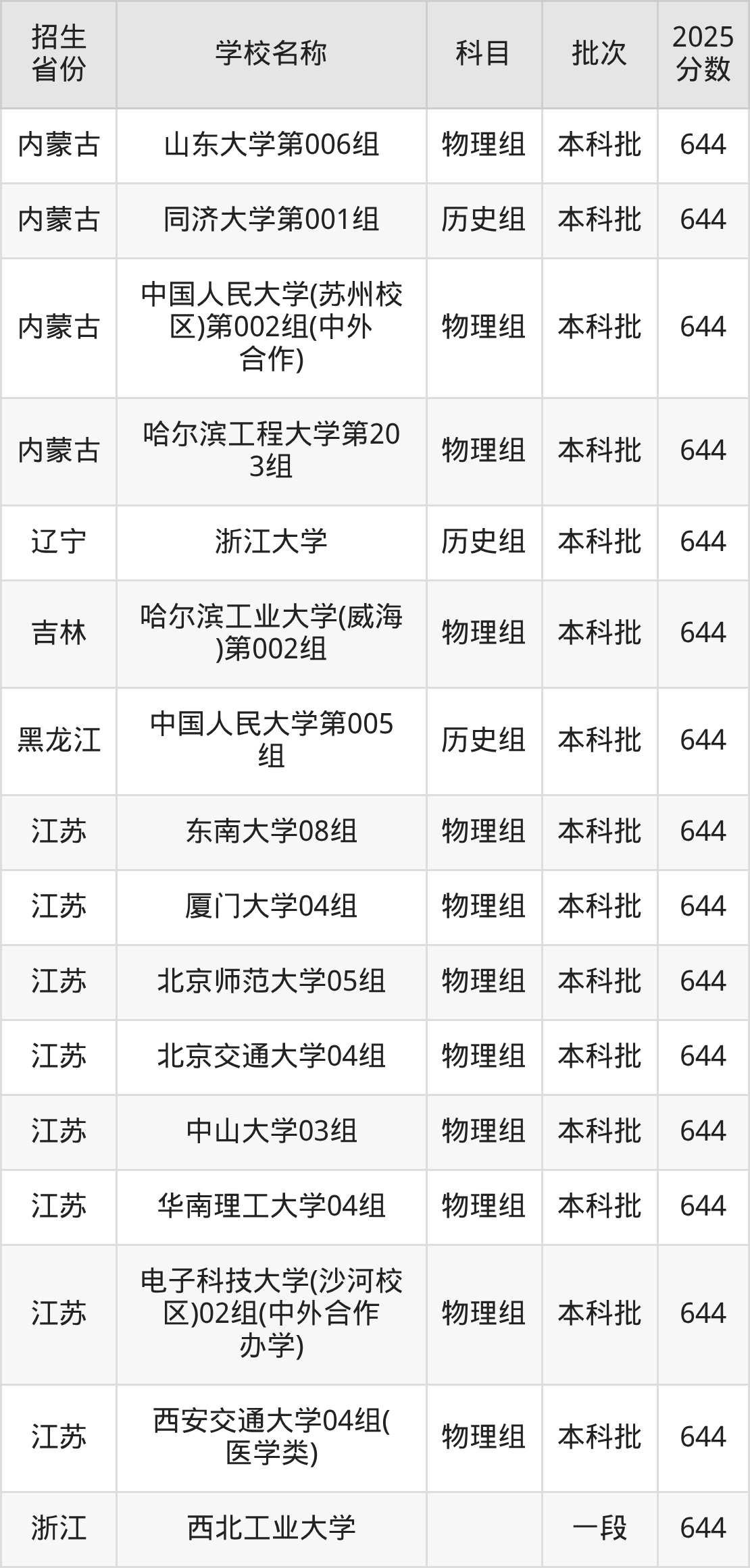 筛选全国各省2025年录取分数线为644分的211大学如下: