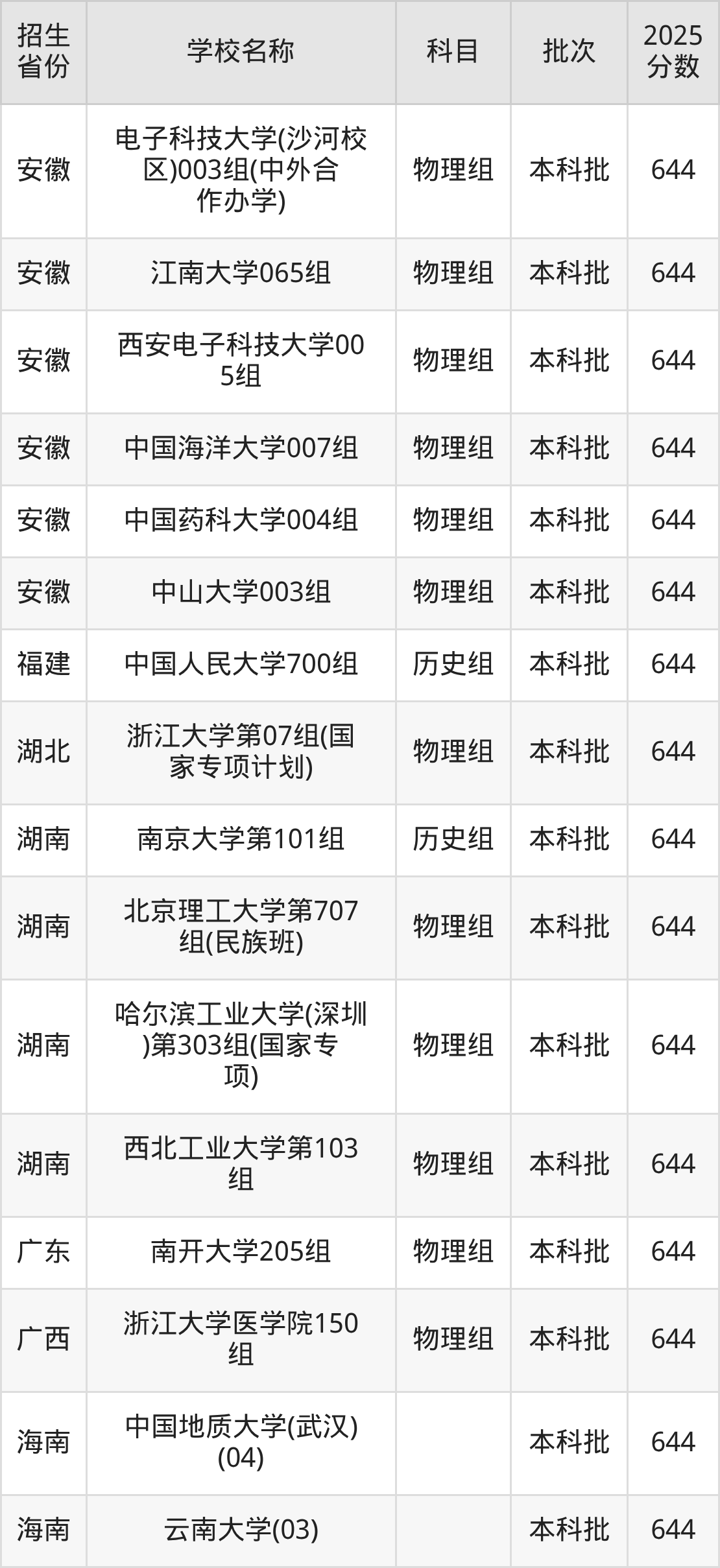湖南省历史组分数线是644分的211大学有:南京大学。