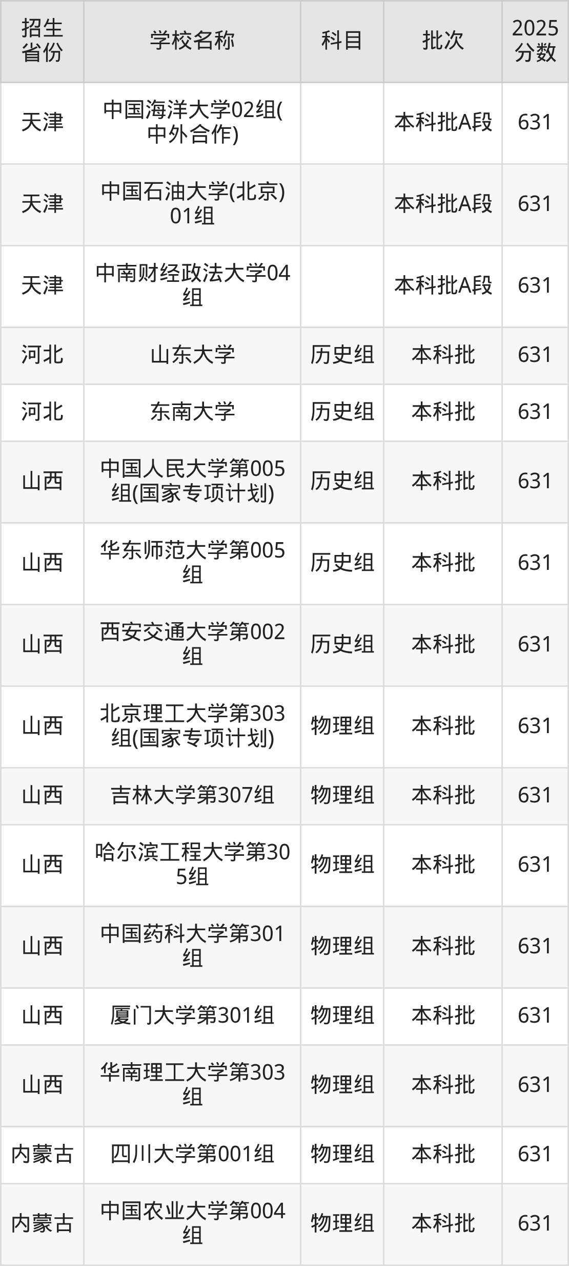 山西省历史组分数线是631分的211大学有:中国人民大学、华东师范大学、西安交通大学。
