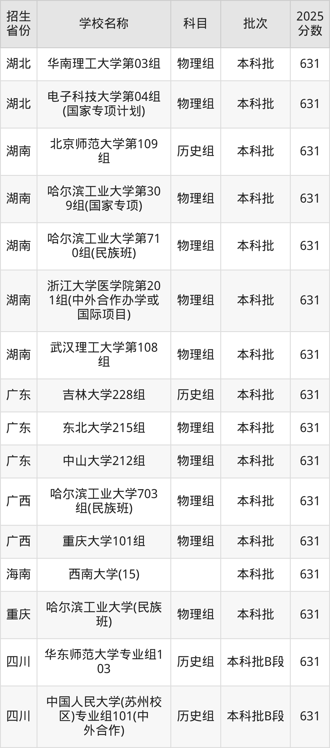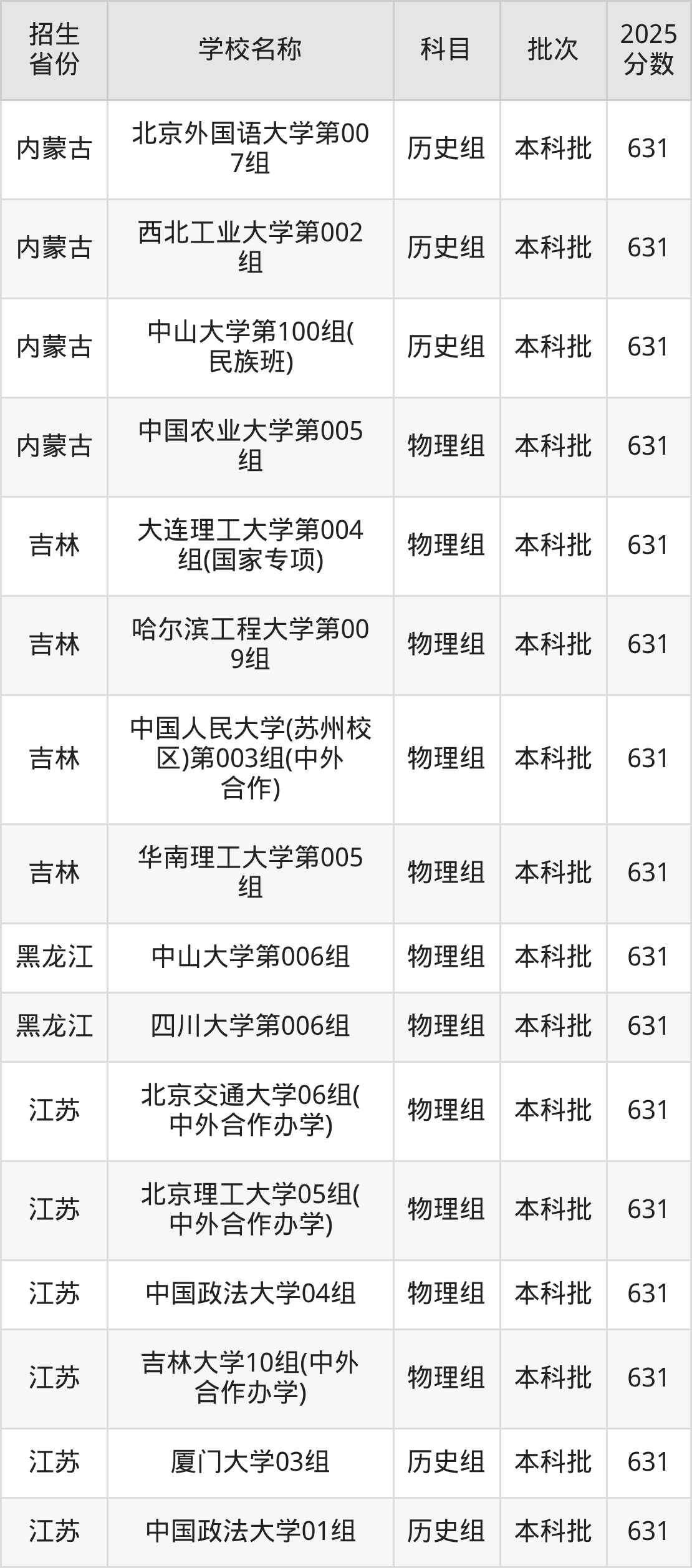 筛选全国各省2025年录取分数线为631分的211大学如下: