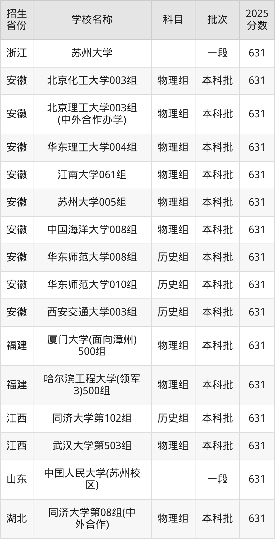 安徽省物理组分数线是631分的211大学有:北京化工大学、北京理工大学、华东理工大学、江南大学、苏州大学、中国海洋大学。