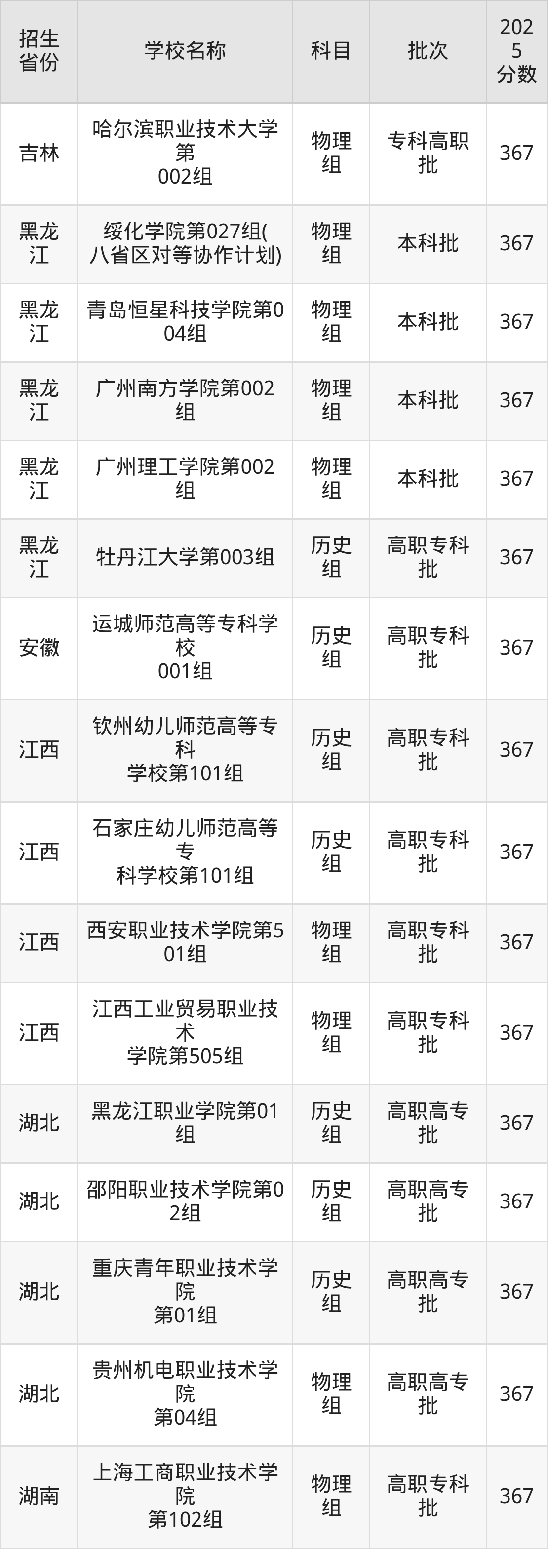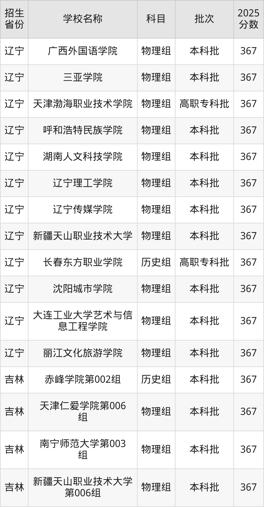 辽宁省历史组分数线是367分的文科大学有:长春东方职业学院。