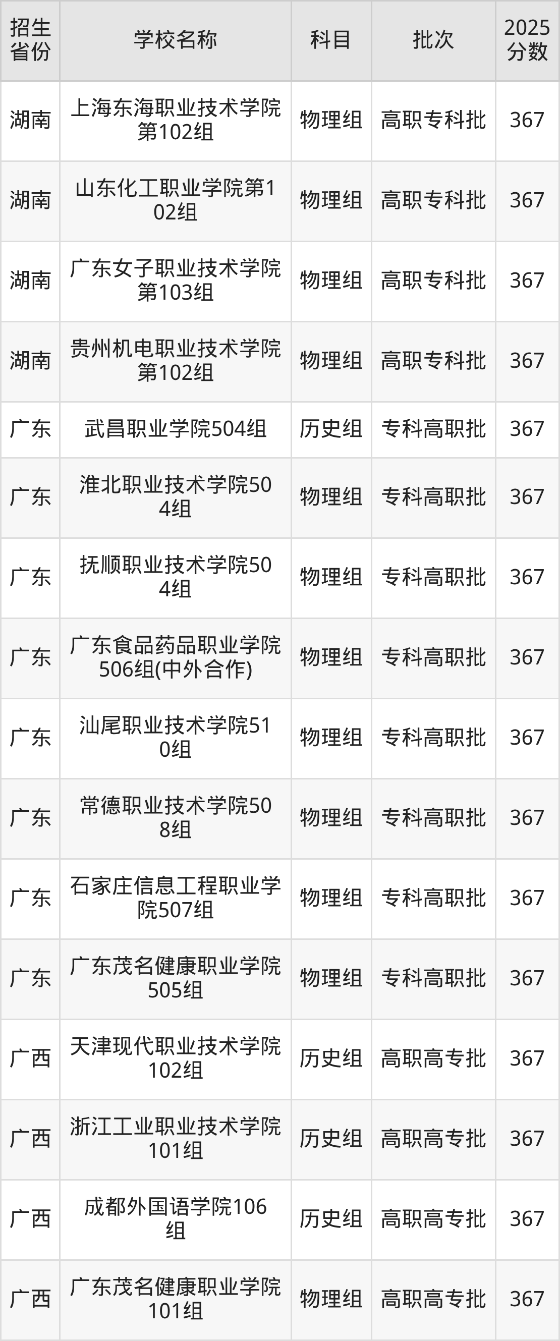 广东省历史组分数线是367分的文科大学有:武昌职业学院。