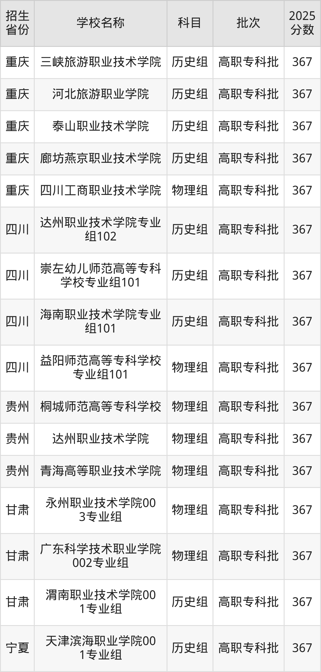 重庆市历史组分数线是367分的文科大学有:三峡旅游职业技术学院、河北旅游职业学院、泰山职业技术学院、廊坊燕京职业技术学院。