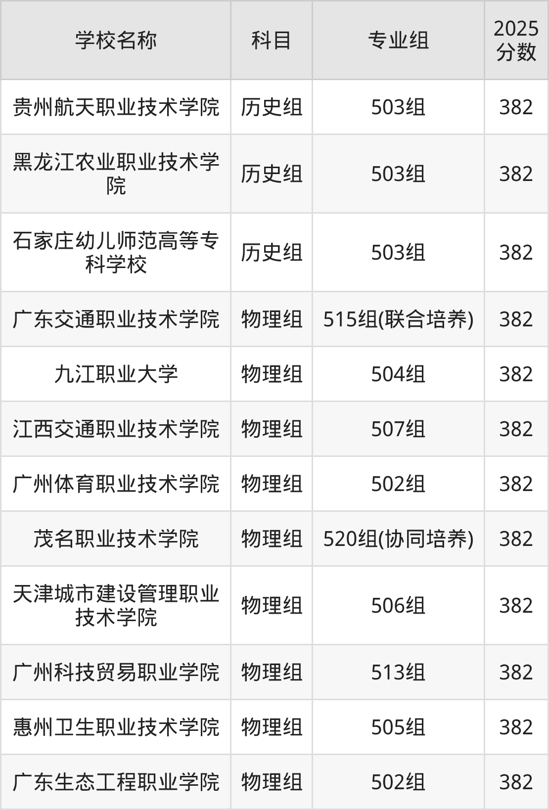 广东高考录取分数线在382分左右的公办院校专业组一共有12个,其中历史组有:贵州航天职业技术学院(382分)、黑龙江农业职业技术学院(382分)、石家庄幼儿师范高等专科学校(382分),物理组有:广东交通职业技术学院(382分)、九江职业大学(382分)、江西交通职业技术学院(382分)。