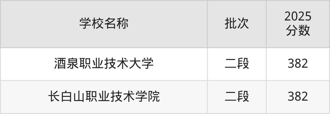 山东高考录取分数线在382分左右的公办大学一共有2所。分别是酒泉职业技术大学(382分)、长白山职业技术学院(382分)