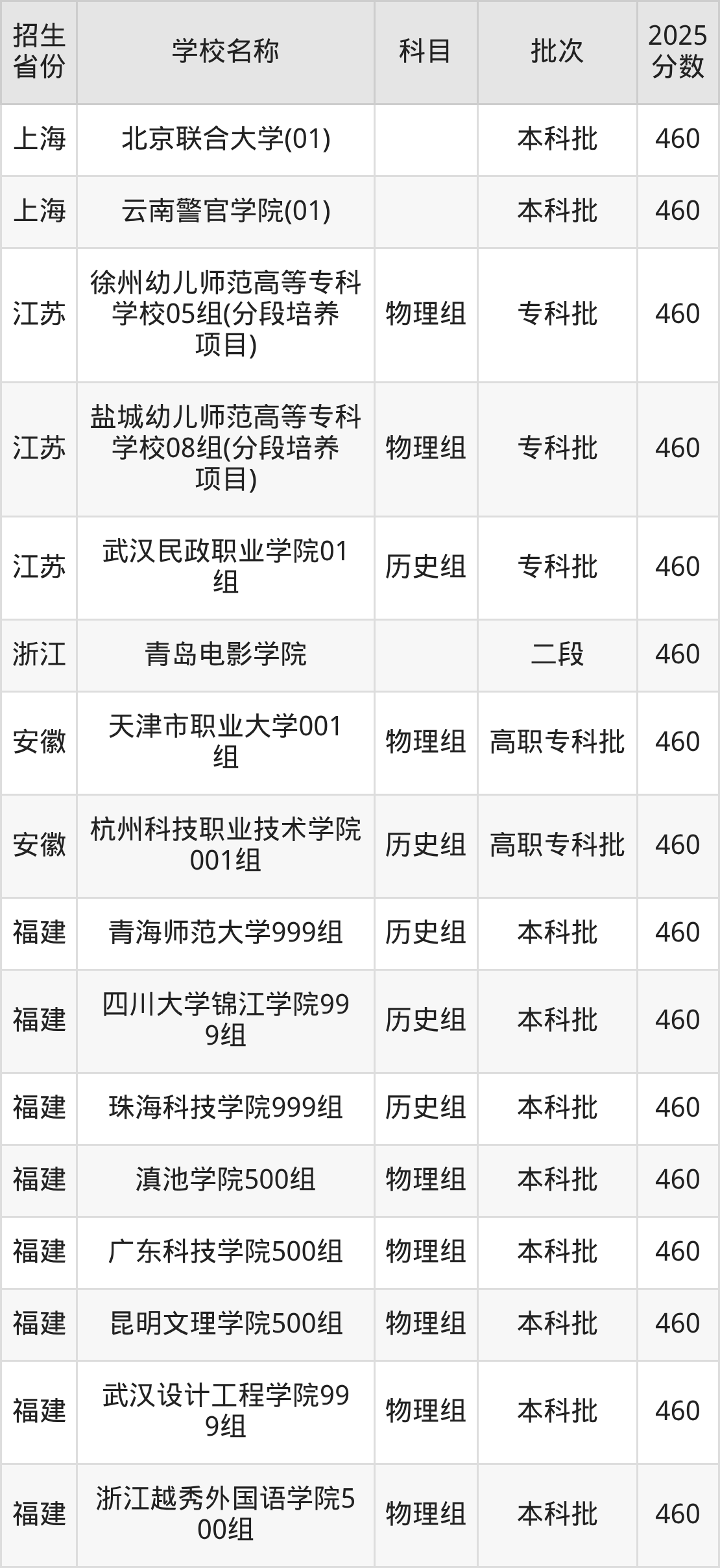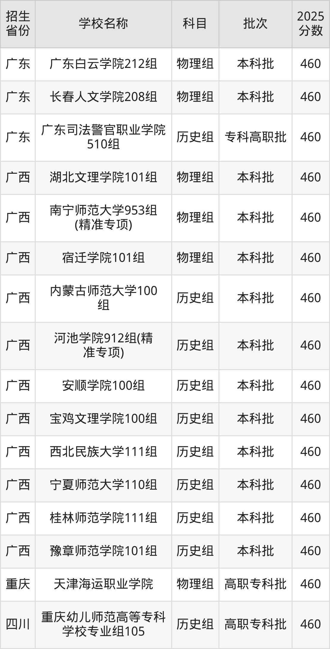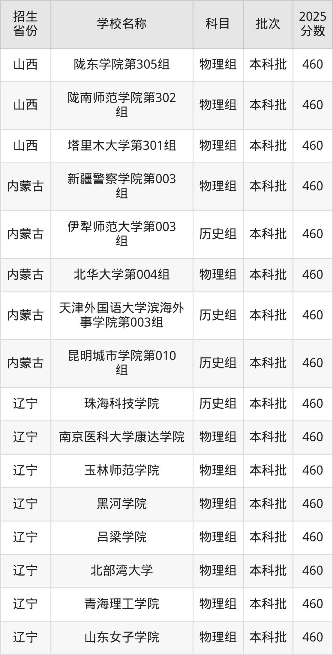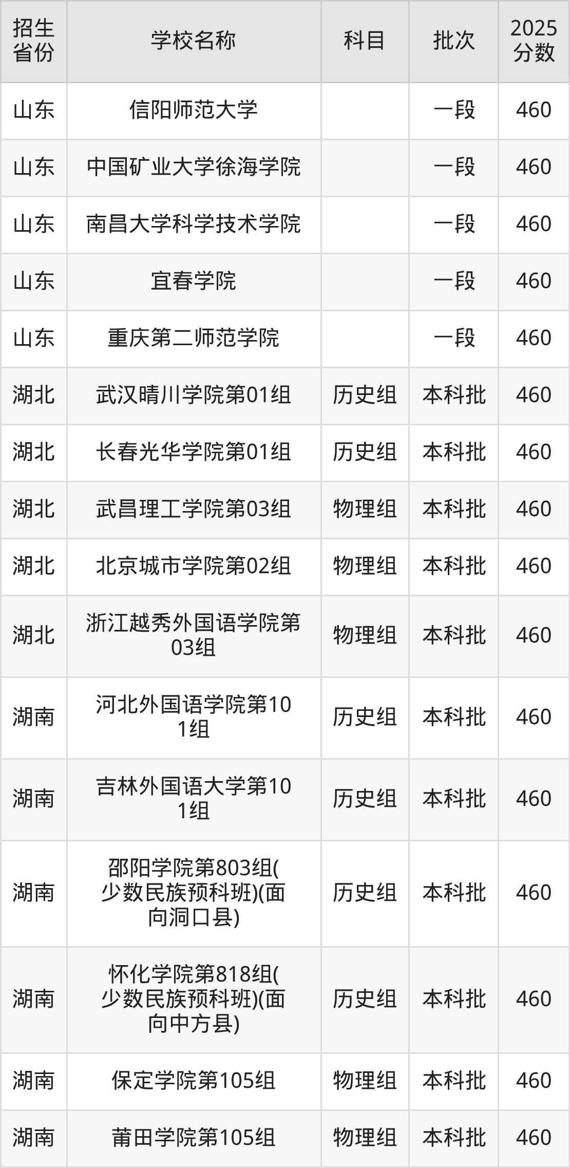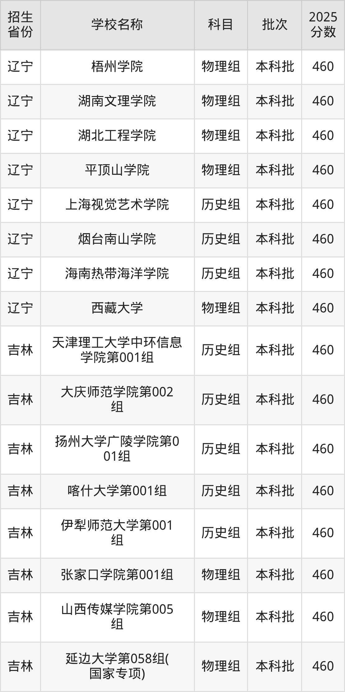 筛选全国各省2025年录取分数线为460分的文科大学如下: