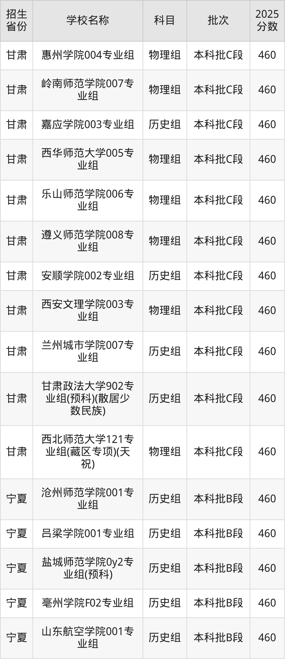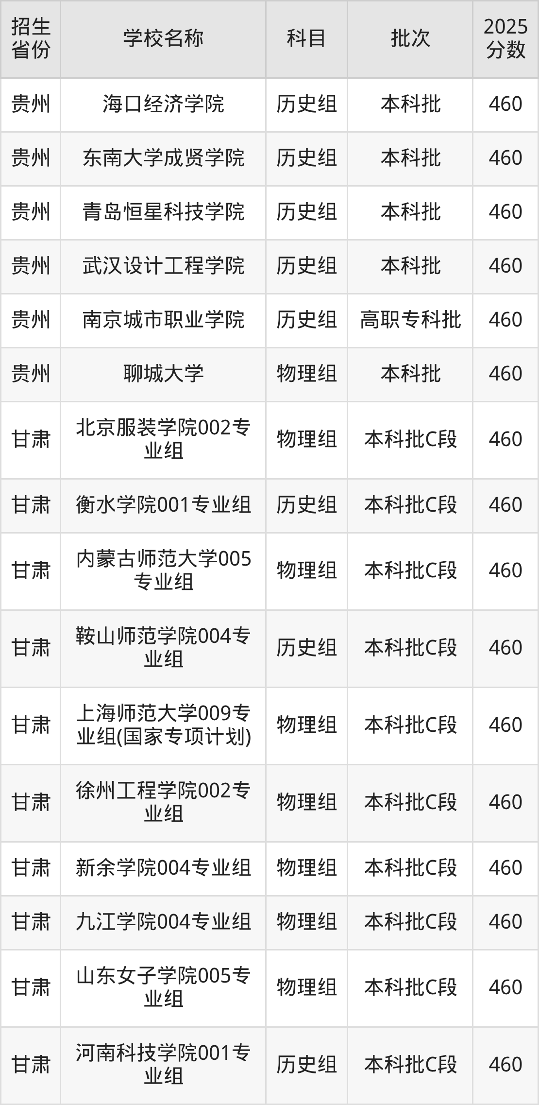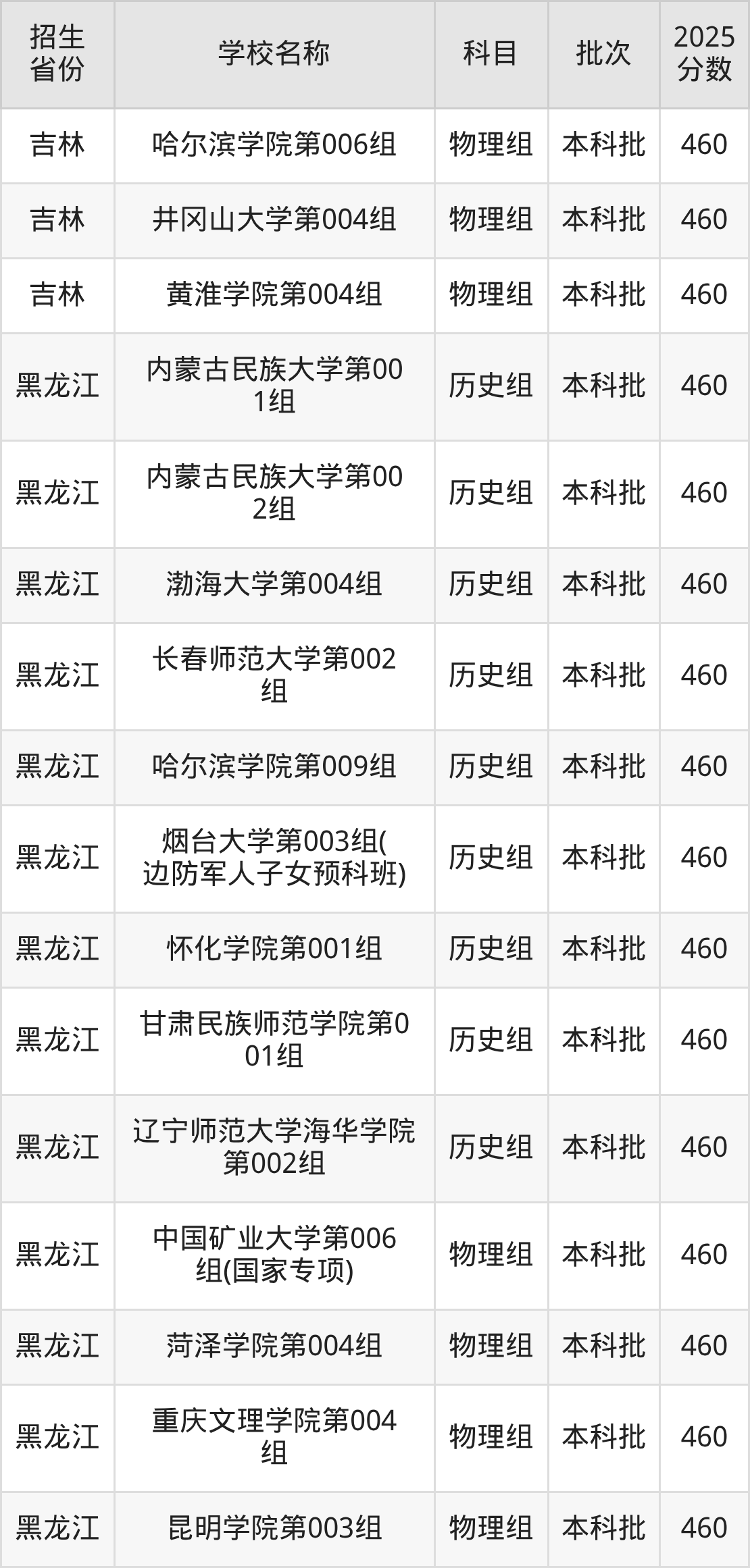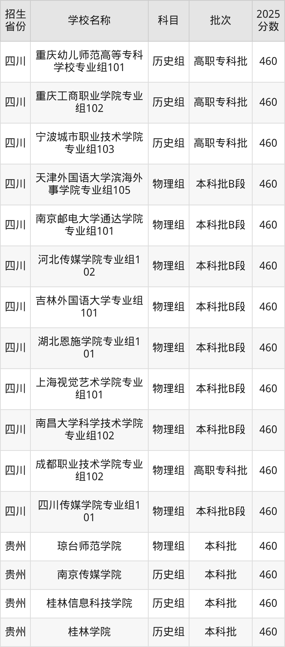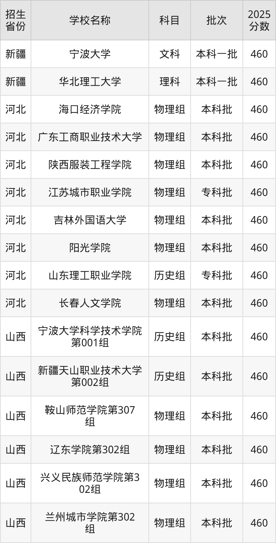 筛选全国各省2025年录取分数线为460分的文科大学如下: