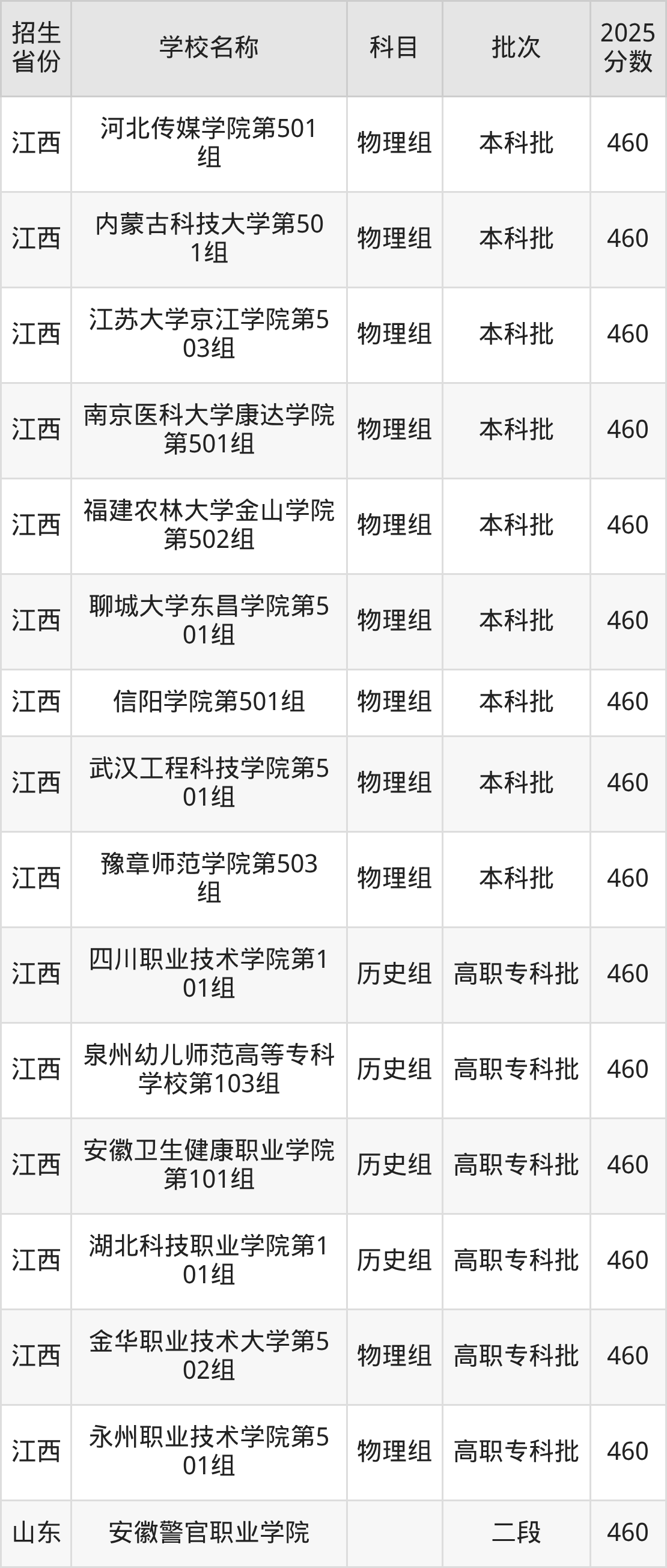 江西省物理组分数线是460分的文科大学有:河北传媒学院、内蒙古科技大学、江苏大学京江学院、南京医科大学康达学院、福建农林大学金山学院、聊城大学东昌学院、信阳学院、武汉工程科技学院、豫章师范学院、金华职业技术大学。